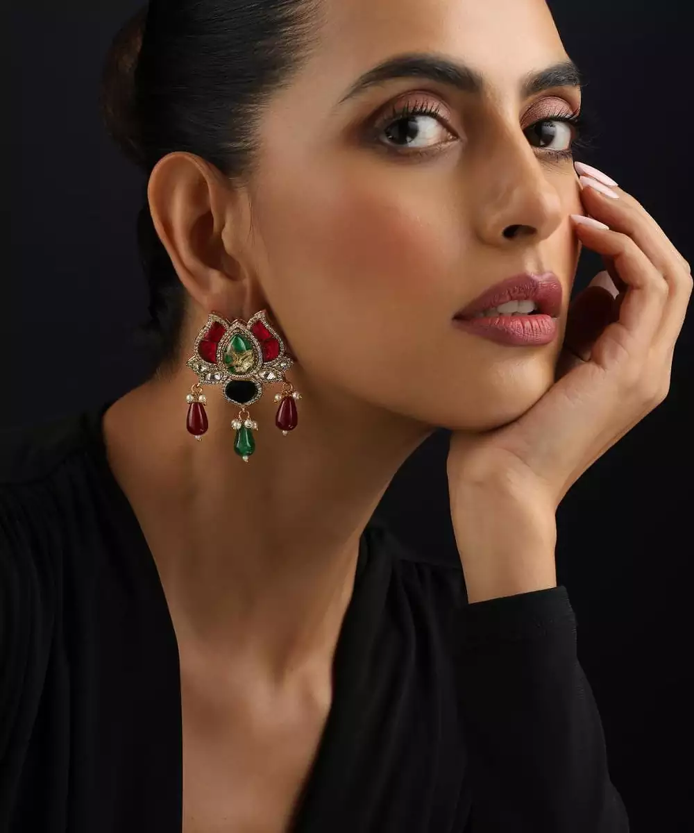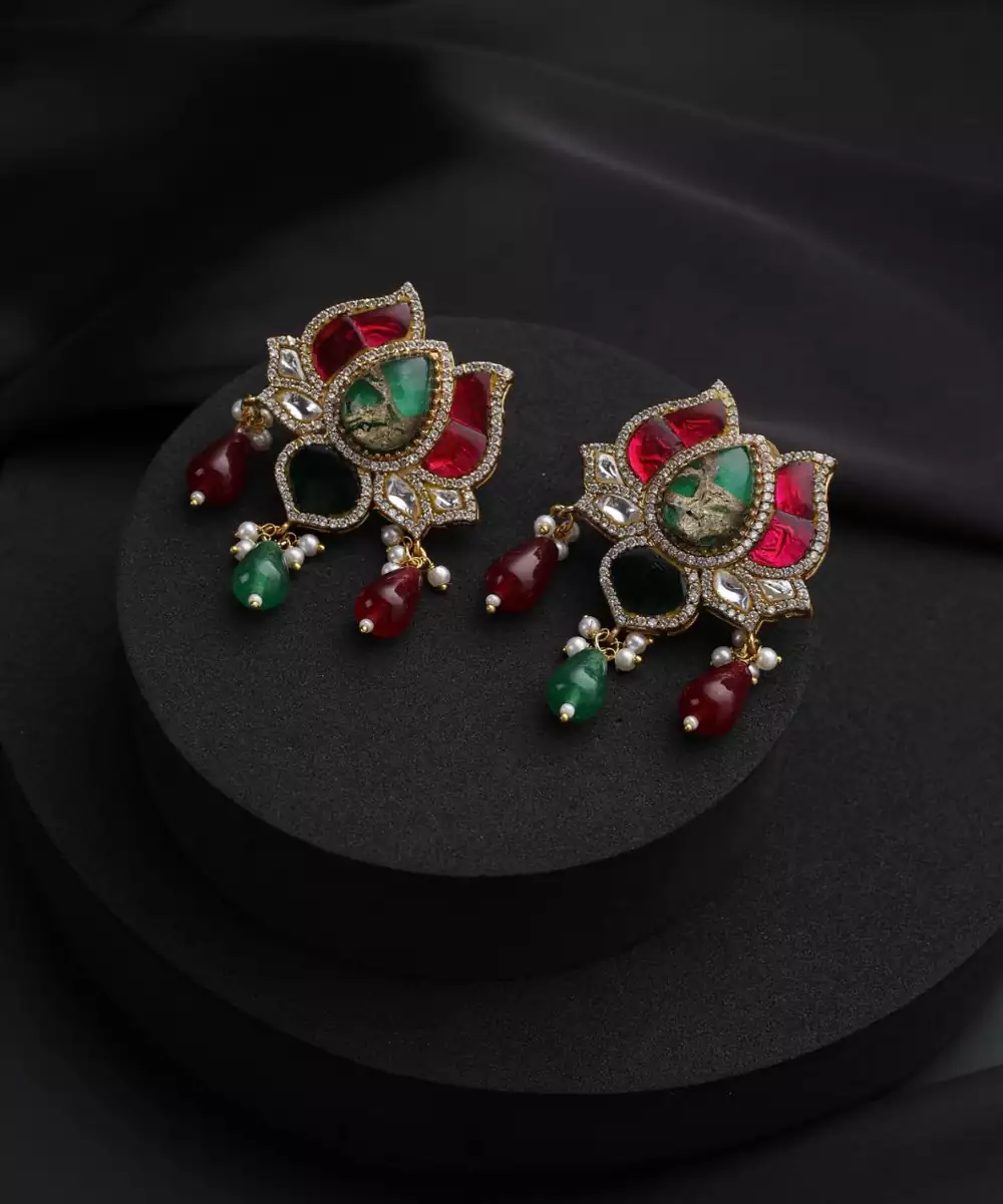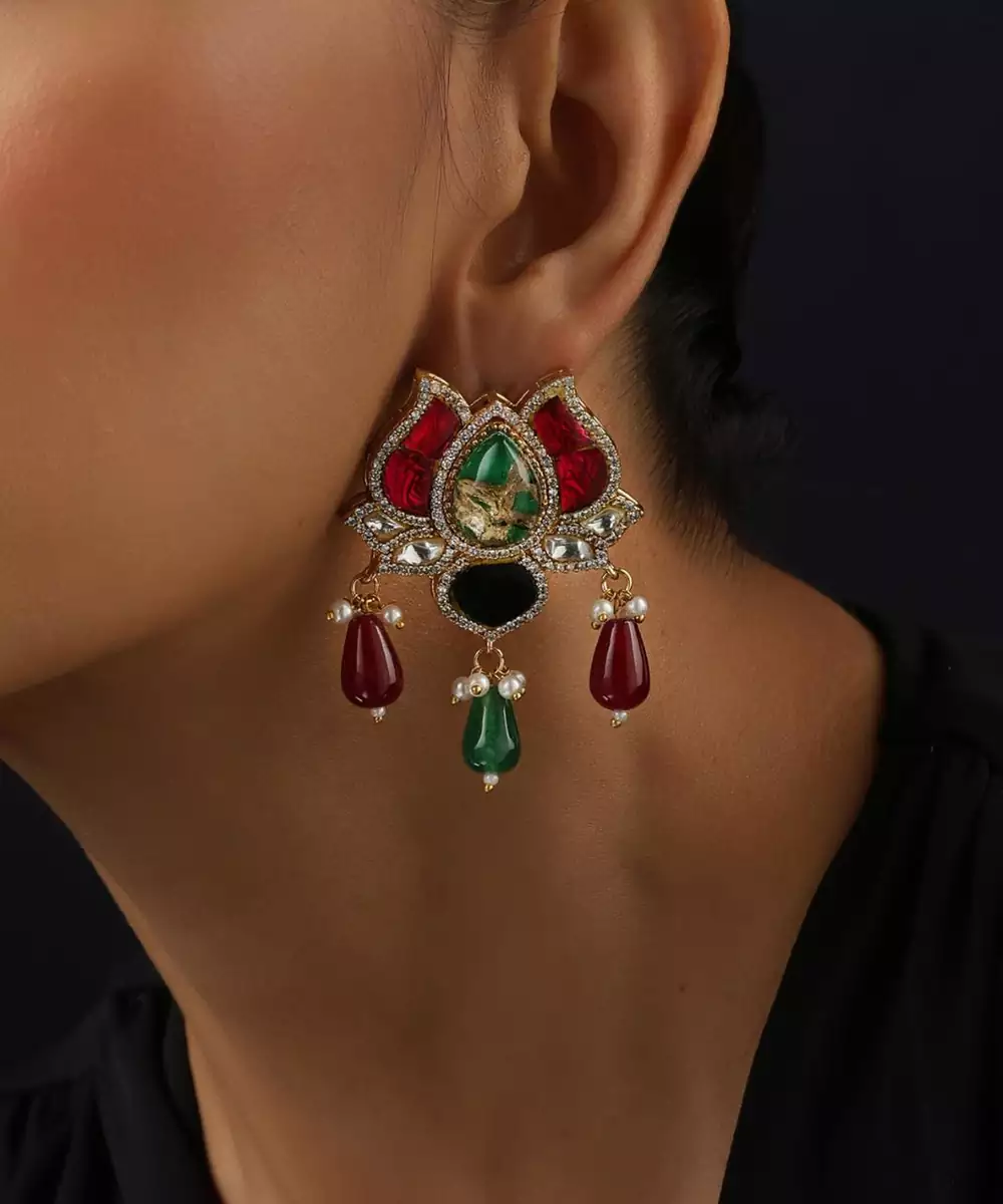 These Gold Plated Multicolour Polki Dangler Earrings Are A Stunning Blend Of Elegance And Festivity. Featuring Intricate Polki Work Adorned With Vibrant Coloured Stones, They Are Finished With Rich Gold Plating For A Luxurious Touch. Perfect For Weddings, Festive Occasions, And Celebrations, They Complement Both Traditional And Contemporary Outfits Beautifully.