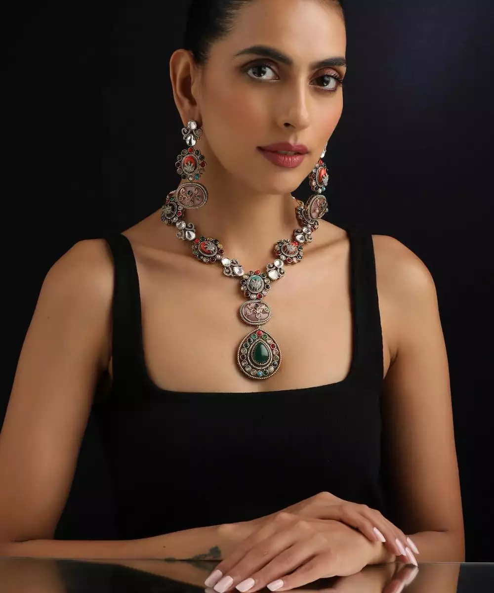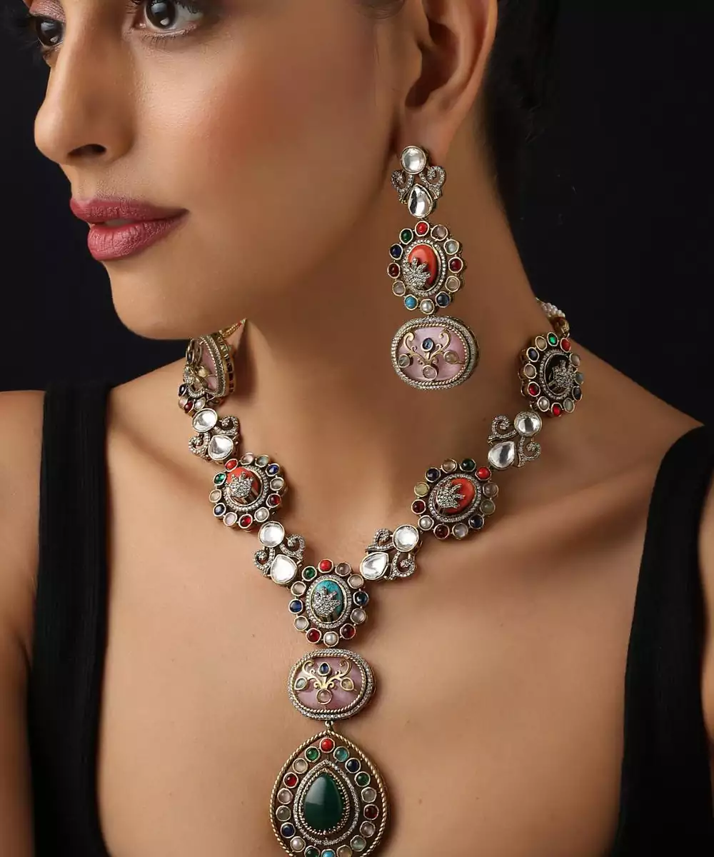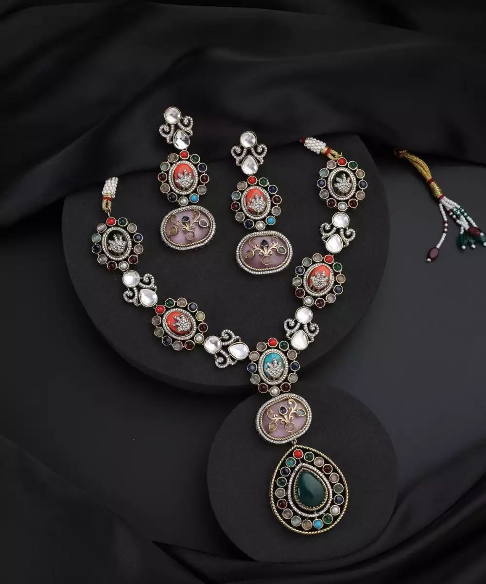 This Gold Plated Multicolour Polki Necklace Set Exudes Festive Elegance And Royal Charm. Featuring Intricate Polki Work Adorned With Vibrant Coloured Stones, It Is Finished With Luxurious Gold Plating For A Rich Appeal. Perfect For Weddings, Festive Occasions, And Special Celebrations, It Pairs Beautifully With Both Traditional And Fusion Outfits.