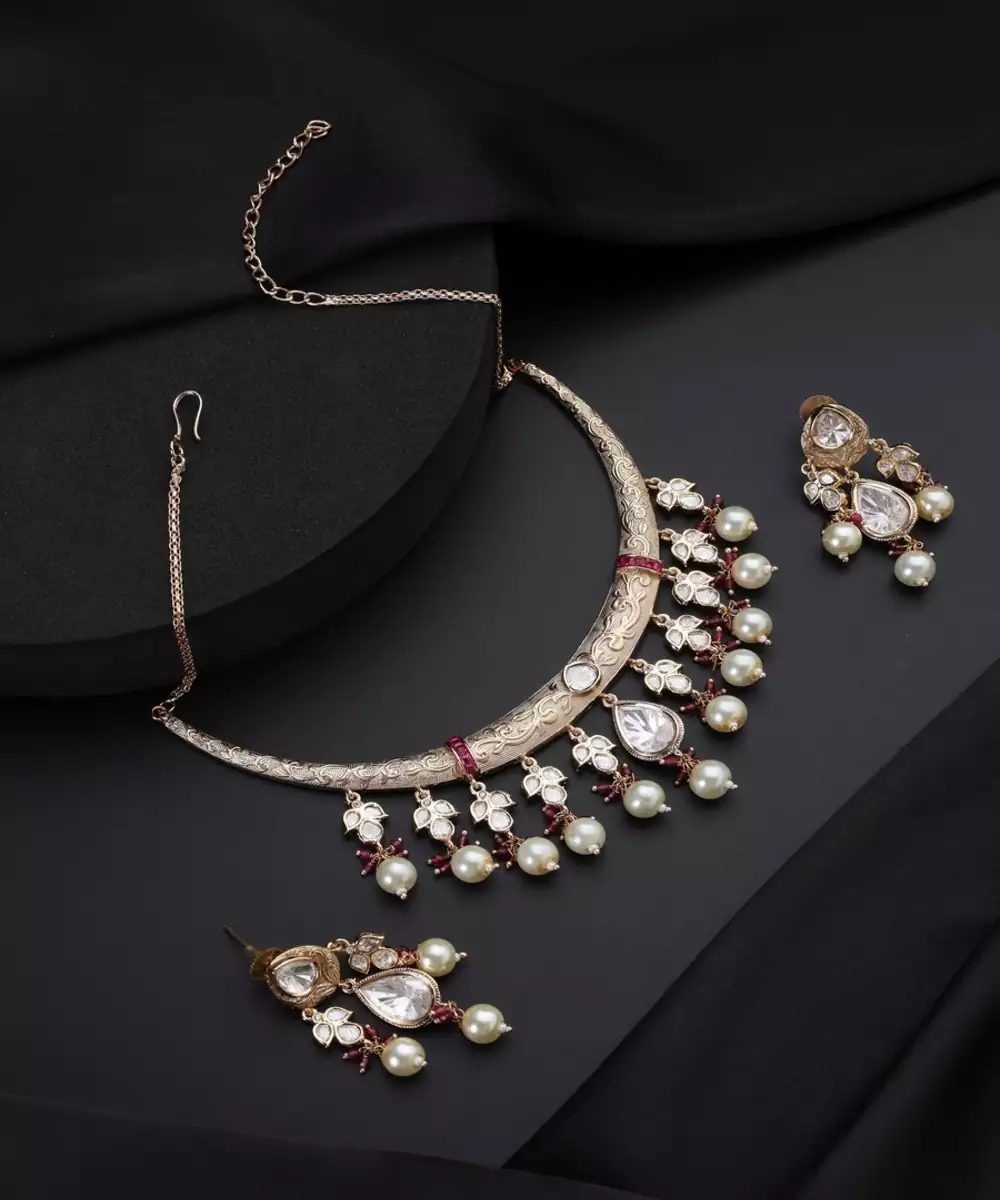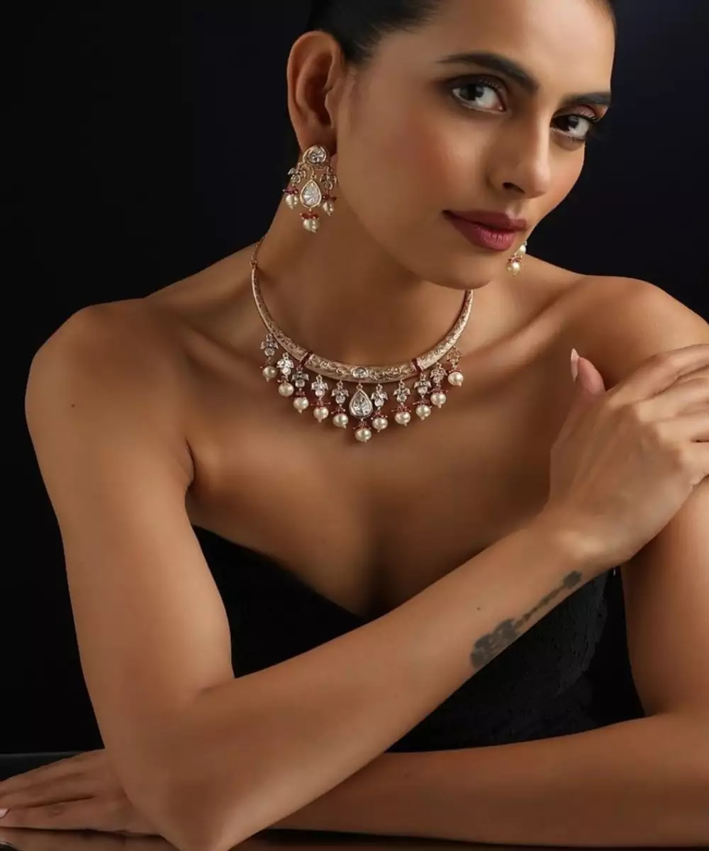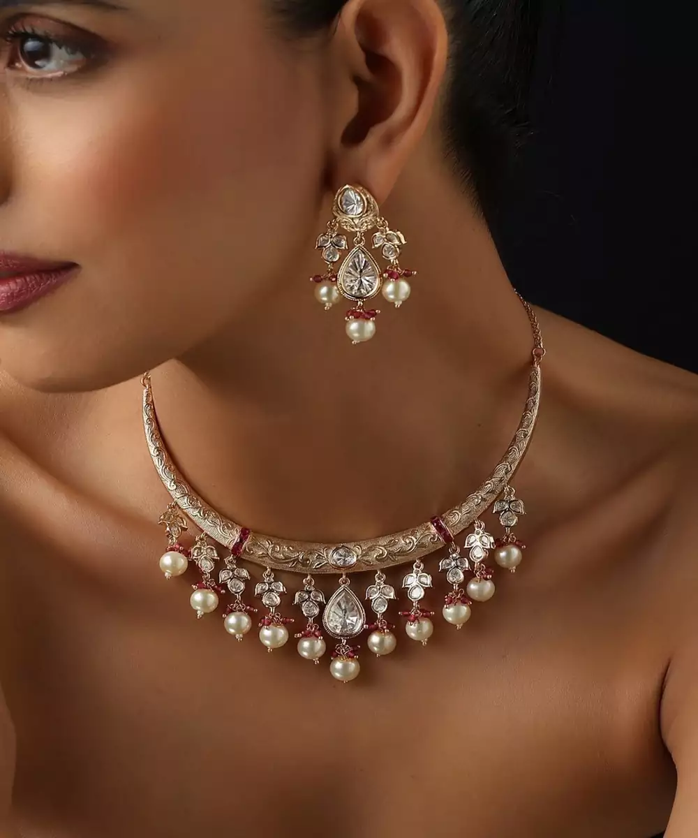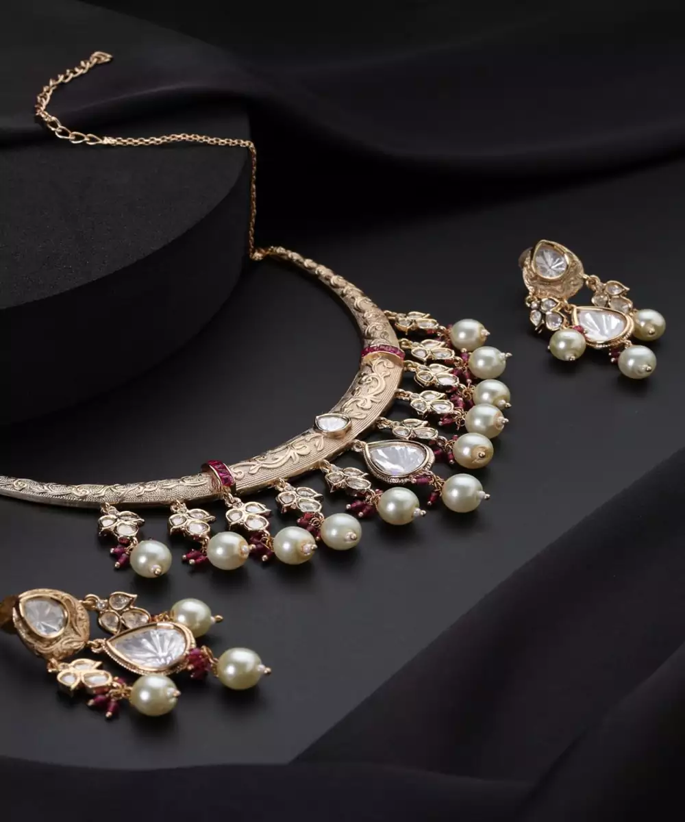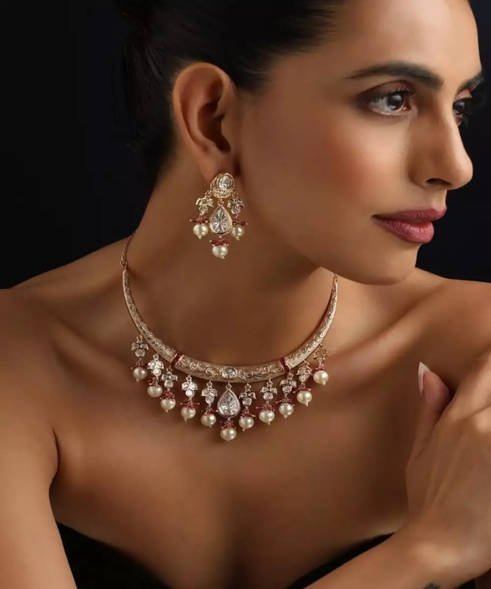 Experience A Touch Of Timeless Elegance With This Stunning Gold Plated Polki Necklace Set. The Intricately Designed Necklace Is Adorned With Beautifully Arranged Uncut Polki Stones, Creating A Rustic Yet Brilliant Sparkle. The Matching Earrings Complete The Look, Making This Set A Luxurious And Traditional Choice For Any Special Occasion