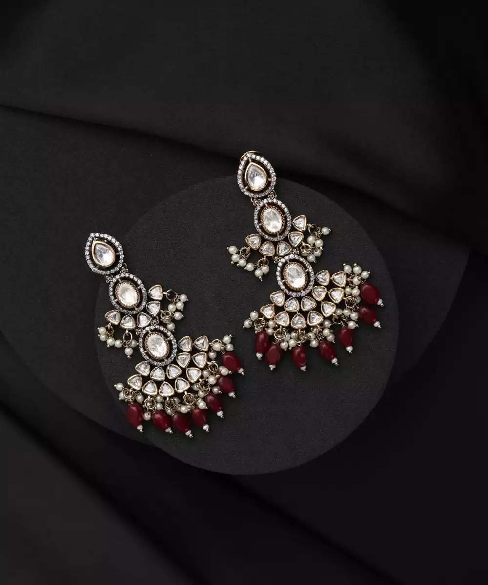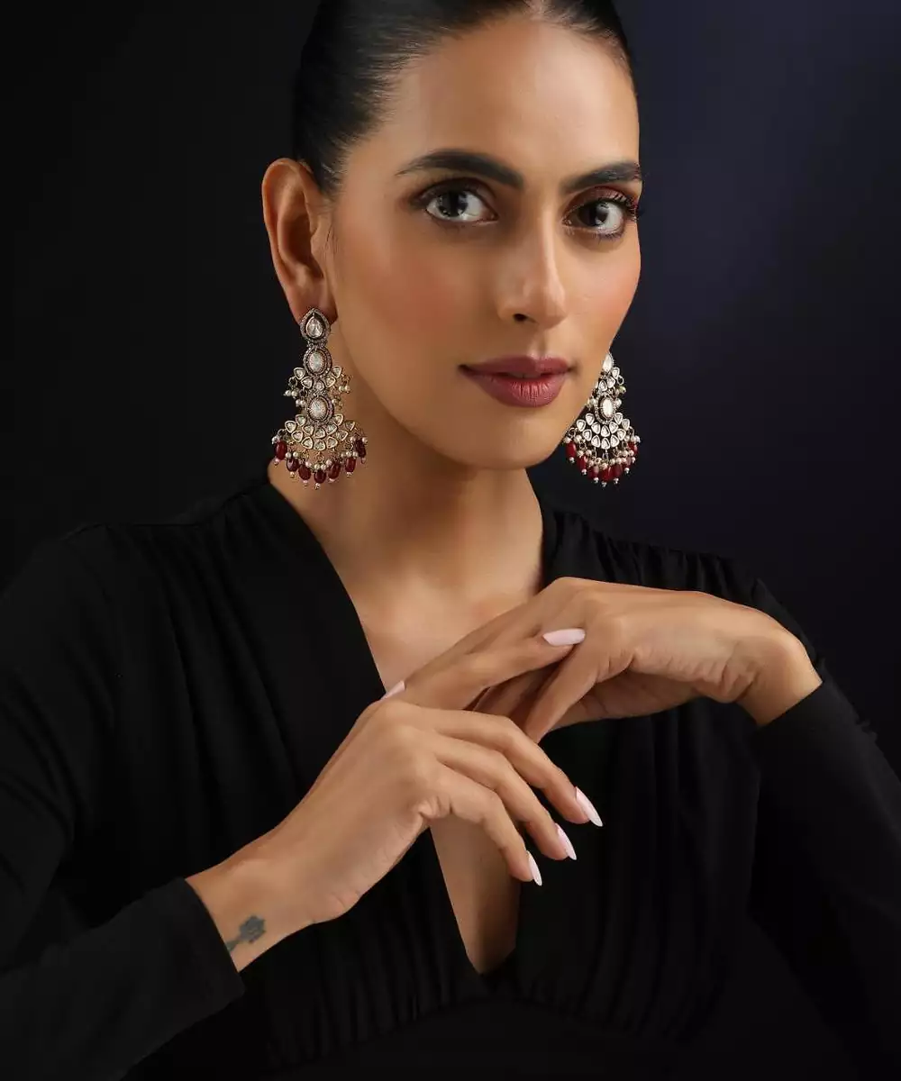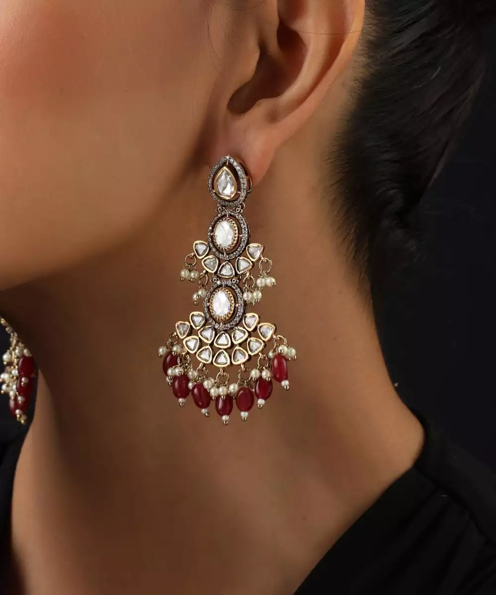These Gold Plated Red Stone Polki Jhumkas Radiate Classic Elegance And Regal Charm. Featuring Intricate Polki Work Accented With Striking Red Stones, They Are Finished With Luxurious Gold Plating For A Rich Appeal. Perfect For Weddings, Festive Occasions, And Cultural Celebrations, They Beautifully Complement Traditional And Fusion Attire.