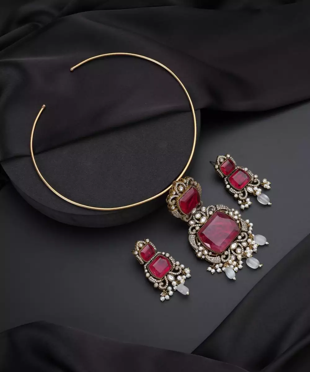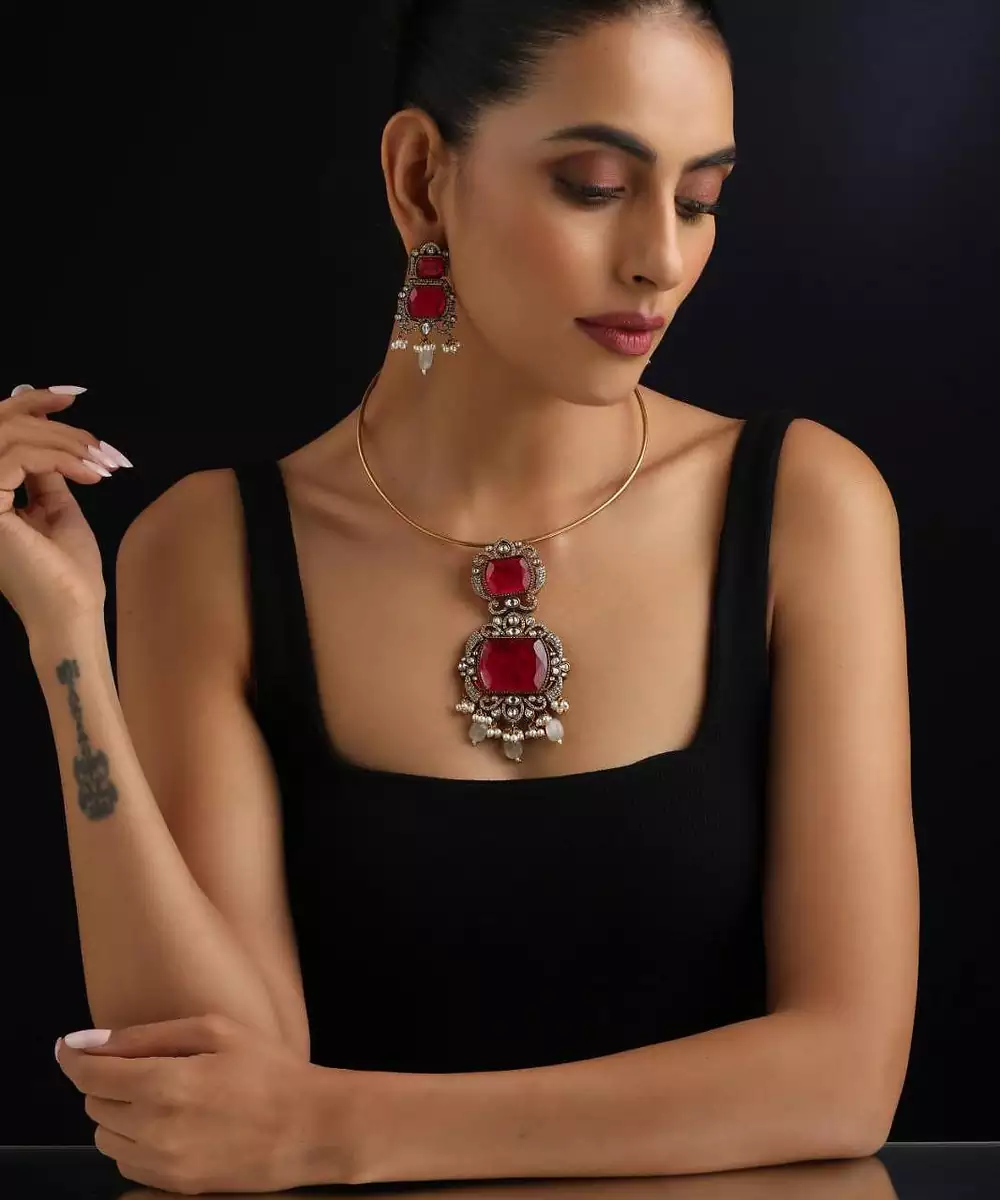 This Gold Plated Red Stone Polki Necklace Exudes Timeless Elegance And Royal Charm. Featuring Intricate Polki Work Accented With Striking Red Stones, It Is Finished With Luxurious Gold Plating For A Rich Appeal. Perfect For Weddings, Festive Occasions, And Special Celebrations, It Pairs Beautifully With Both Traditional And Fusion Outfits.