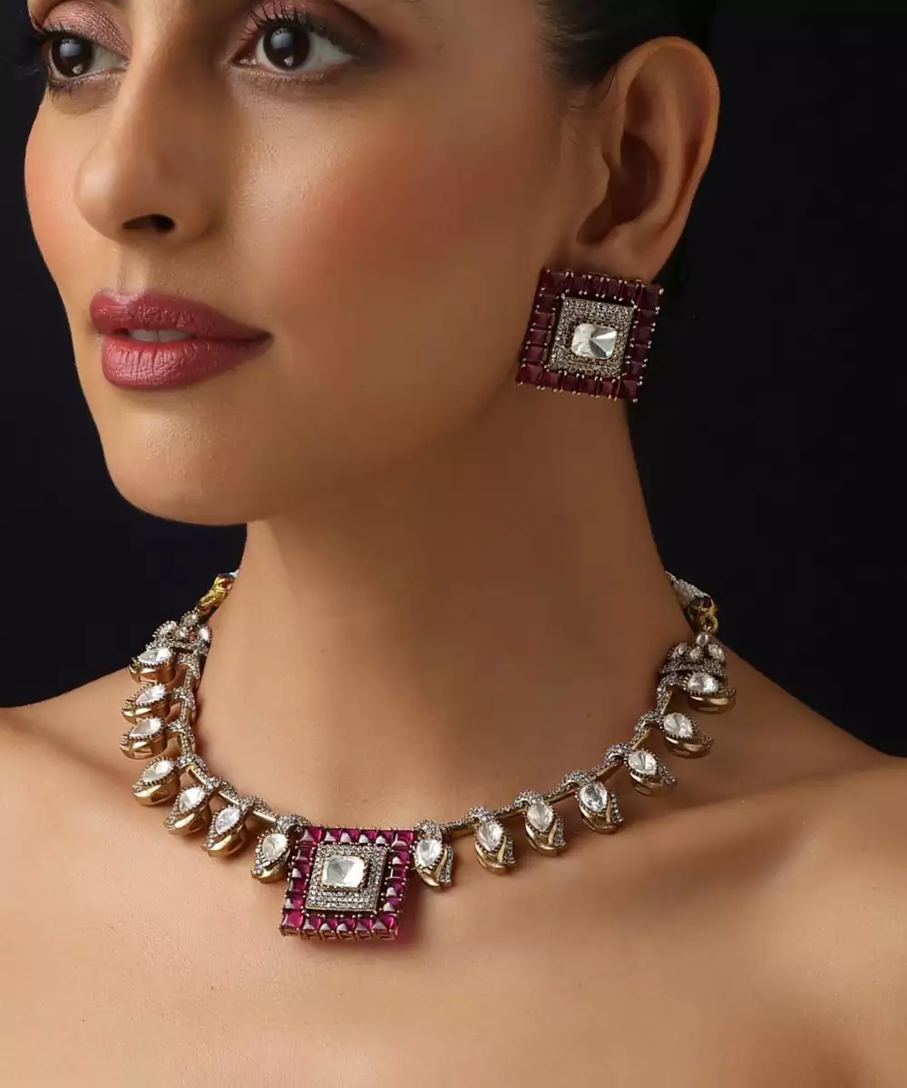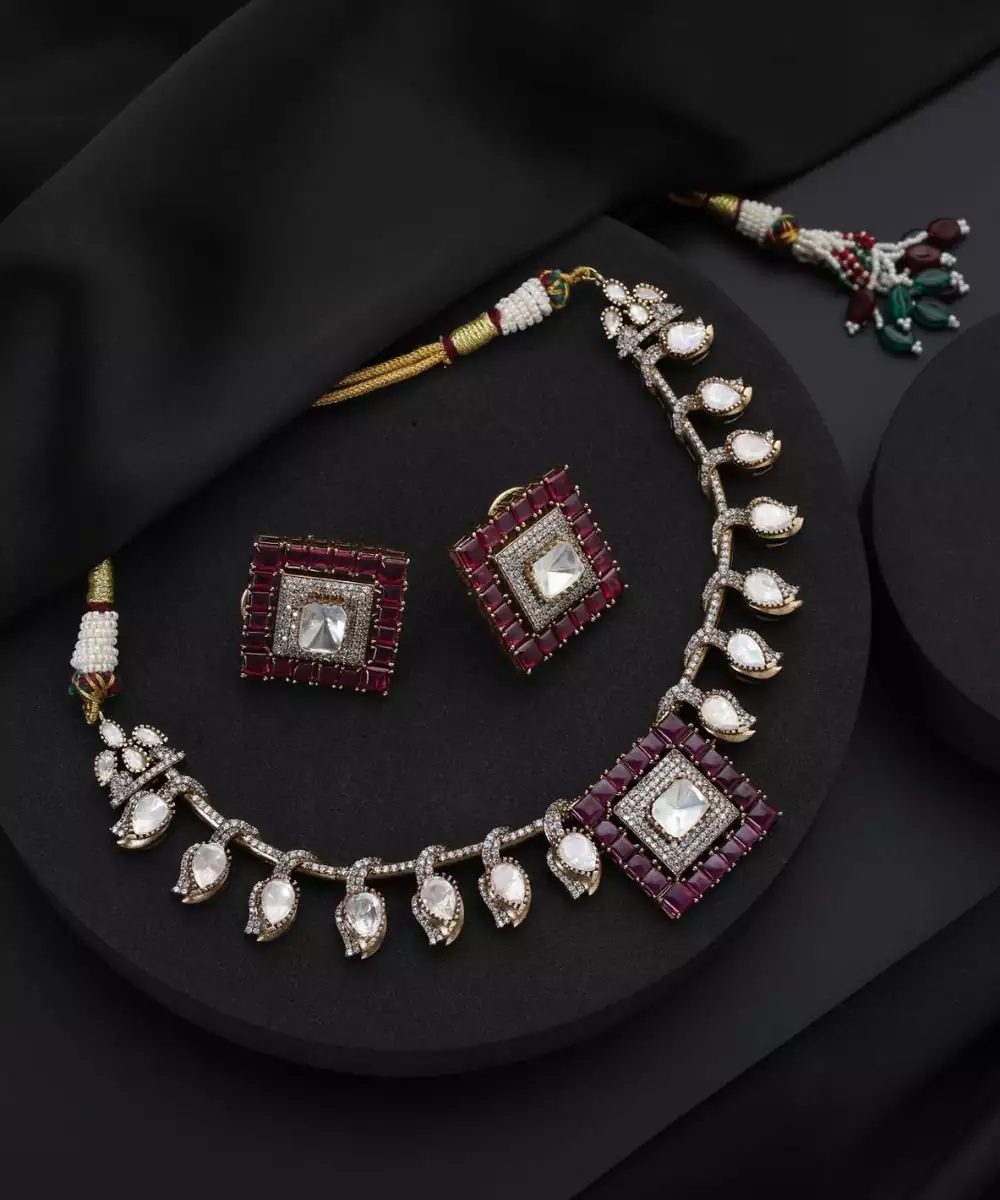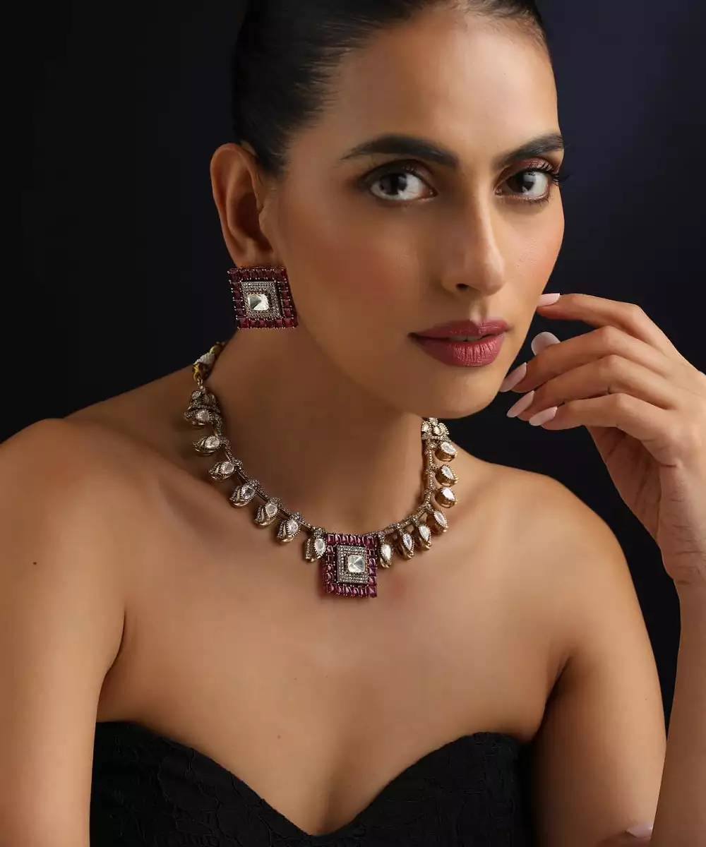 This Gold Plated Red Stone Polki Necklace Exudes Timeless Elegance And Royal Charm. Featuring Intricate Polki Work Accented With Striking Red Stones, It Is Finished With Luxurious Gold Plating For A Rich Appeal. Perfect For Weddings, Festive Occasions, And Special Celebrations, It Pairs Beautifully With Both Traditional And Fusion Outfits.