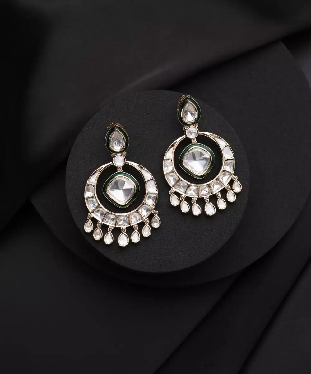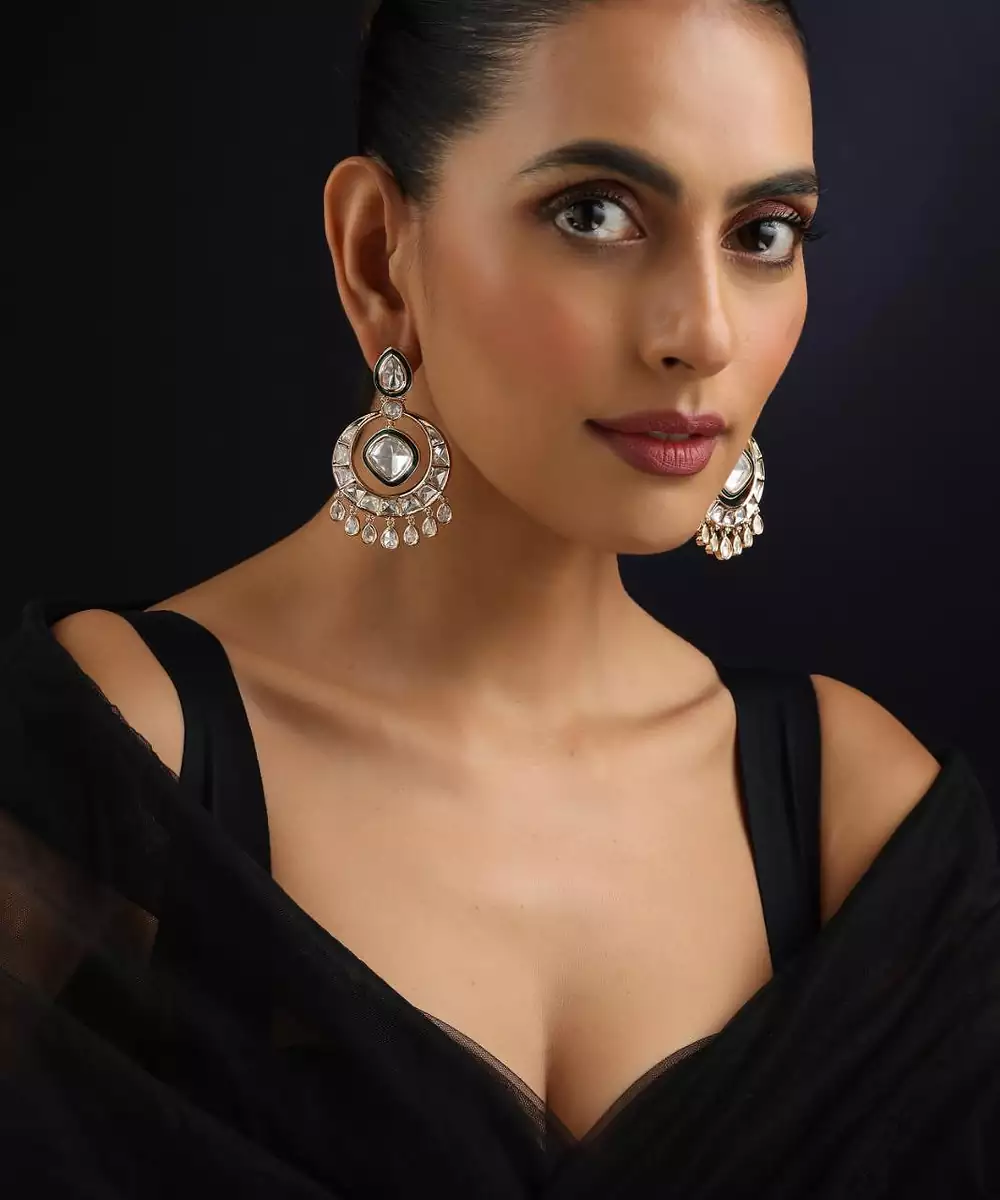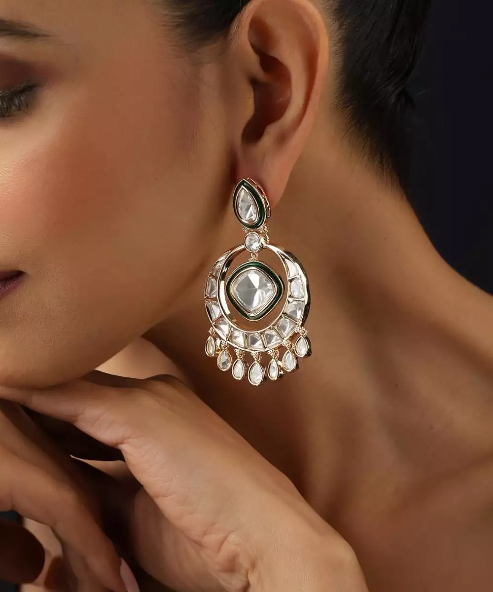 These Gold Plated Silver Polki Chandbalis Exude Timeless Elegance And Royal Charm. Crafted With Intricate Polki Work On A Silver Base And Finished With Rich Gold Plating, They Offer A Luxurious Appeal. Perfect For Weddings, Festive Occasions, And Cultural Celebrations, They Beautifully Complement Traditional Outfits With Their Graceful And Classic Design.