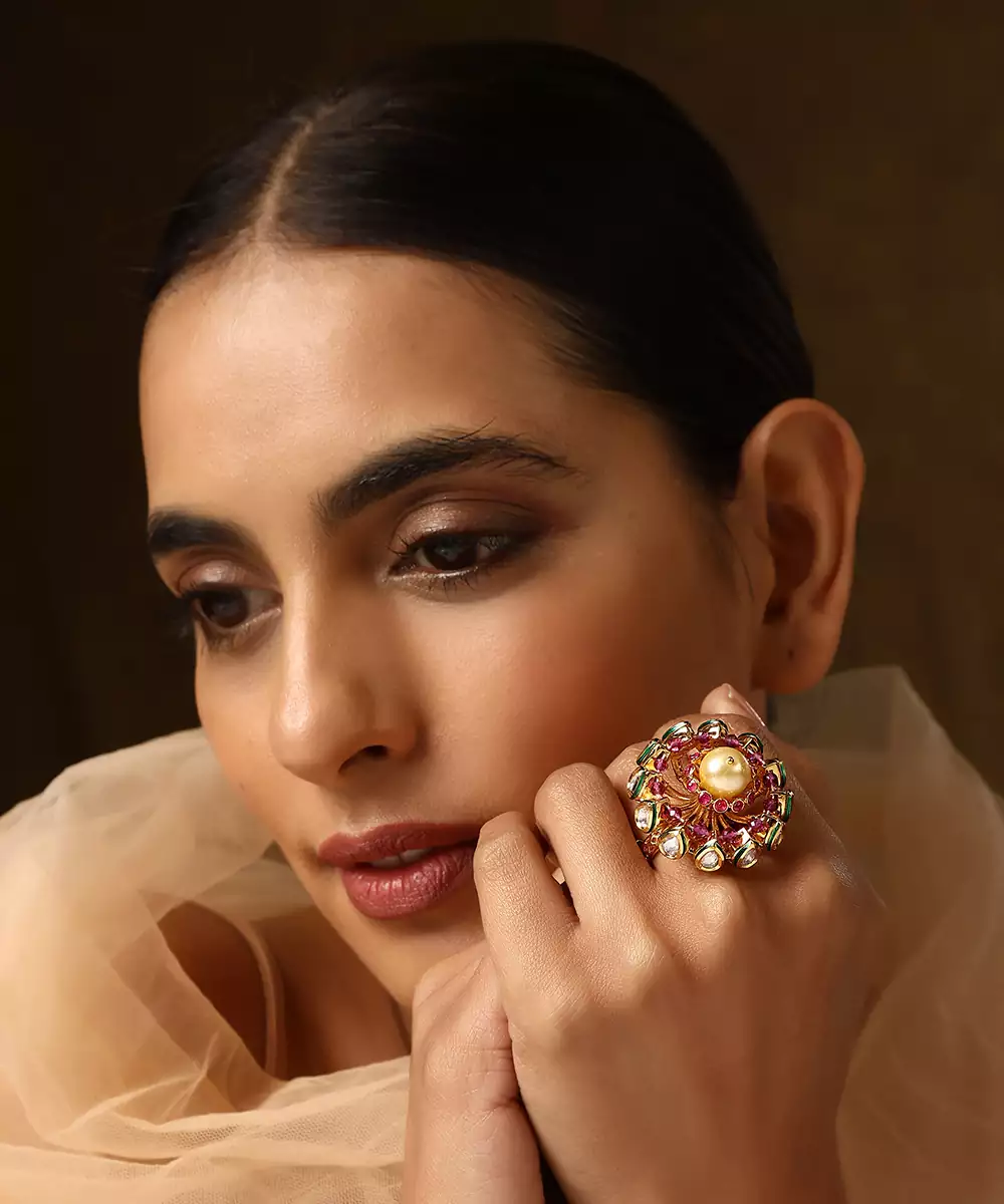 Red Gold Tone Kundan Ring Material : Brass Color : Red