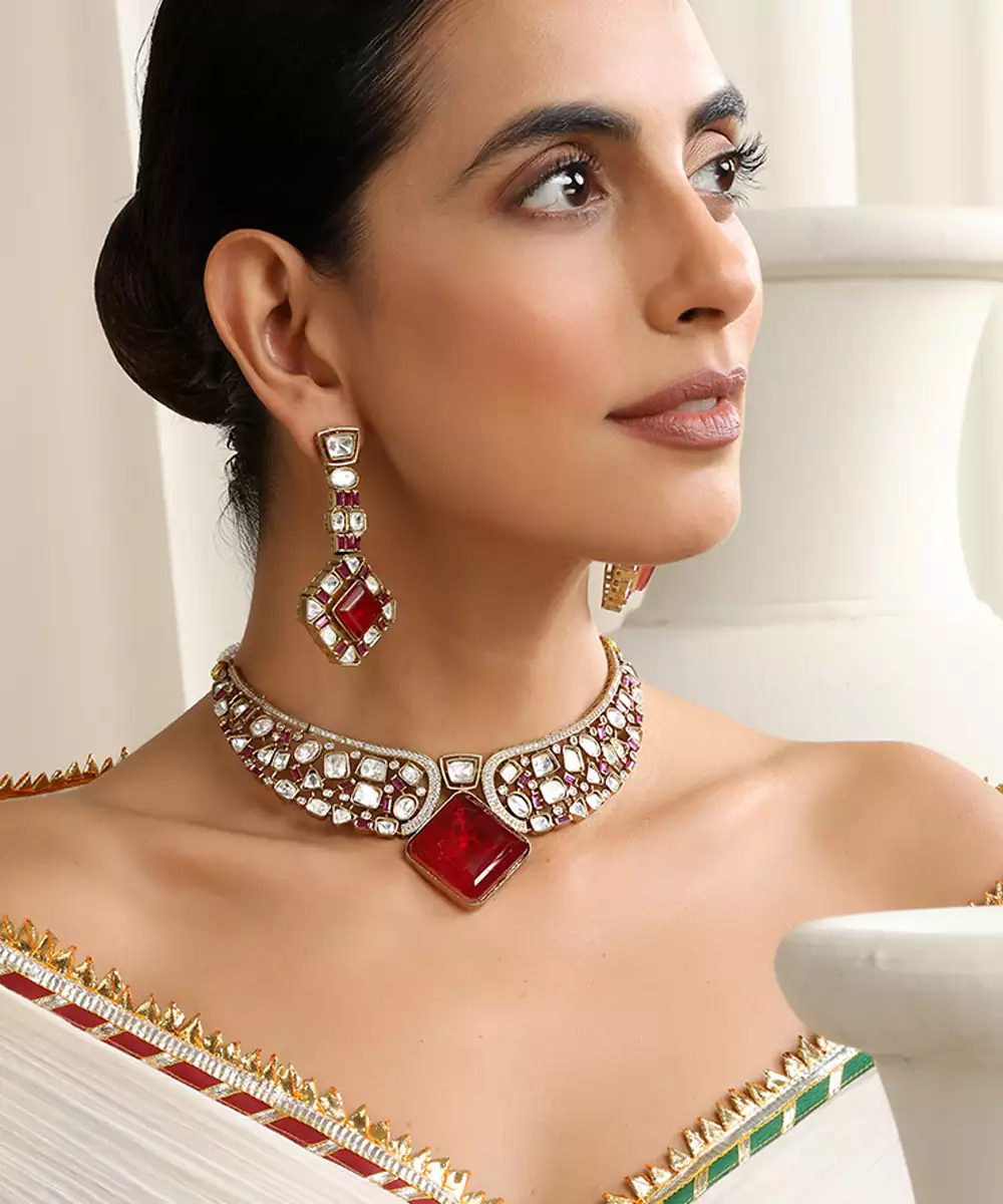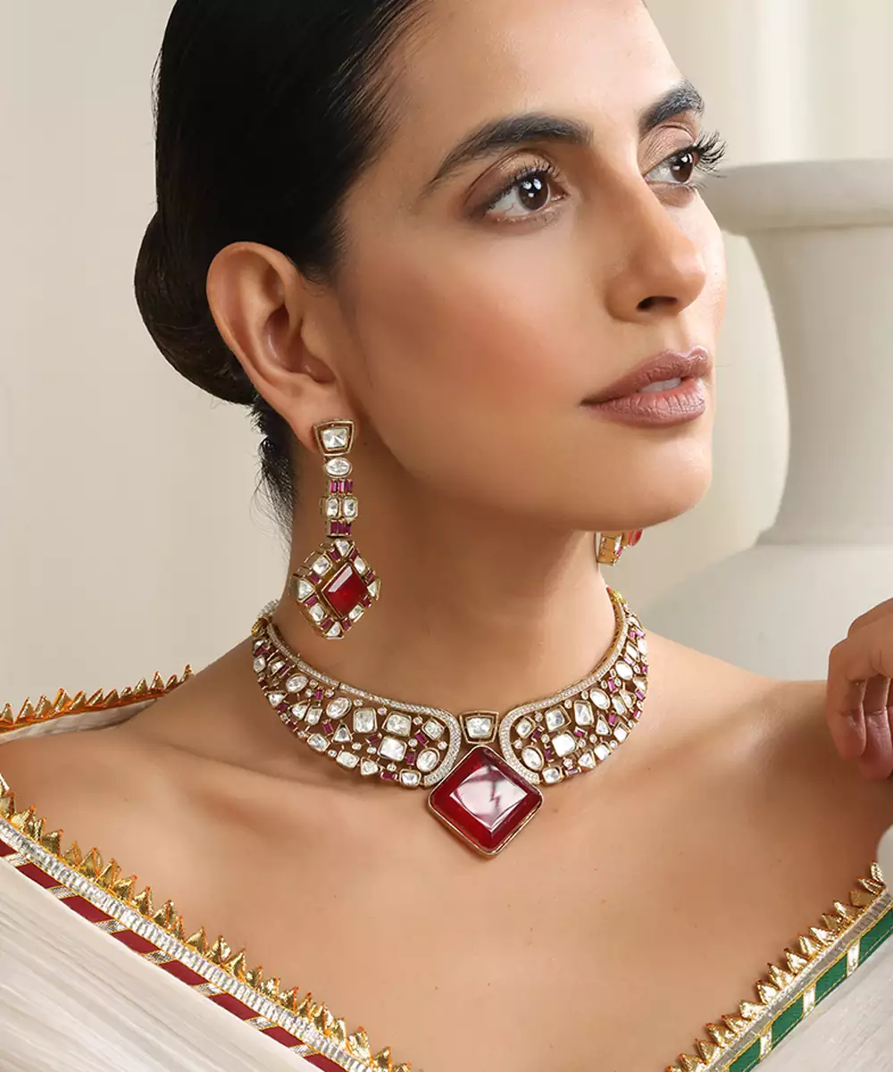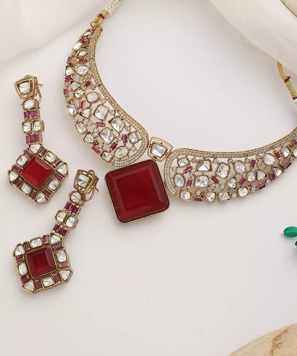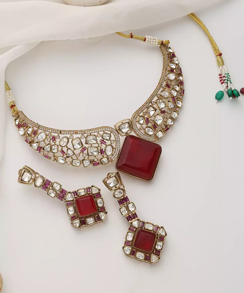 Red Rose Gold Polki Choker Set Colour: Red Material: Brass Components: 1 Necklace / 1 Pair Of Earrings