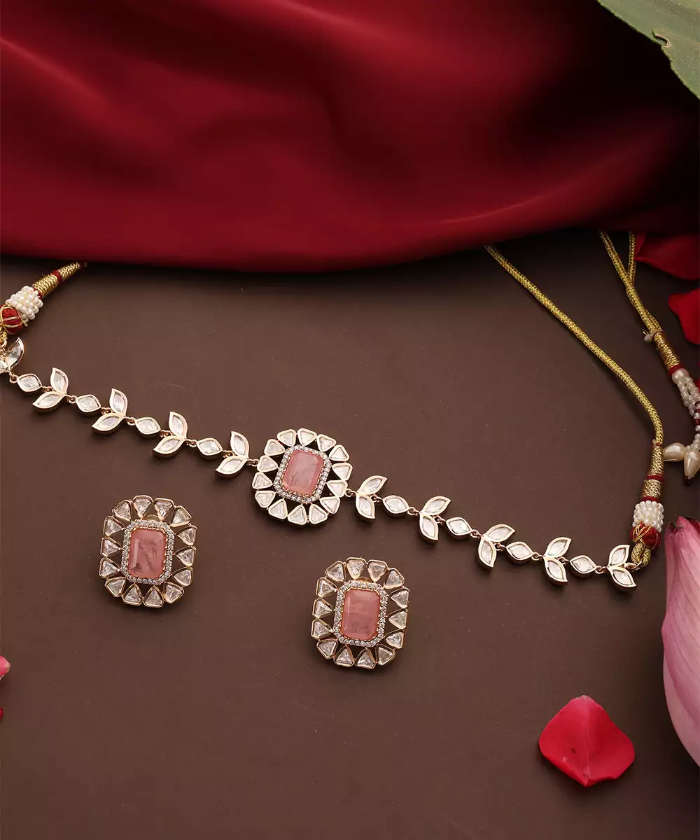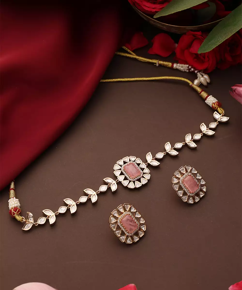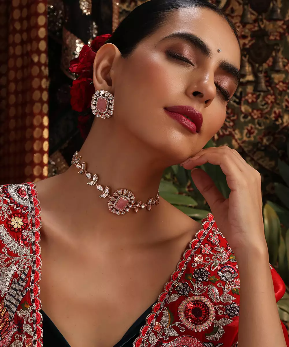 This Rose Gold Plated Kundan Choker Necklace Set Is Adorned With Delicate Pink Stones, Radiating Timeless Elegance And Feminine Charm. Crafted With Intricate Kundan Detailing, It Beautifully Enhances Traditional And Festive Attire. Perfect For Weddings And Special Occasions, It Adds A Graceful, Statement Touch To Ethnic Ensembles.