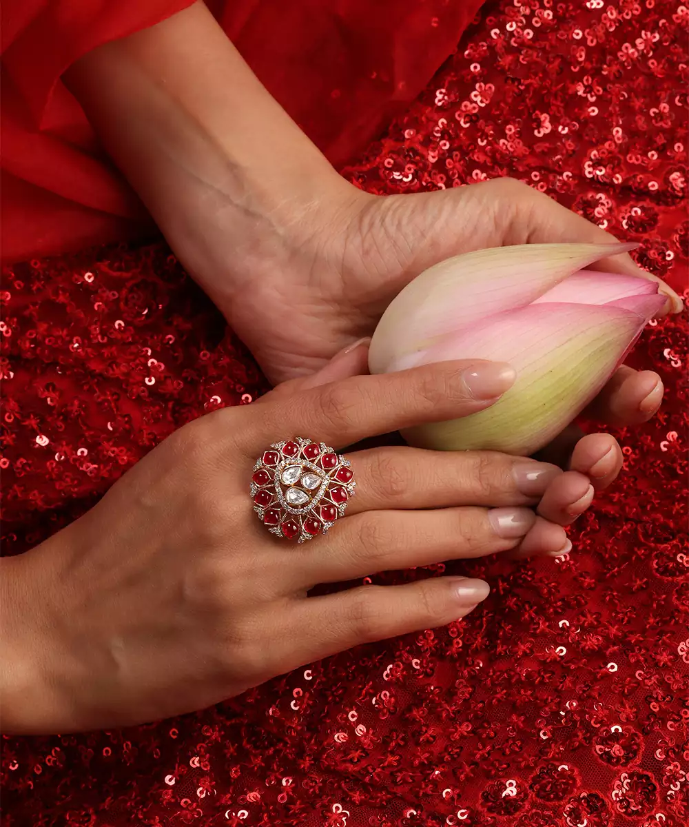 This Rose Gold Plated Kundan Ring Is Adorned With Striking Red Stones, Exuding Timeless Elegance And Regal Charm. Crafted With Intricate Detailing, It Adds A Refined Touch To Festive And Traditional Looks. Perfect For Weddings And Special Occasions, It Offers Graceful Sophistication And Statement Appeal.