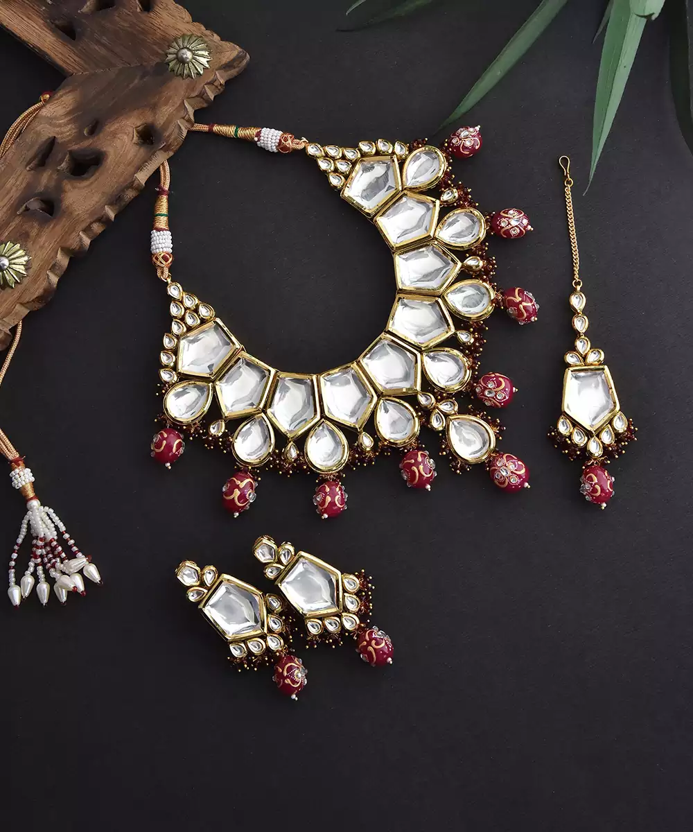Red Gold Tone Kundan Necklace Set With Maang Tikka Has Brass, Kundan, Beads Materials Used.