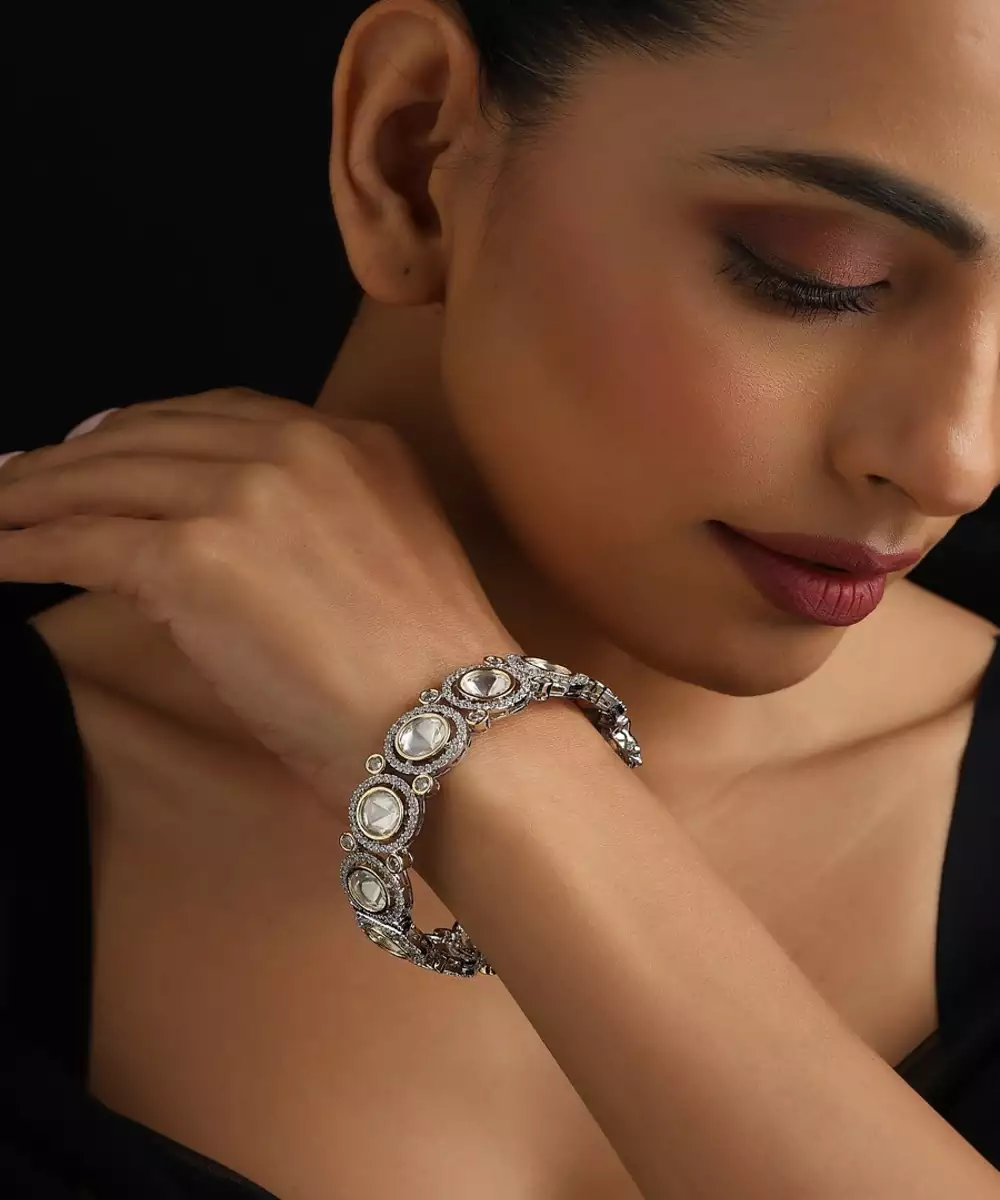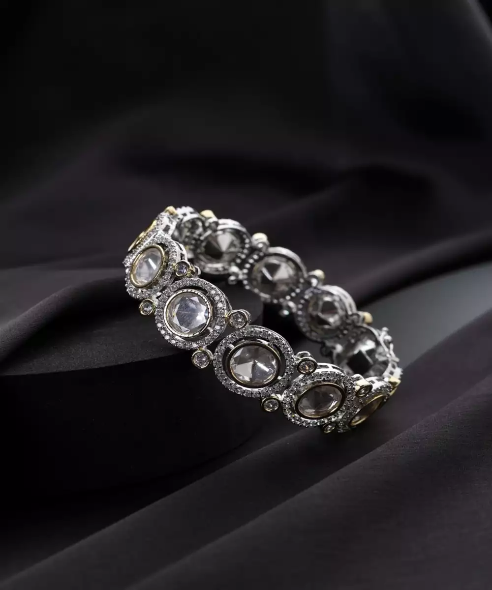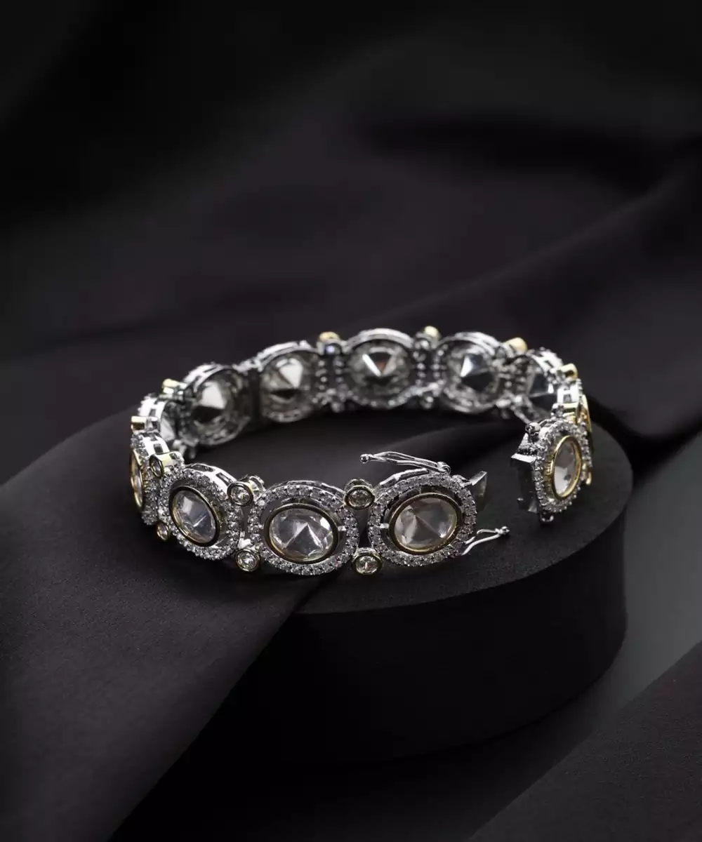 Embrace A Touch Of Modern Elegance With This Silver Plated Polki Bangle. The Cool, Lustrous Finish Of The Silver Beautifully Contrasts With The Warm, Rustic Sparkle Of Uncut Polki Stones. This Piece Seamlessly Blends Traditional Indian Craftsmanship With A Contemporary Aesthetic, Making It A Versatile And Sophisticated Accessory For Any Occasion