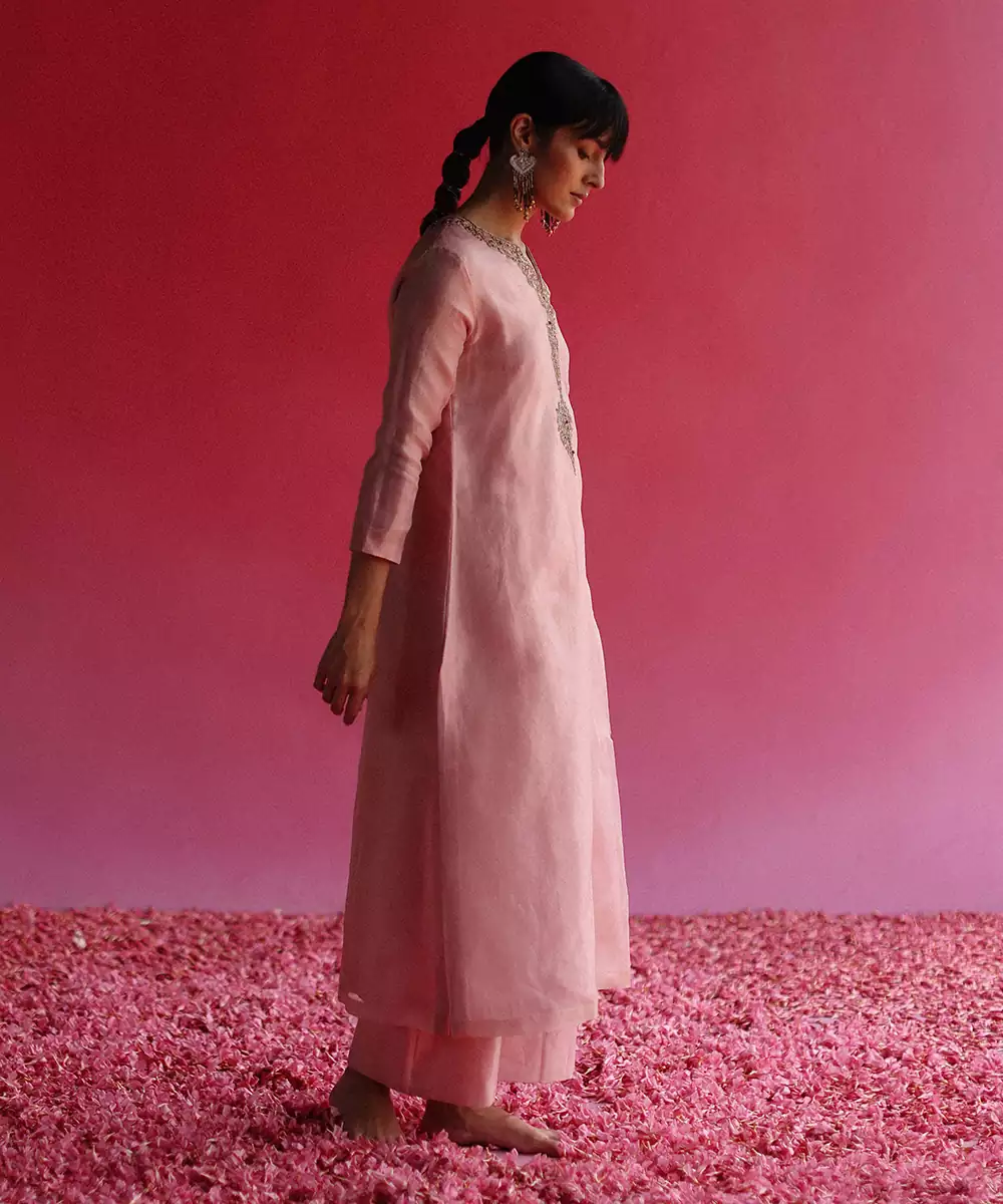 A Pure Zari Tissue Silk Long A Line Kurta With Quarter Sleeves Having An Etherial Antique Zardozi Hand Embroidery Along The Neckline Is Paired With A Pure Zari Tissue Silk Flare Pants Having A Side Closure.