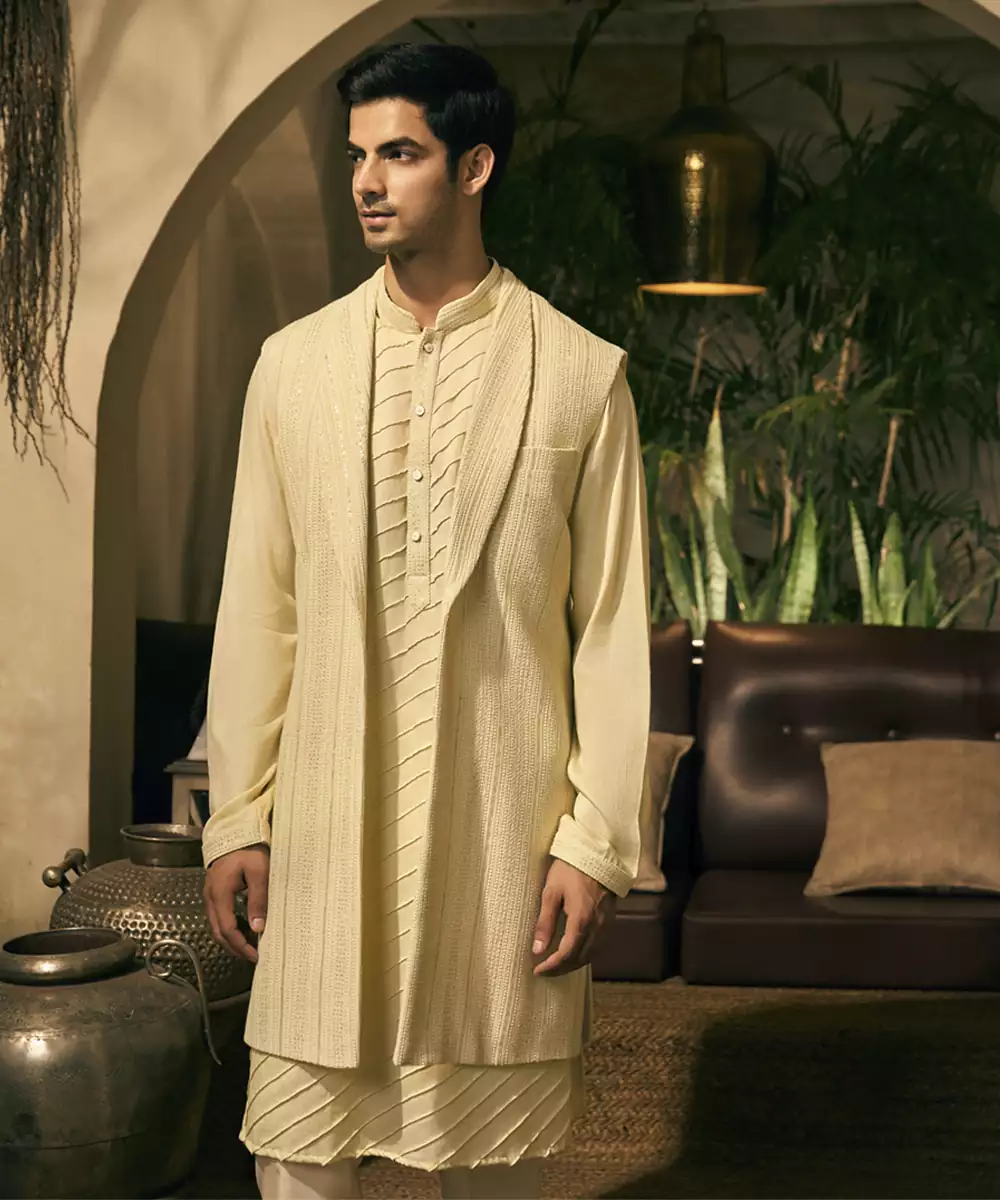 New Age Pintuck Detailing On Kurtacolour, Light Greenembroidery, All Over Embroidered Shrugsilhoutte, Shawl Collar Shrugfabric, Silk Blend Colour: Green Fabric: Cotton Silk Components: 1 Bundi Jacket / 1 Kurta / 1 Pant