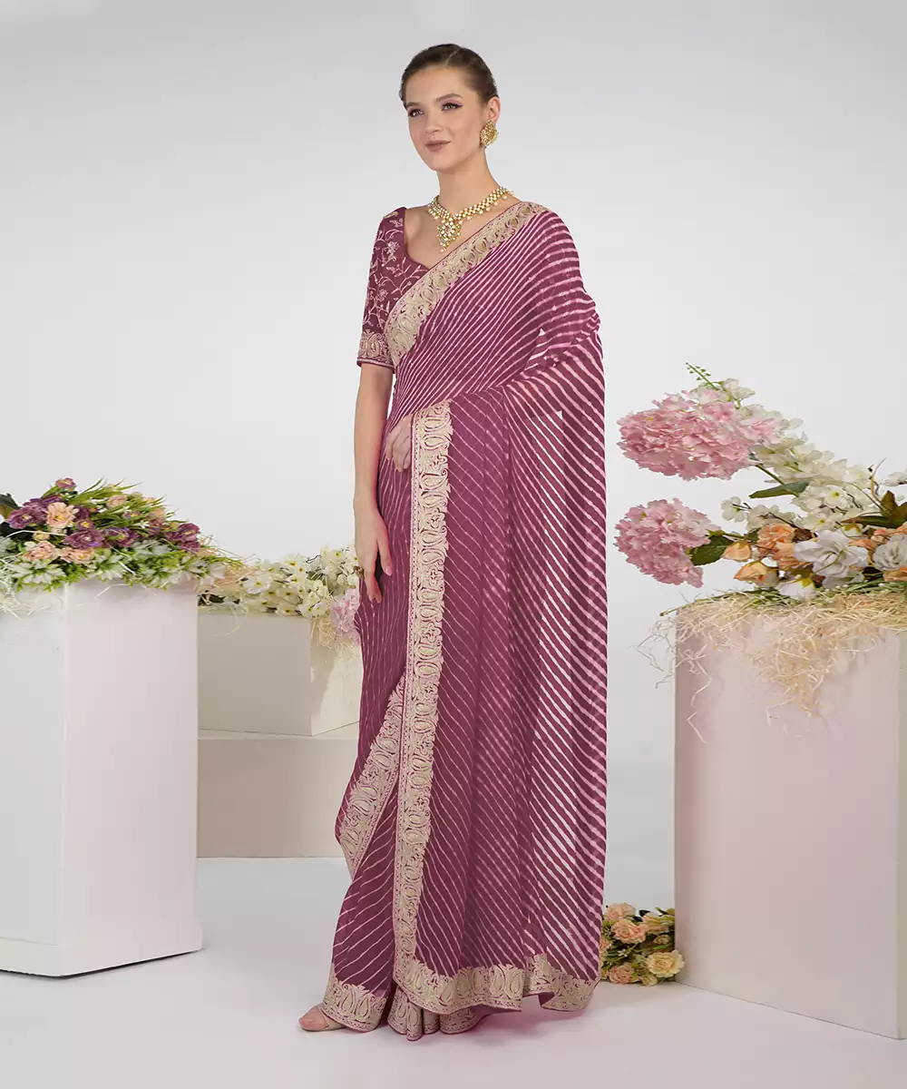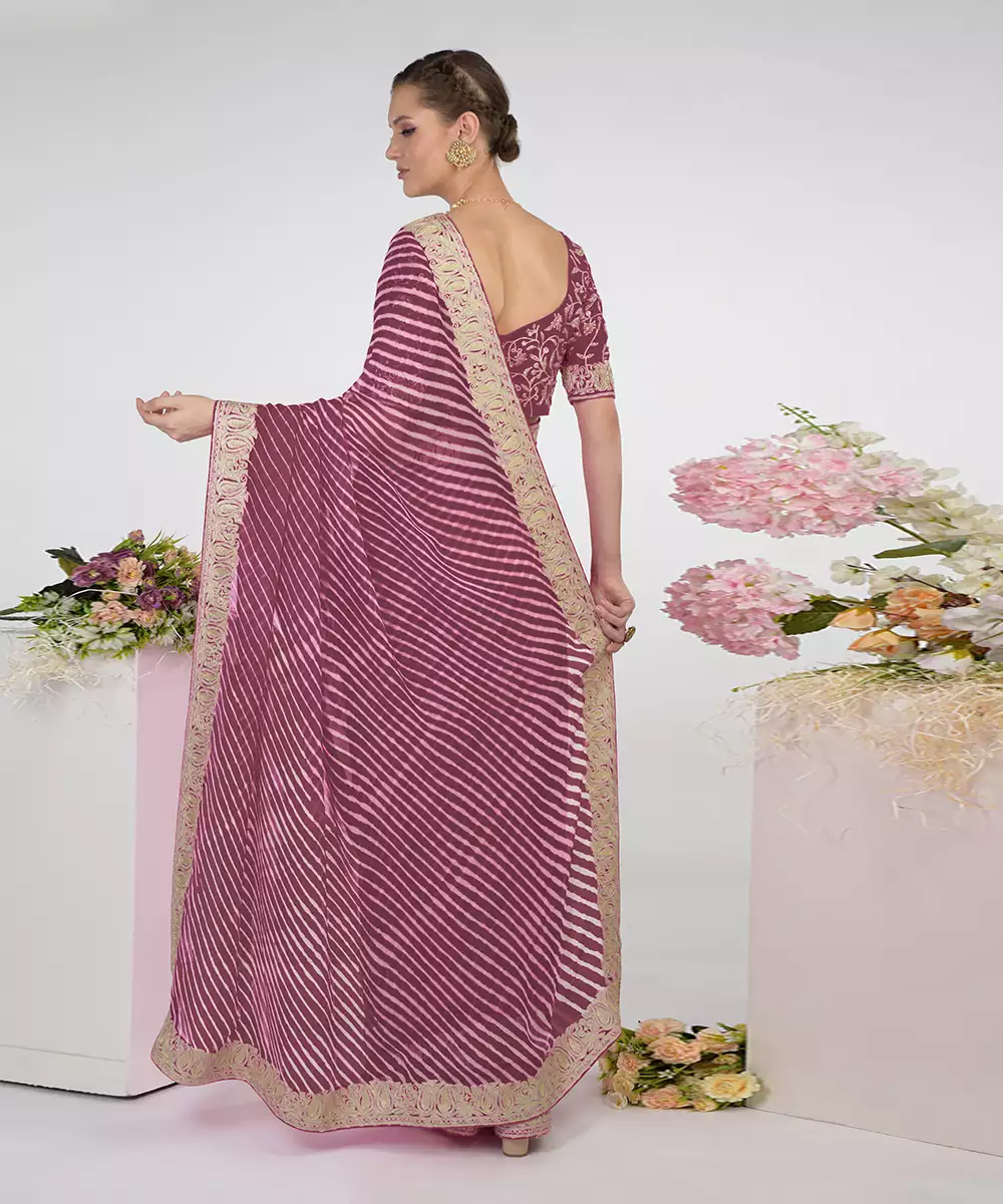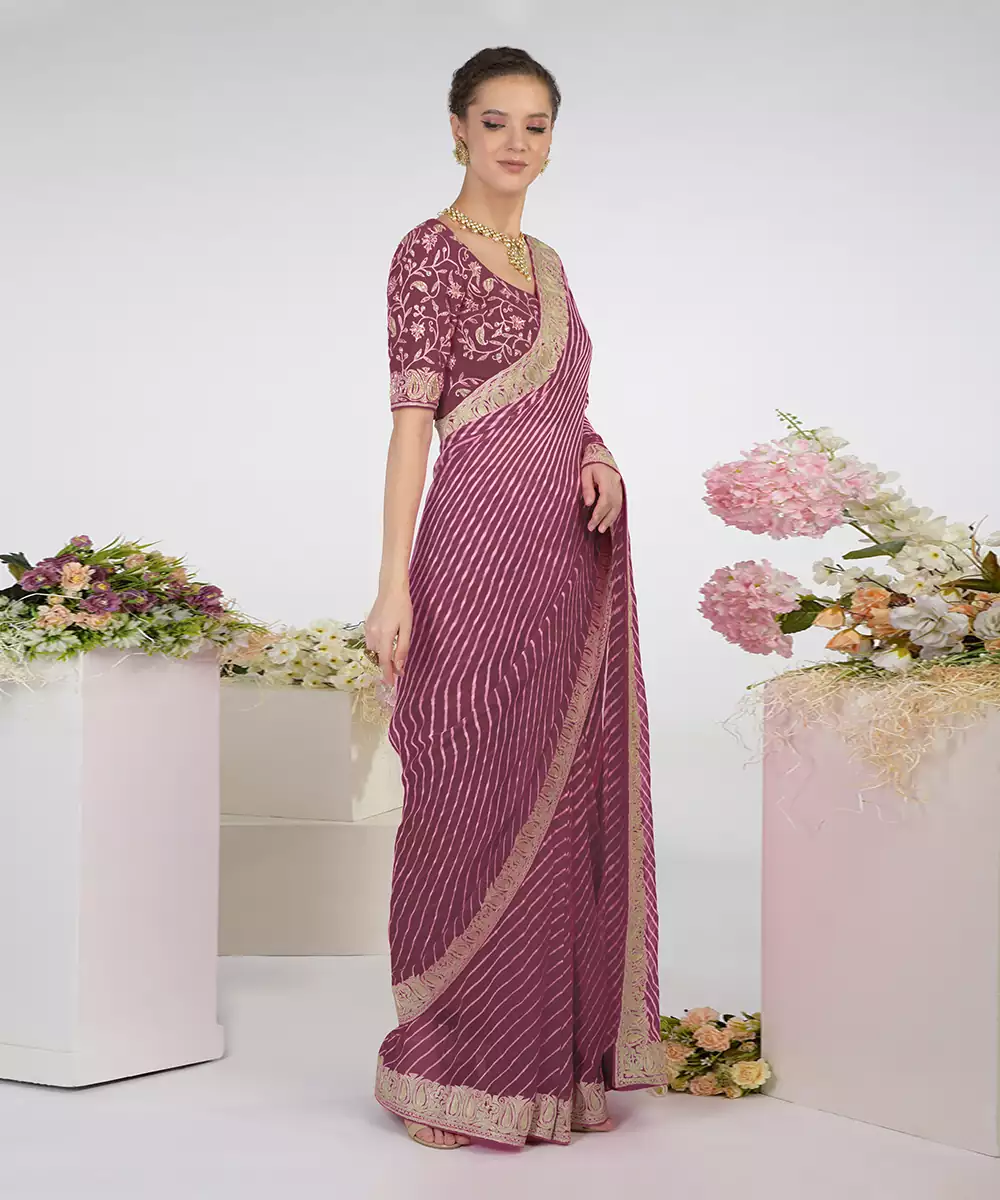 The Saree Is Crafted In Burgundy Purple Chiffon Leheriya And Adorned With Intricate Kashmiri Aari Antique Silver Tilla Paisley Embroidery.Paired Here With A Statement Blouse Featuring A Sweetheart Neckline With Tilla Embroidery Embellished With Cut Bead And Sequins Highlights.