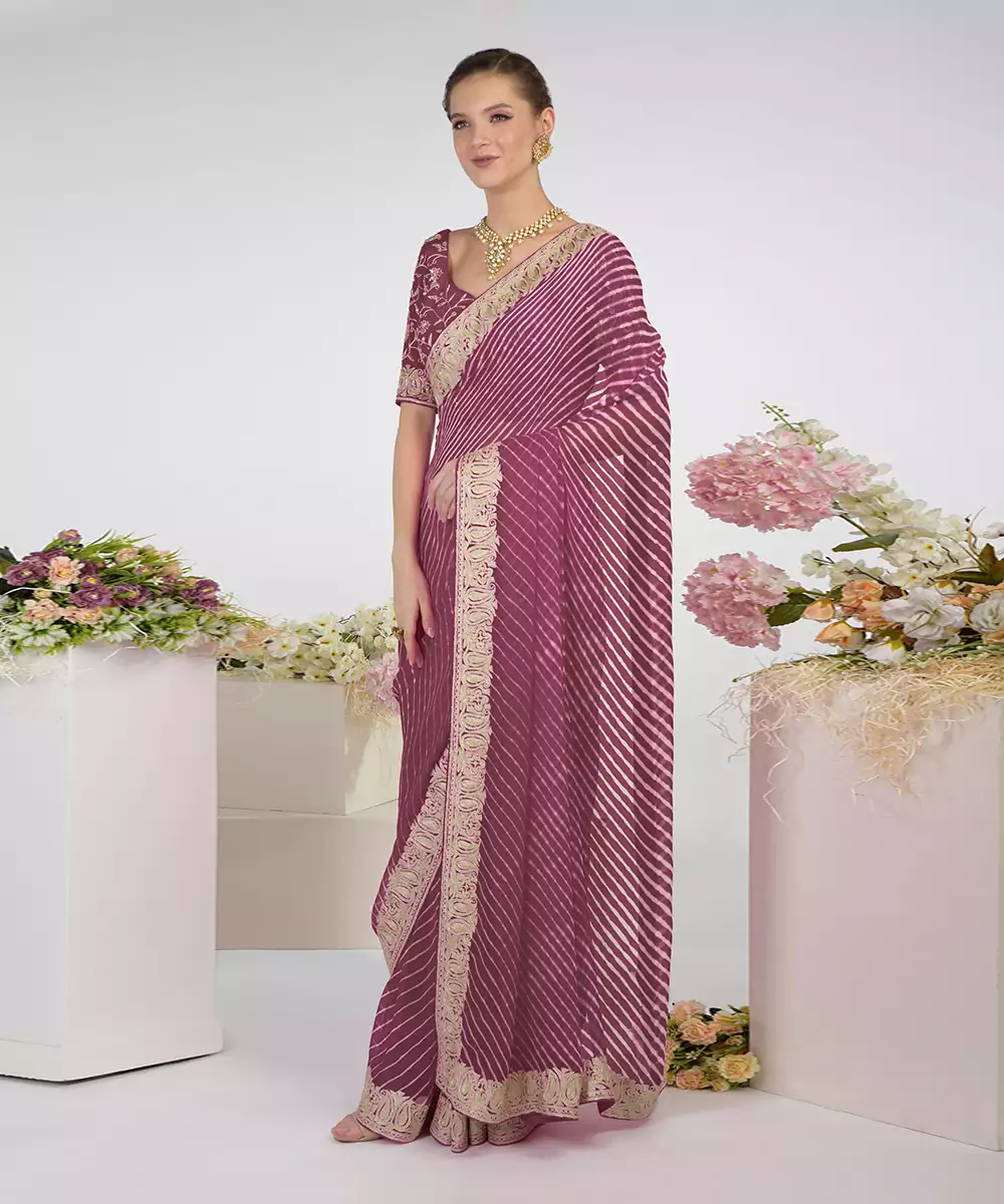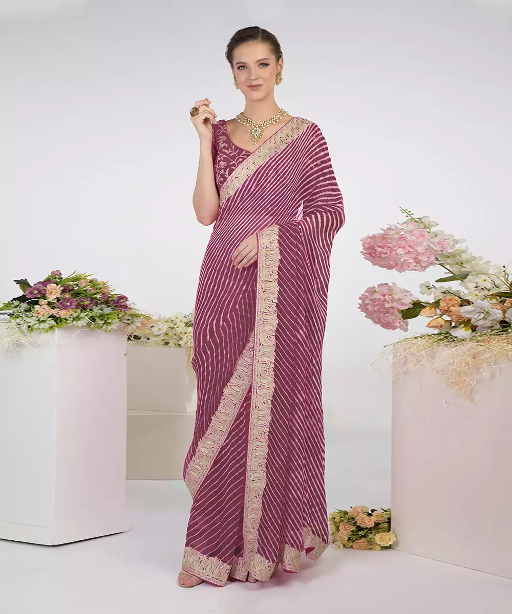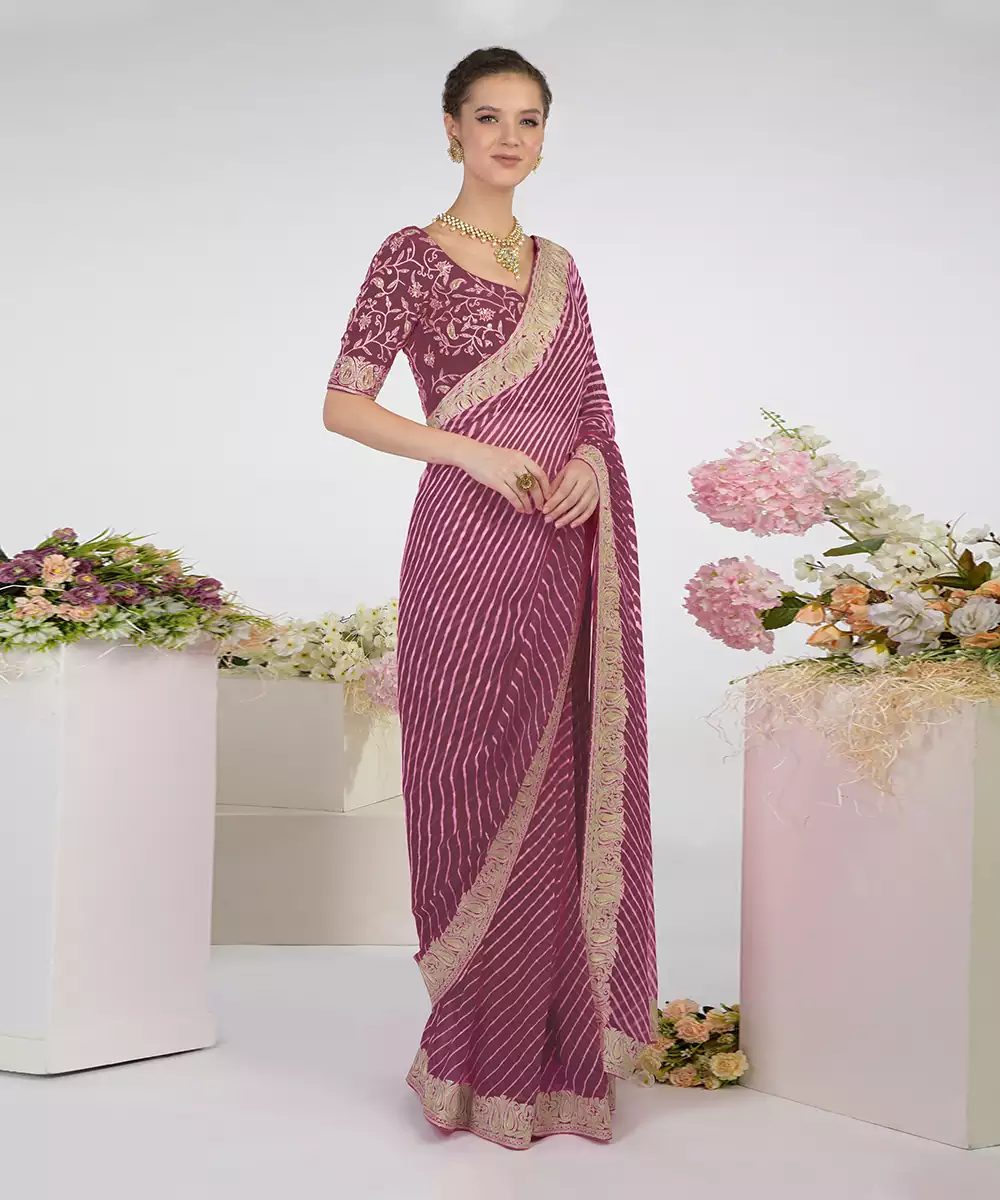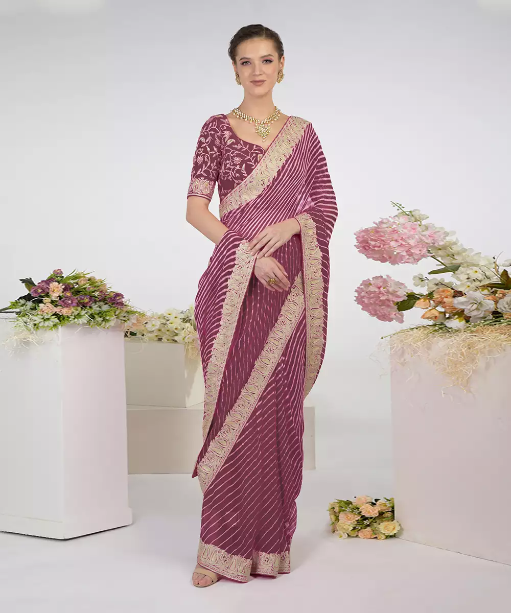 The Saree Is Crafted In Burgundy Purple Chiffon Leheriya And Adorned With Intricate Kashmiri Aari Antique Silver Tilla Paisley Embroidery.Paired Here With A Statement Blouse Featuring A Sweetheart Neckline With Tilla Embroidery Embellished With Cut Bead And Sequins Highlights.