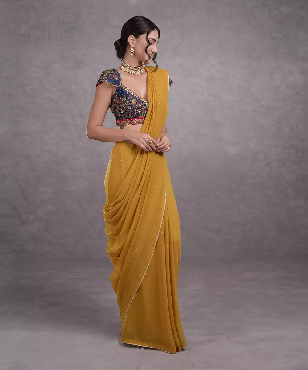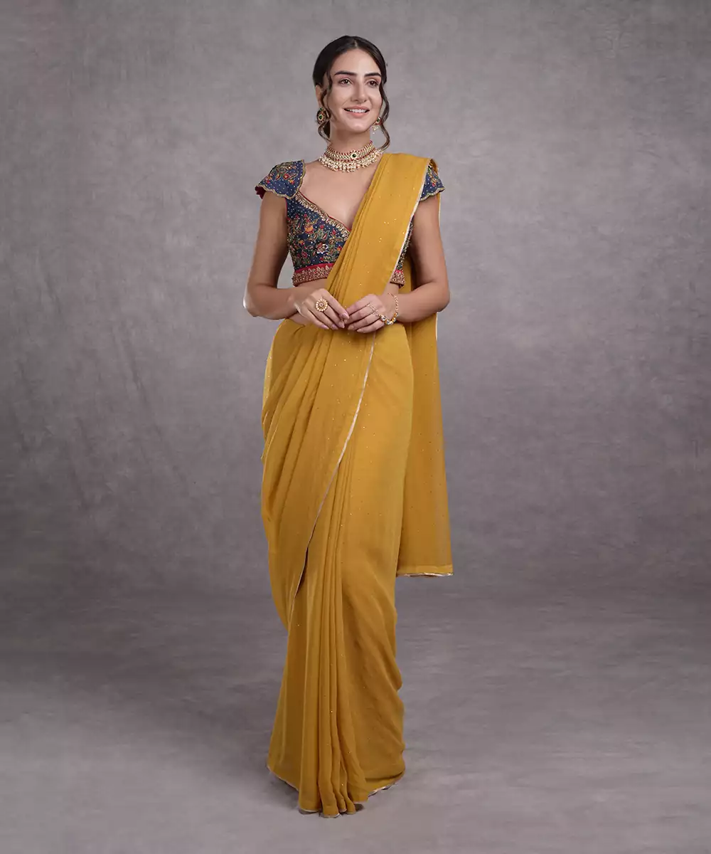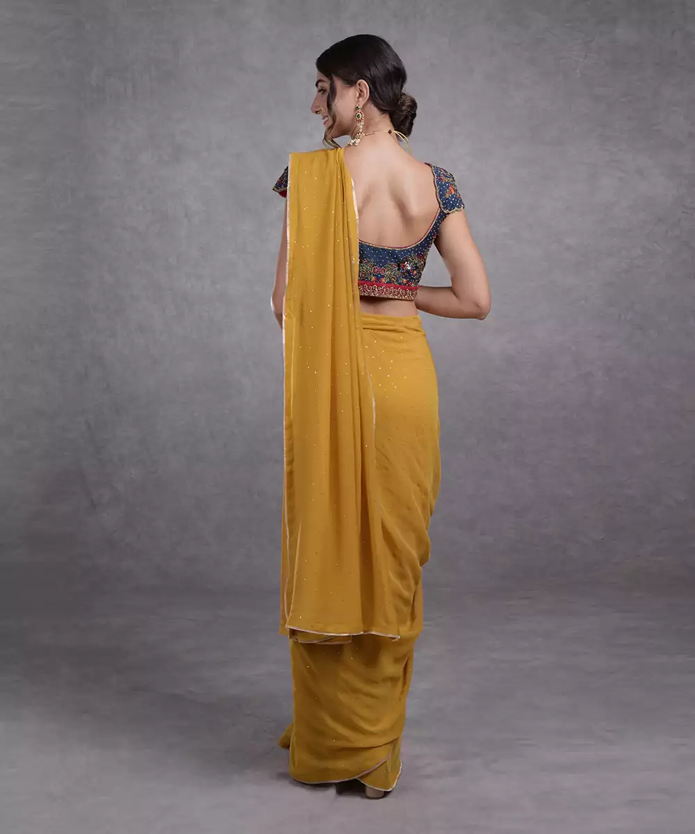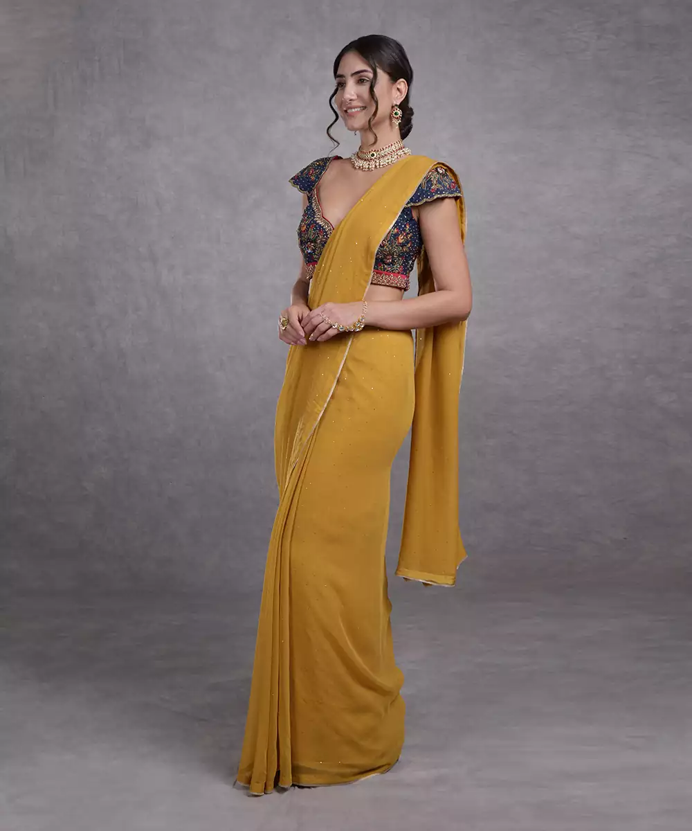 Artistic Gold Zardozi With Multi Color Accented Resham On Pure Raw Silk In Classic Blue Conjures Pure Sartorial Extravagance And Brings A Heritage Touch To Your Dream Wedding Look. The Stunning Saree Catches The Light In So Many Gorgeous Ways, From The Refreshing Mustard Yellow Hue To Beautiful Fusion Of Heritage Gold Zardozi & Multi Color Resham Embroidery On A Contemporary Silhouette. The All Over Red Yellow Green Resham Embroidered Blue Blouse With Zardozi Crystal Beads Accent Features Scalloped Velvet Padded Cap Sleeves.
