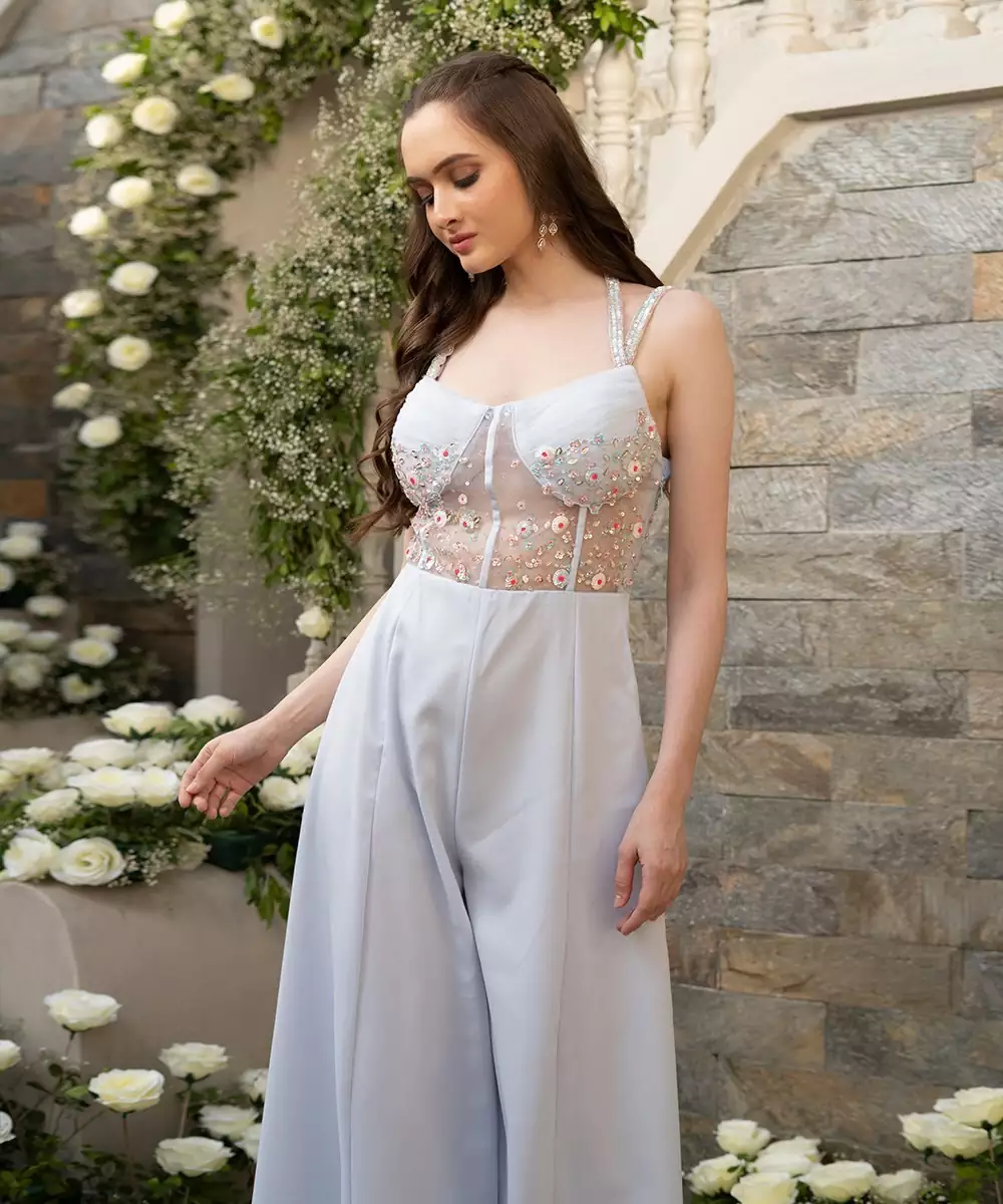 Powder Blue Pleated Corset Strap Jumpsuit Handcrafted With 3d Floral Motifs In Sequins , Cutdana , Bead Work