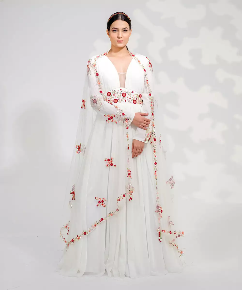White Drape V Neck Floral Anarkali With Floral Cutwork Tulle Duppatta .
