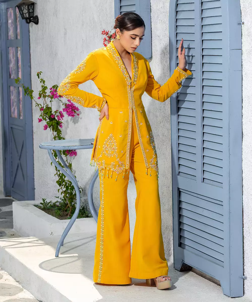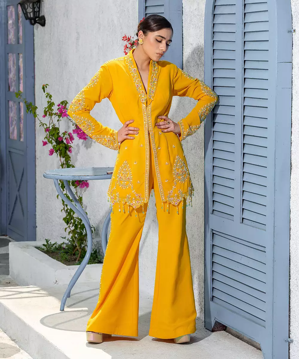 Featuring Yellow Collar Handcrafted Jacket Kurta Paired With Pants