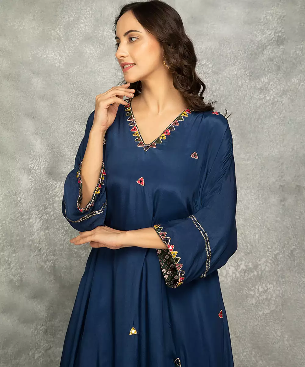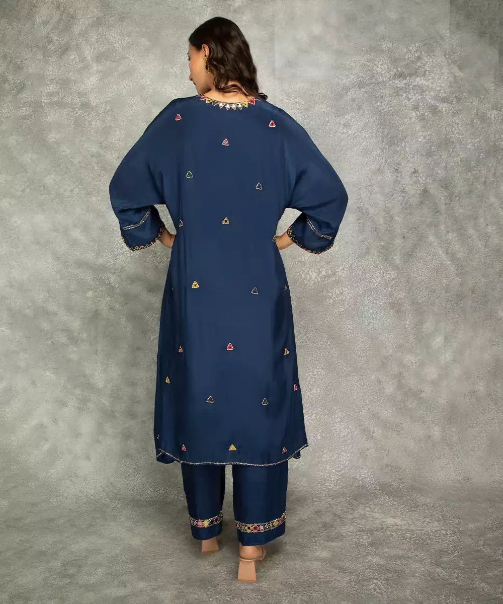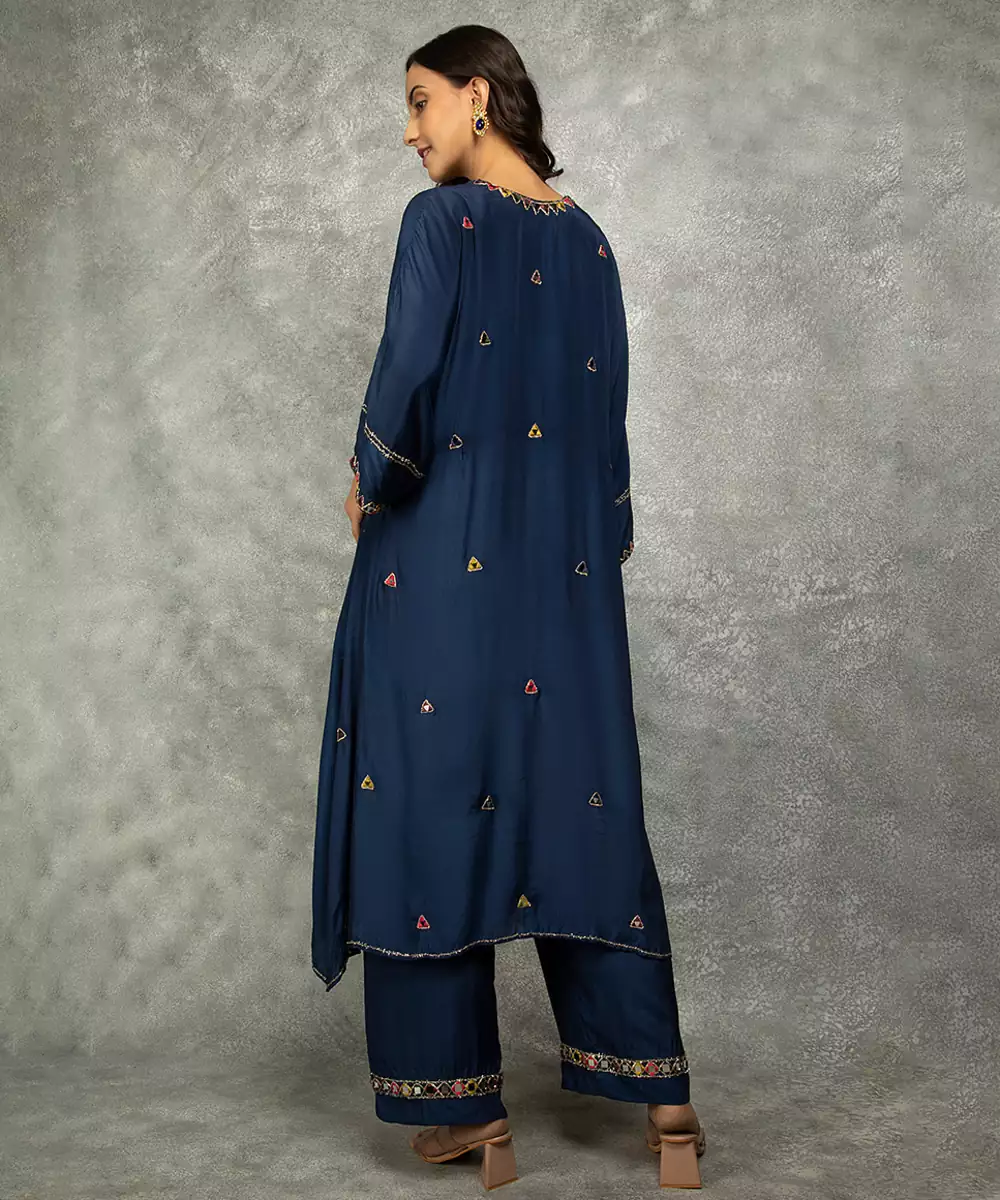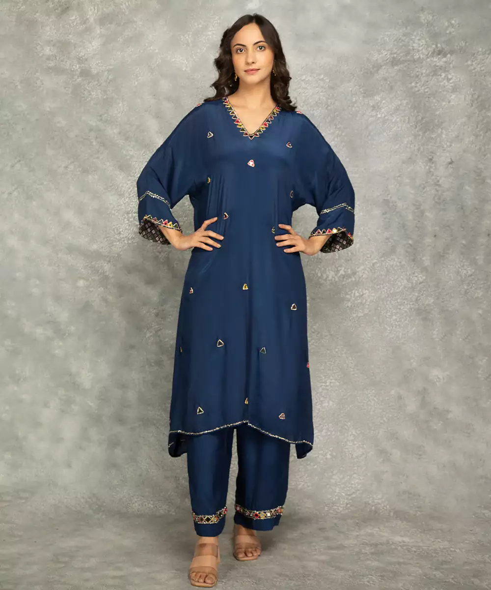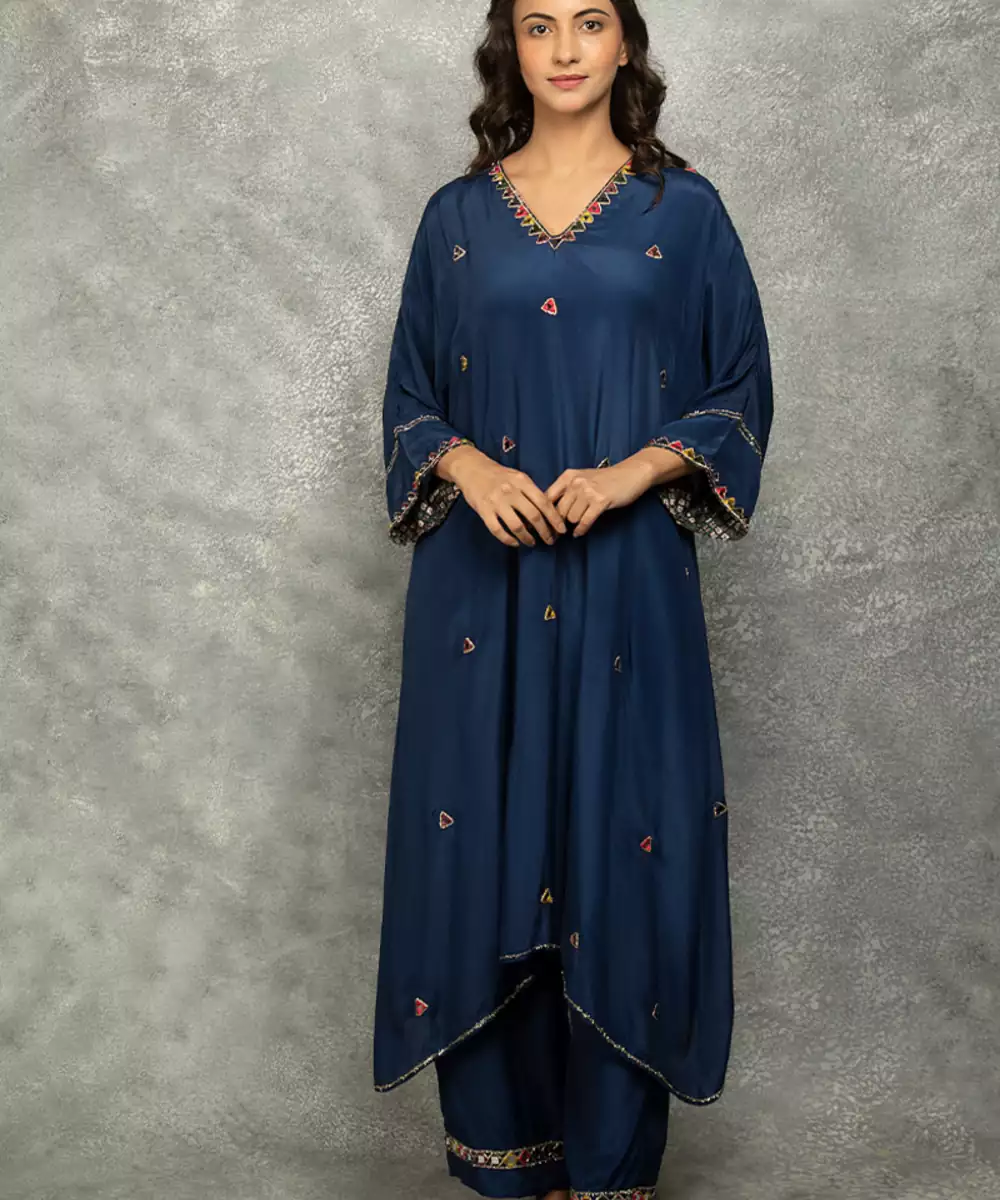Featuring Blue Crepe High Low Kaftan With Mirror Work Scattered Across The Body, Neckline. It Is Paired With Matching Crepe Pants Featuring Mirror Detailing On The Edges.