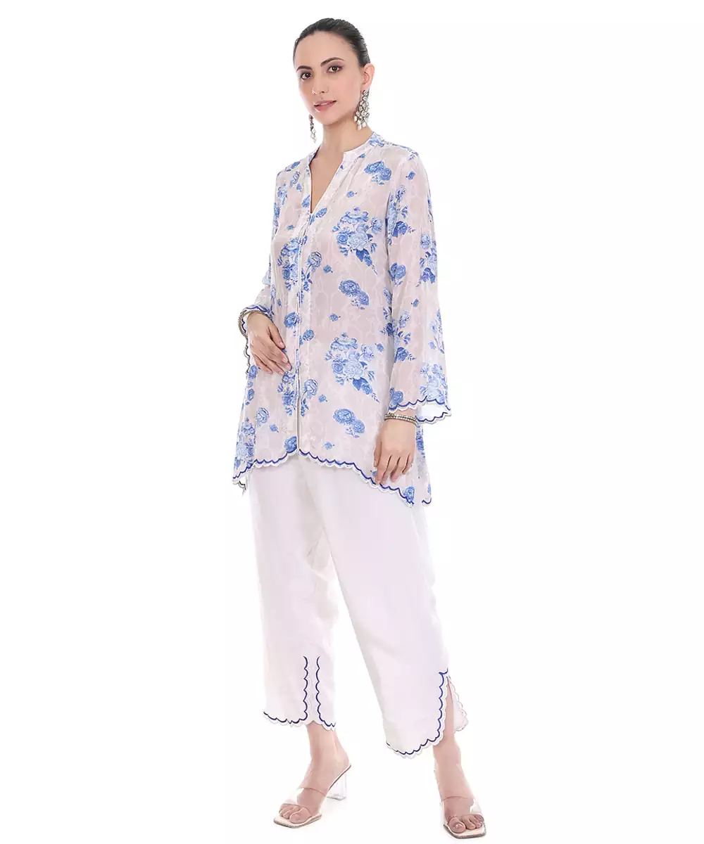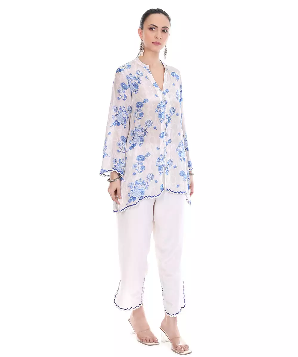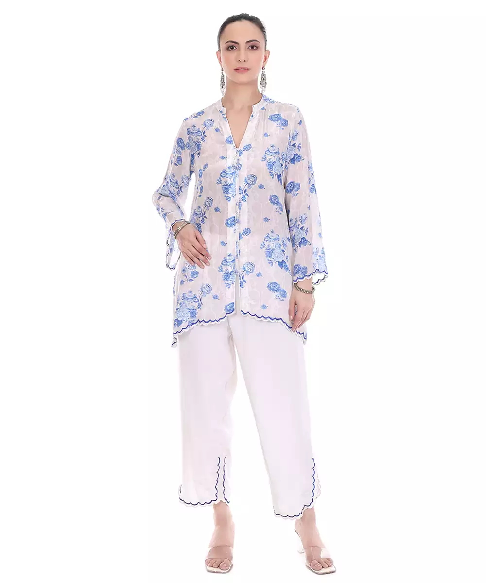 This Blue Printed Crepe Co Ord Set Features A Stylish Design With A Smooth, Flowy Texture. The Coordinated Look Enhances Its Modern Appeal, While The Breathable Fabric Ensures Comfort. Perfect For Casual Outings And Day Events, It Offers A Chic And Contemporary Fashion Statement.