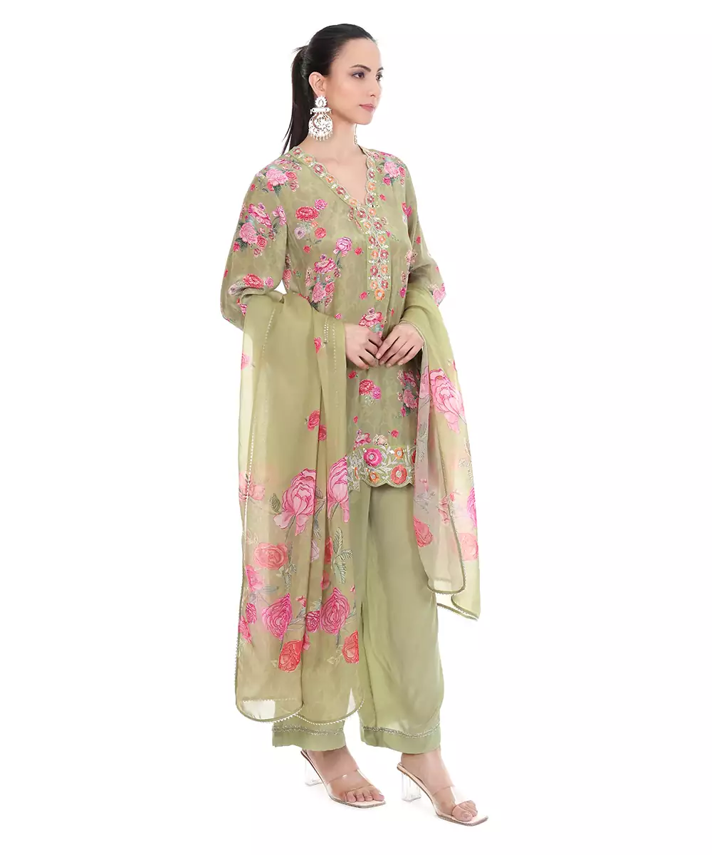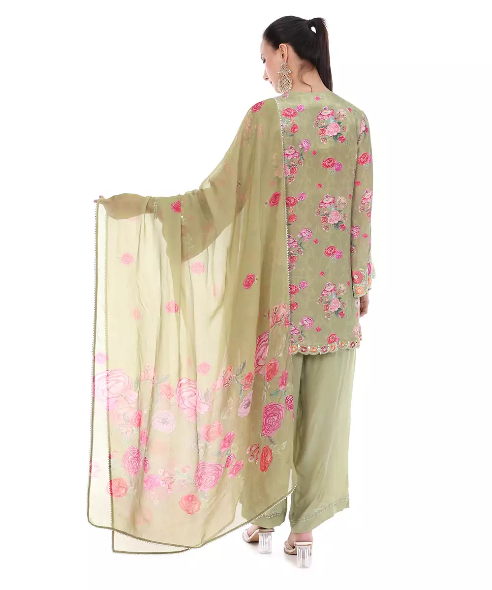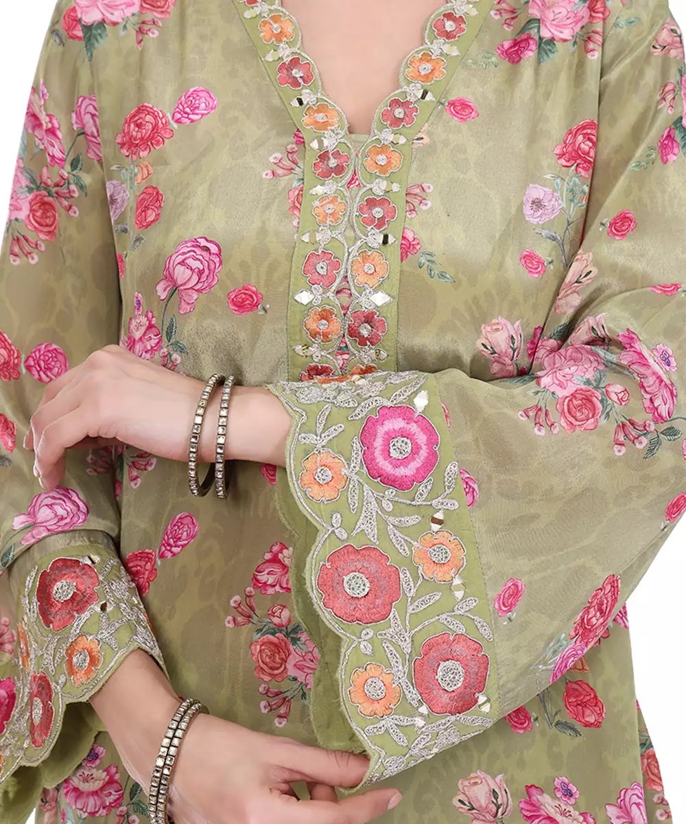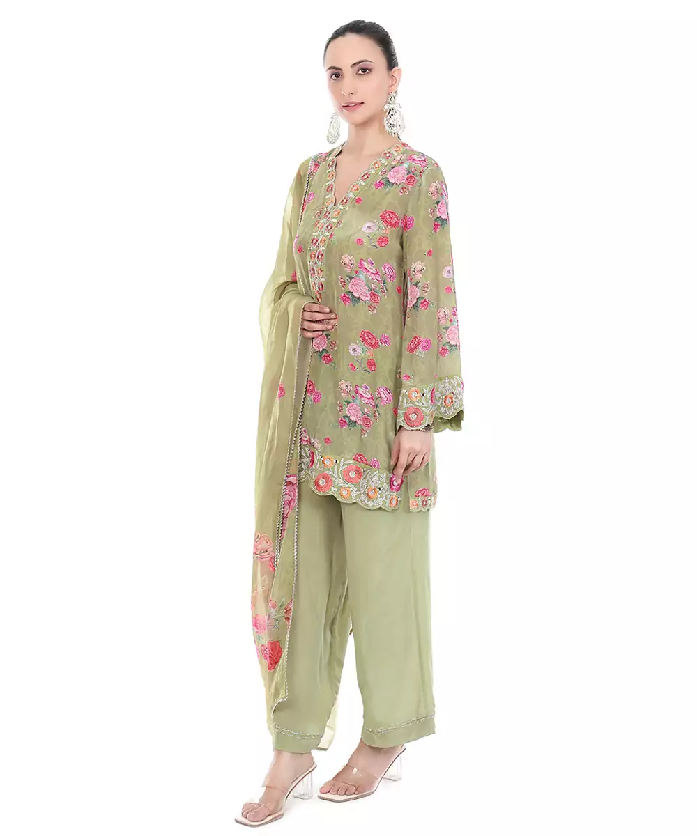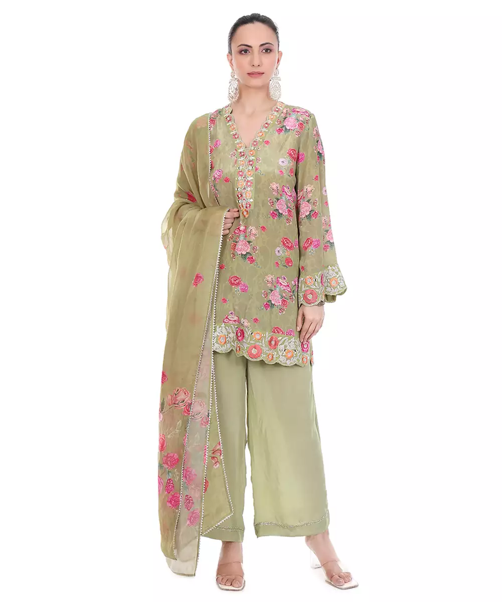 This Green Embroidered Crepe Kurta Set Offers A Soothing Color With Elegant Detailing. The Lightweight Crepe Fabric Ensures A Smooth Drape And Comfortable Wear, While The Intricate Embroidery Enhances Its Refined Appeal. Perfect For Festive And Semi Formal Occasions, It Delivers A Graceful And Sophisticated Ethnic Look Effortlessly.