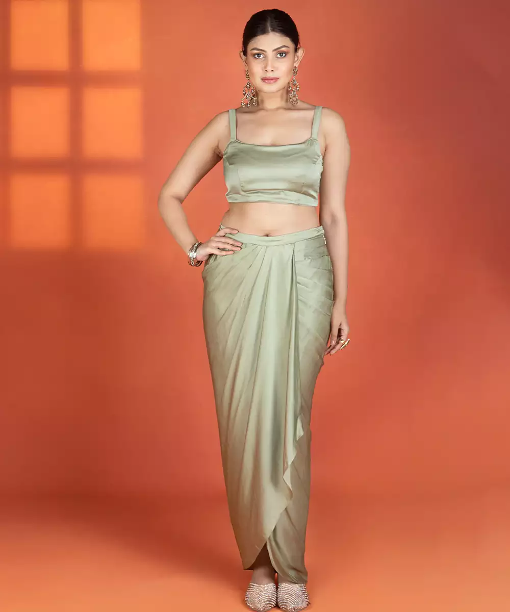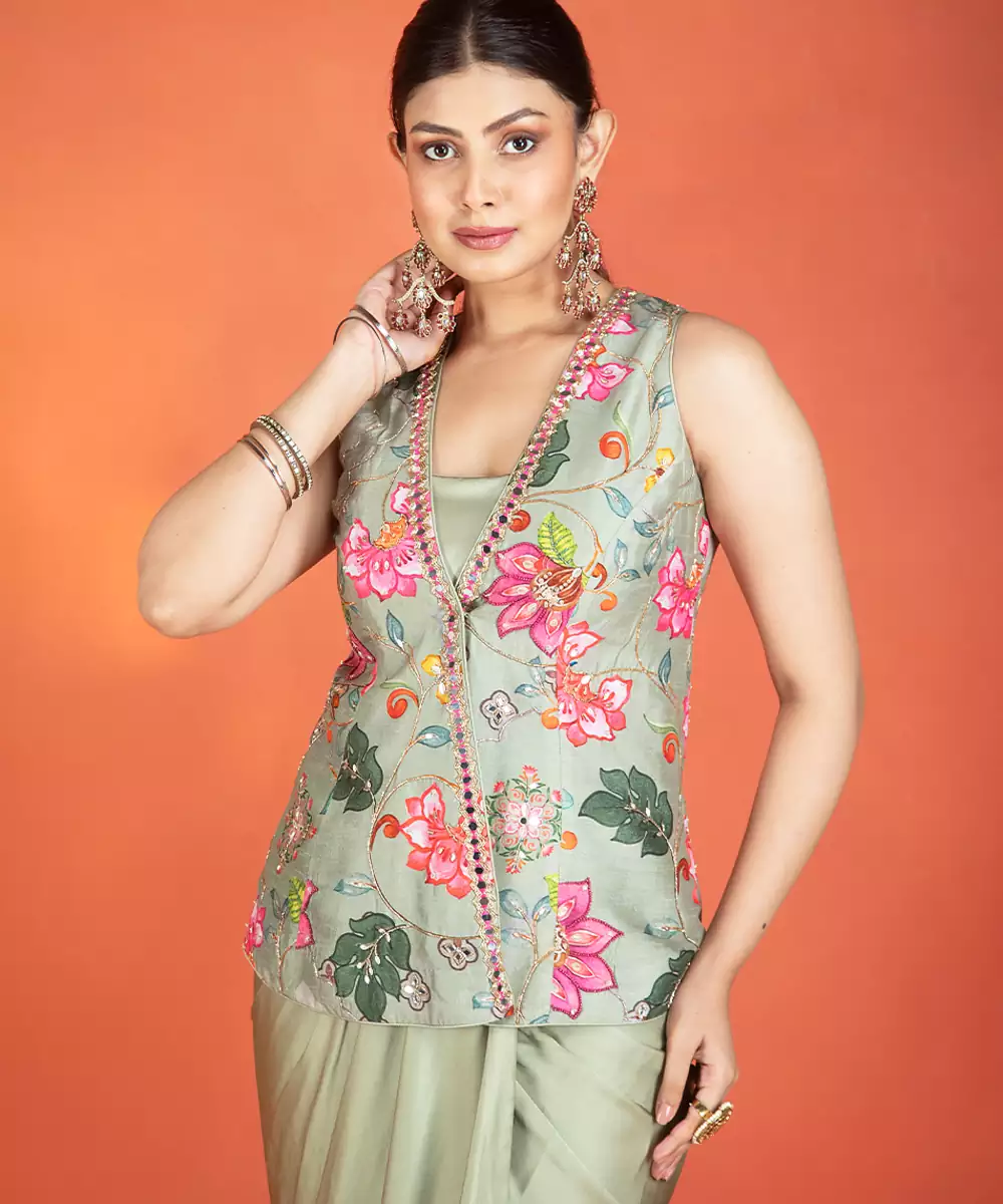 Featuring A Green Floral Printed Hand Embroidered Raw Silk Jacket, Paired With A Sleek Modal Satin Inner And A Flowy Modal Satin Drape Skirt.
