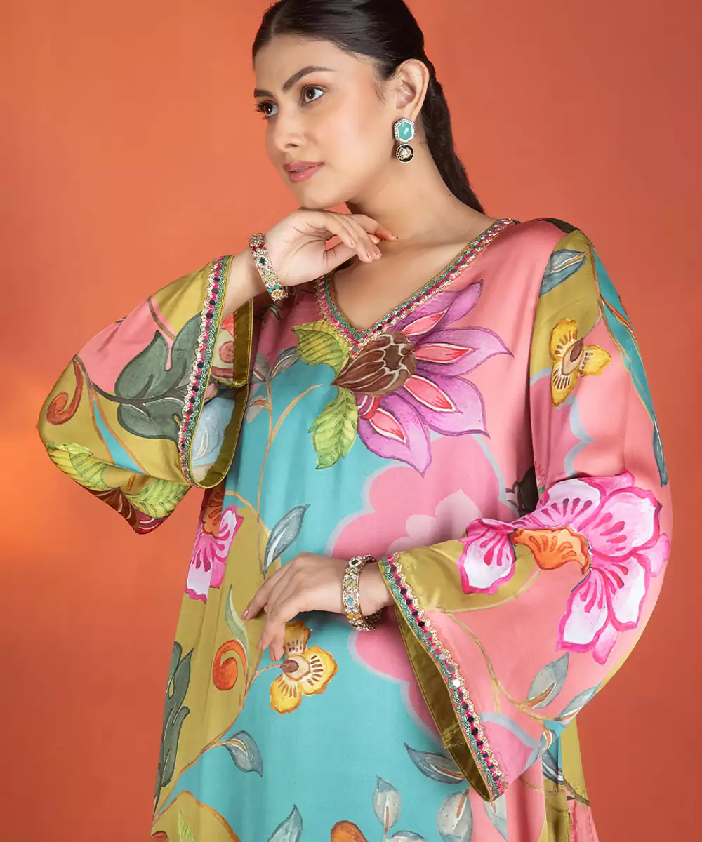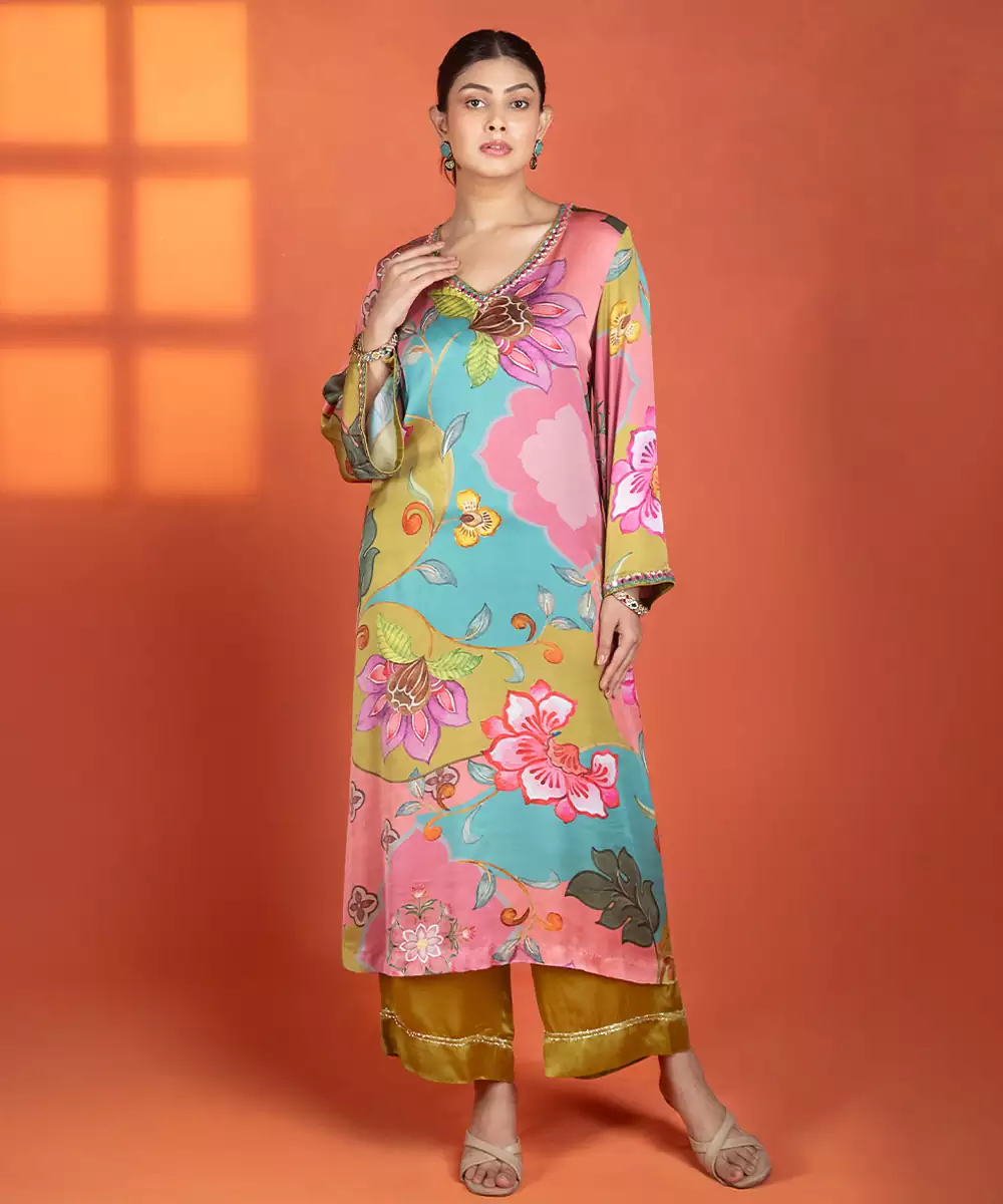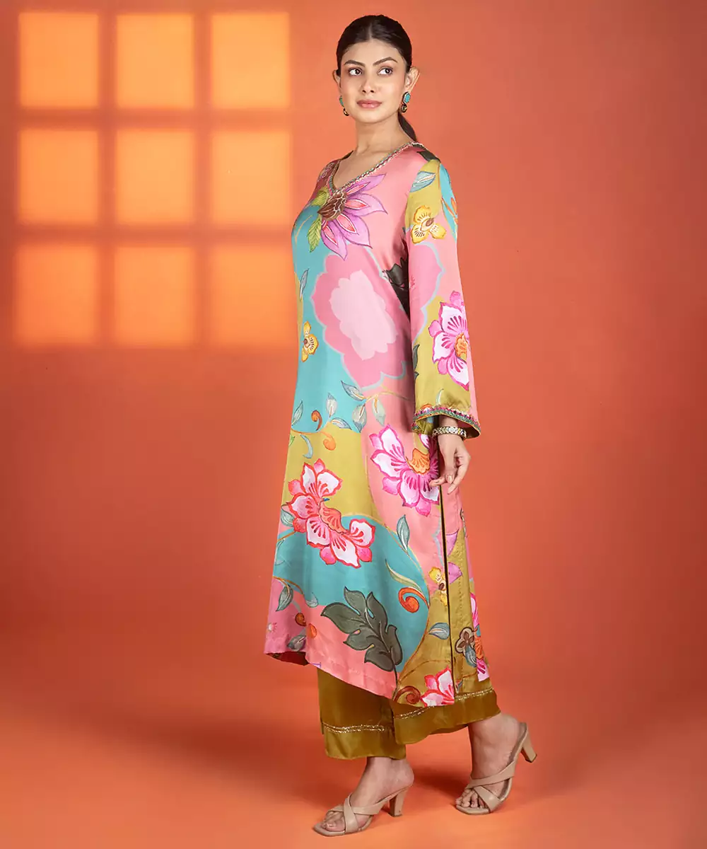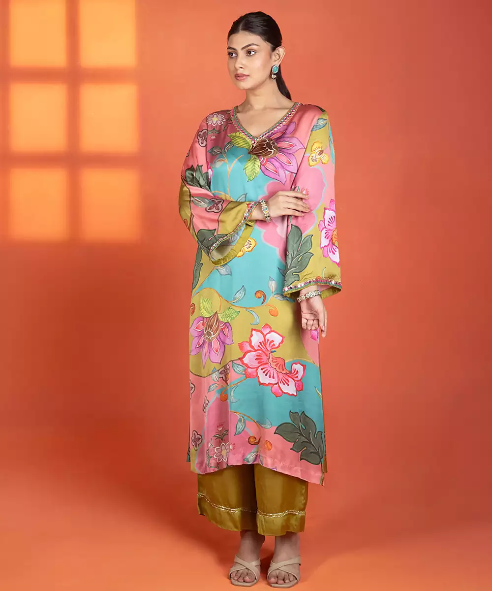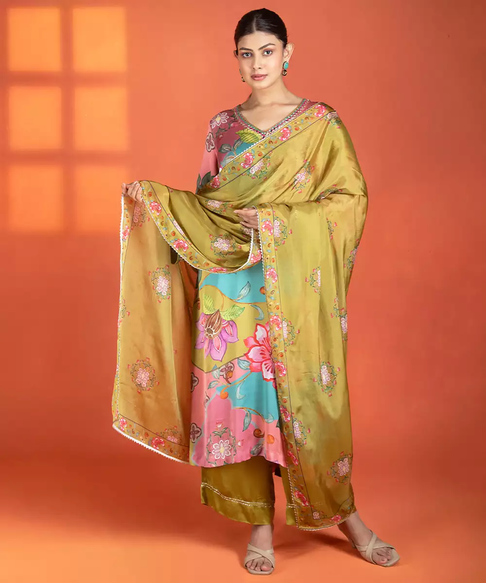 Featuring A Multi Color Floral Printed Modal Satin Kurta, Paired With Matching Modal Satin Pants And A Tabby Silk Dupatta. Color: Multicolor Fabric: Satin Components: 1 Kurta / 1 Pant / 1 Dupatta