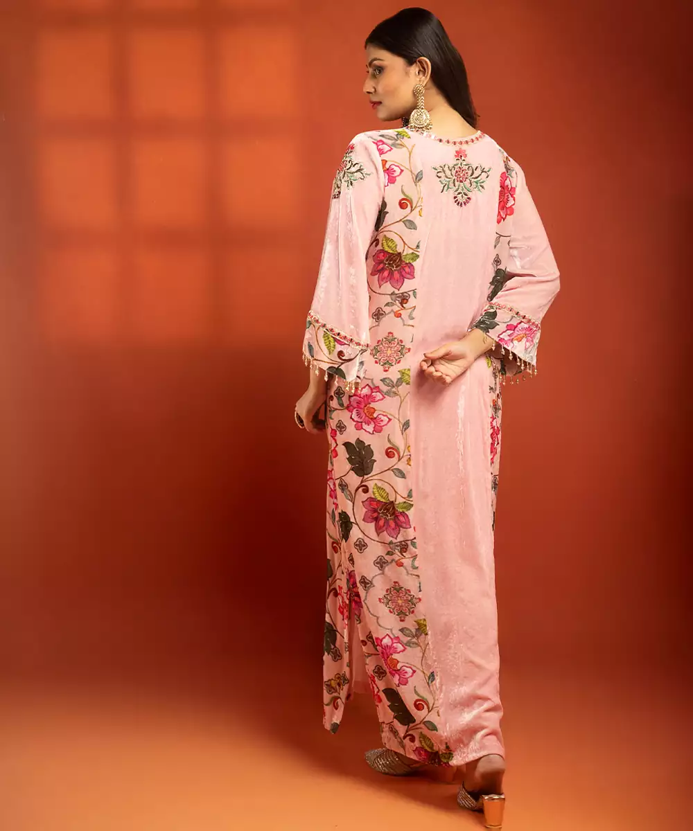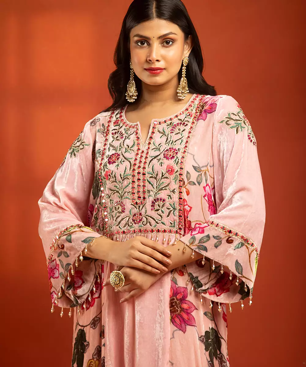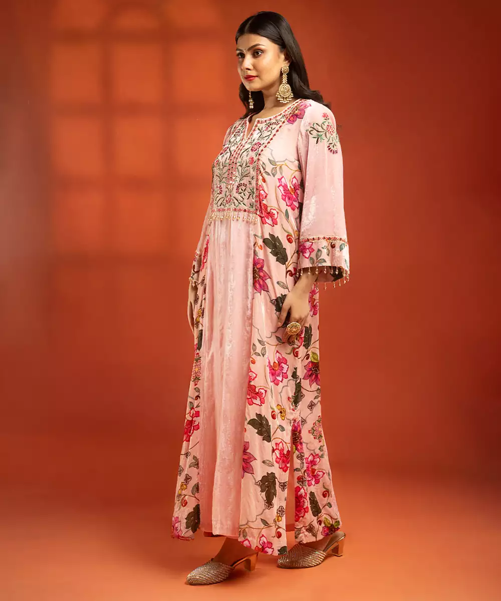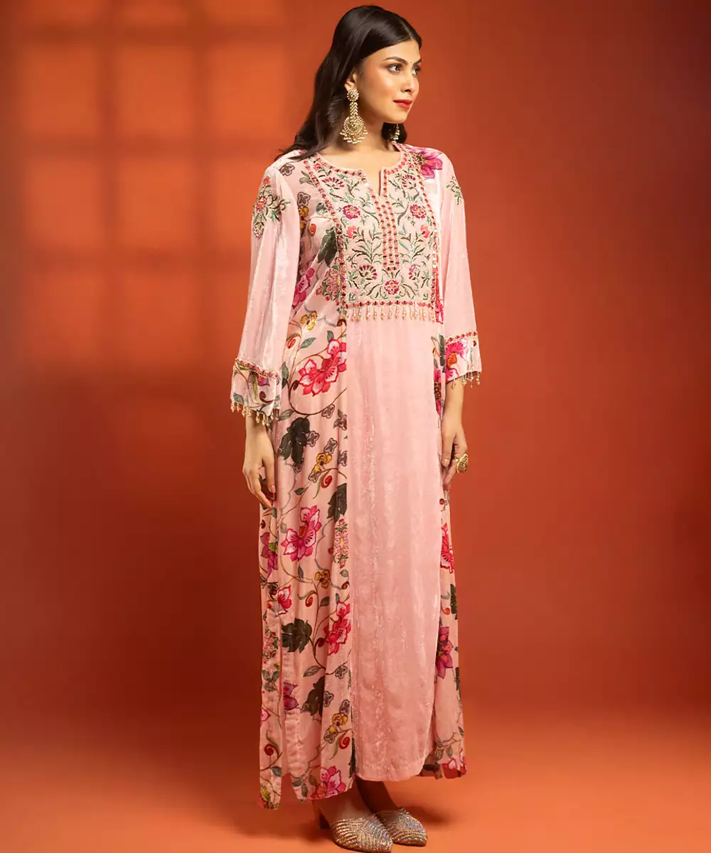 Featuring A Pink Printed Side Panel Long Kurta With Front Embroidery, Paired With A Lycra Churidar.