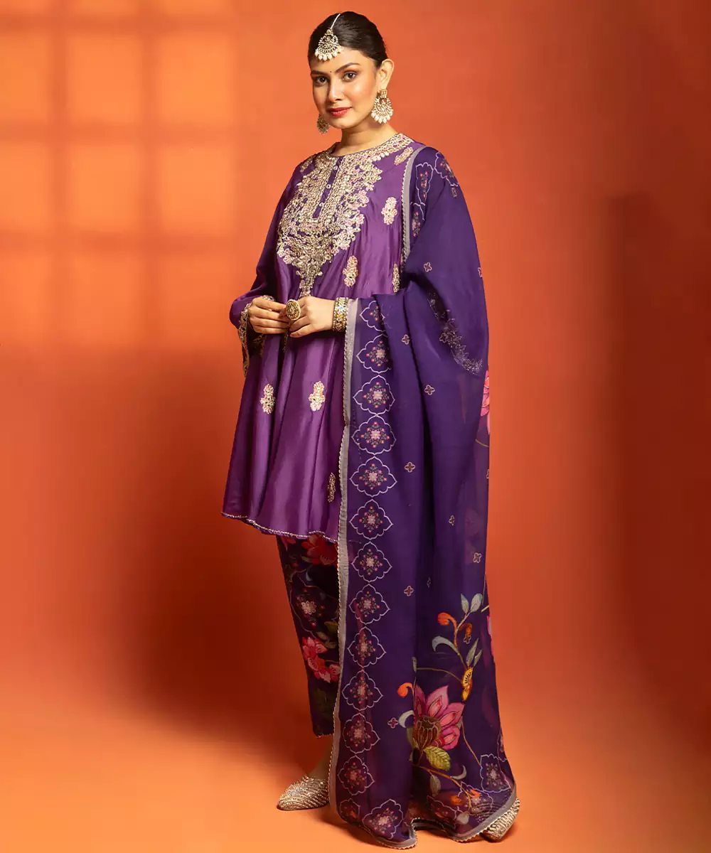 Featuring A Red Semi Anarkali Cotton Silk Kurta With A Heavily Embroidered Neckline, Paired With Floral Printed Cotton Silk Pants And A Delicate Organza Dupatta. Color: Purple Fabric: Cotton Silk Components: 1 Kurta / 1 Pant / 1 Dupatta