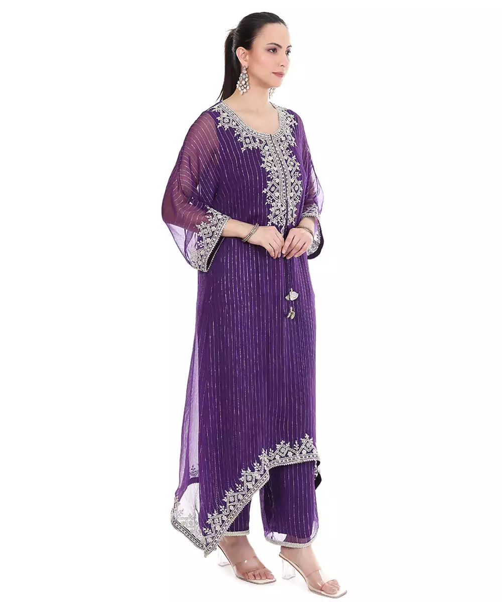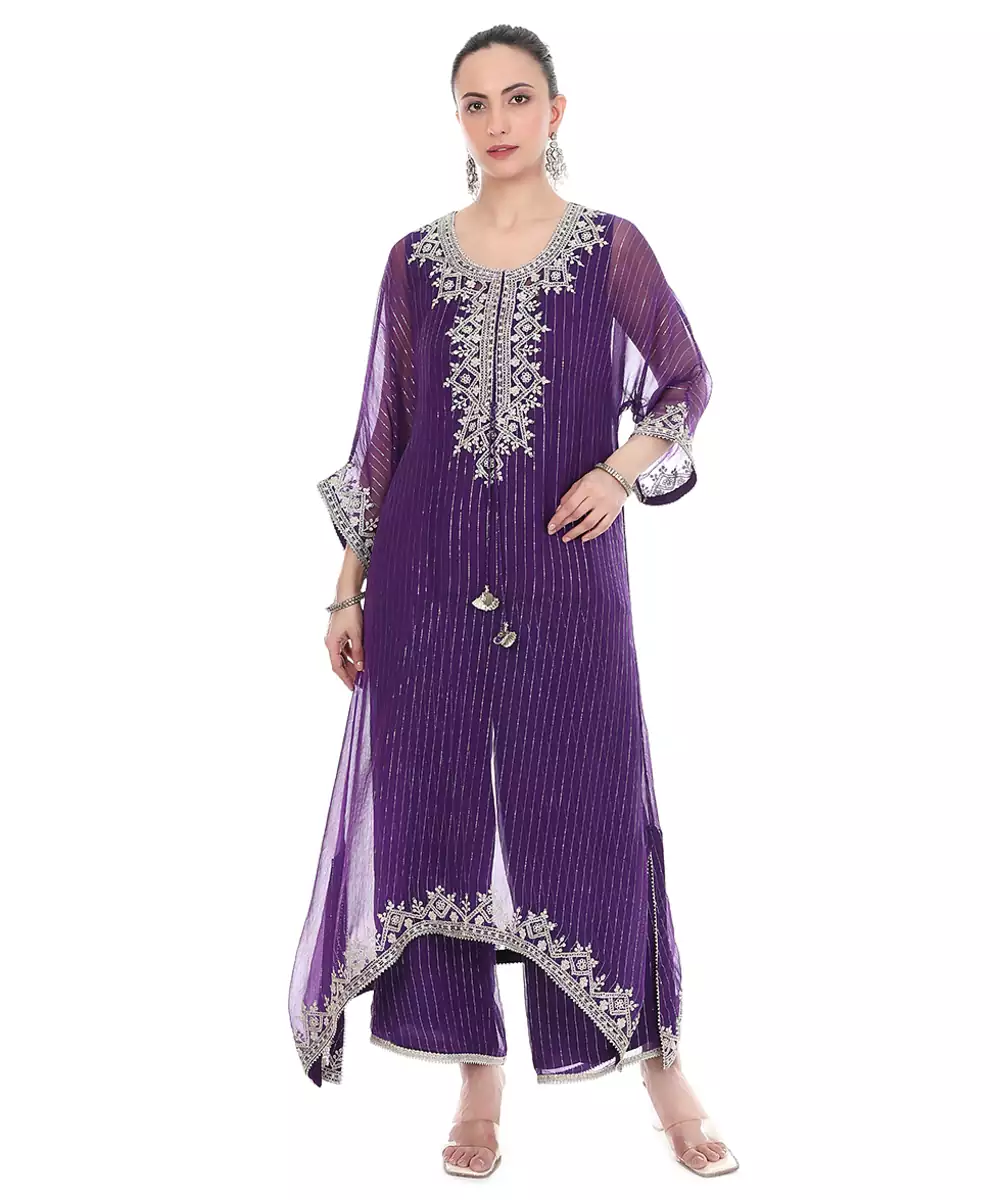 Rich And Elegant, This Purple Embroidered Lurex Kaftan Features A Luminous Finish With Detailed Craftsmanship. The Flowy Design Ensures Ease Of Movement, Making It Ideal For Festive Occasions. A Stylish Piece That Blends Comfort With A Sophisticated And Glamorous Appeal Effortlessly.