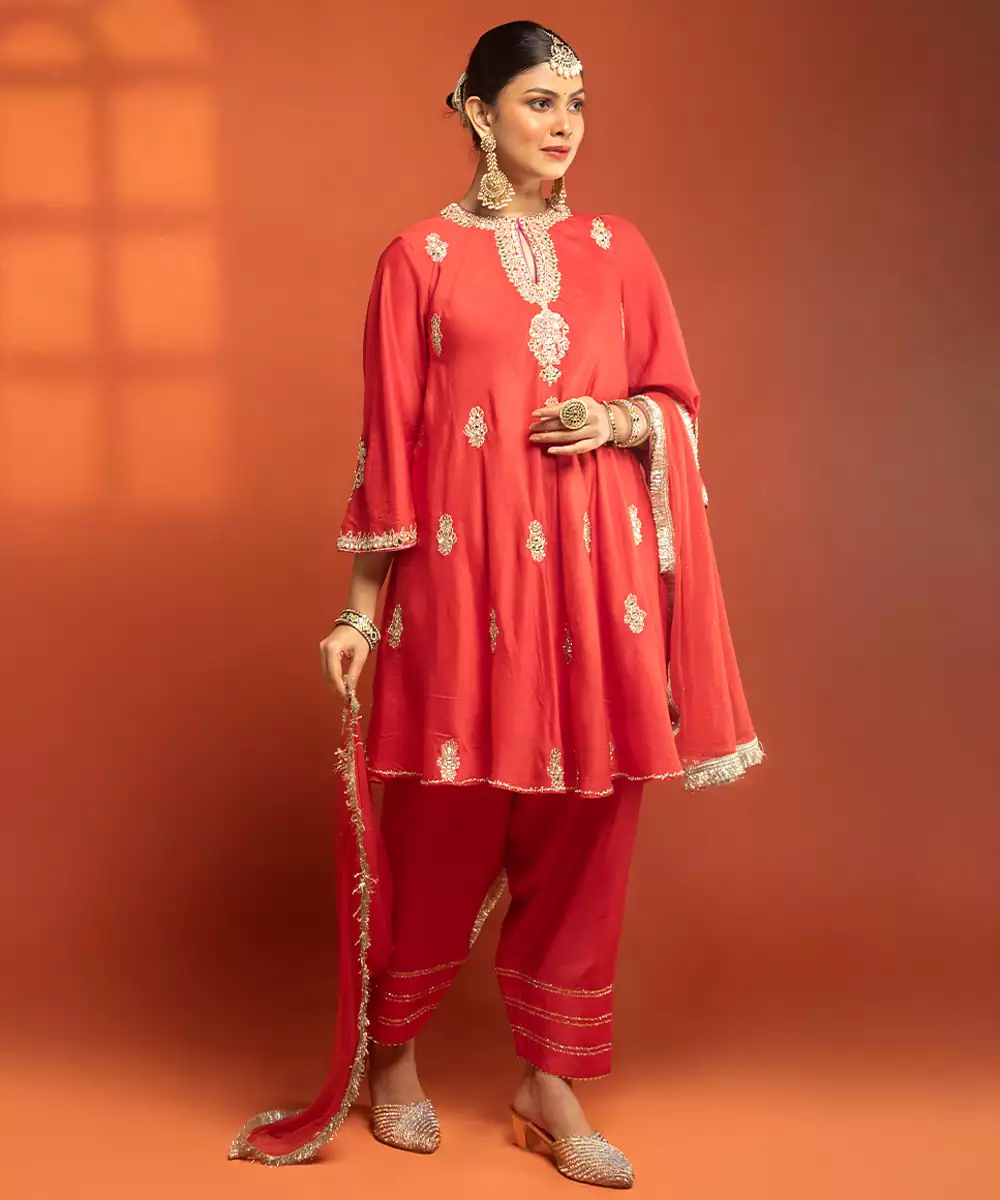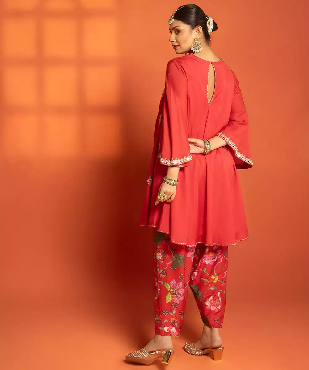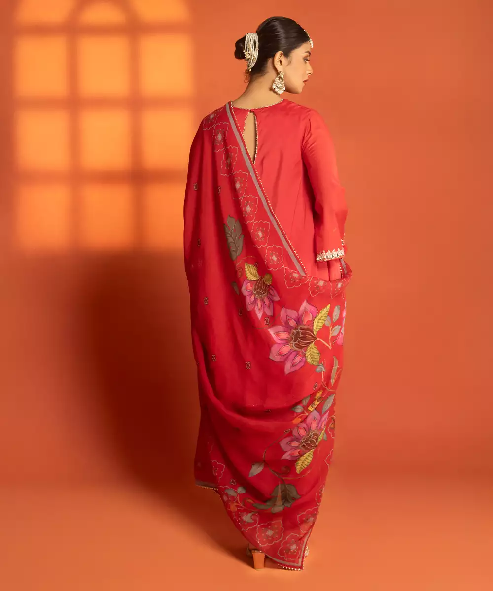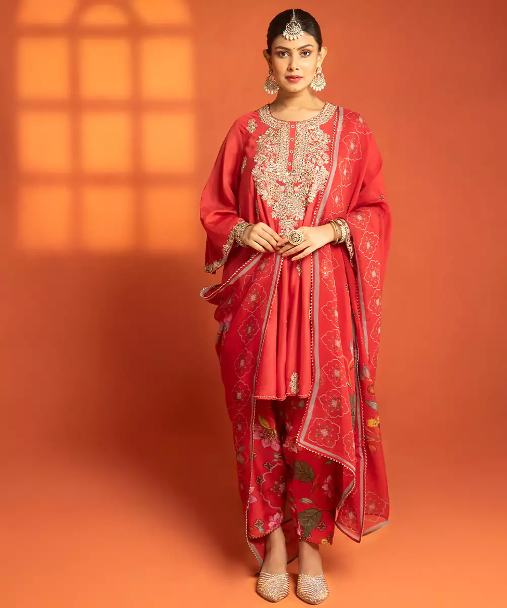 Featuring A Red Semi Anarkali Cotton Silk Kurta With A Heavily Embroidered Neckline, Paired With Floral Printed Cotton Silk Pants And A Delicate Organza Dupatta.