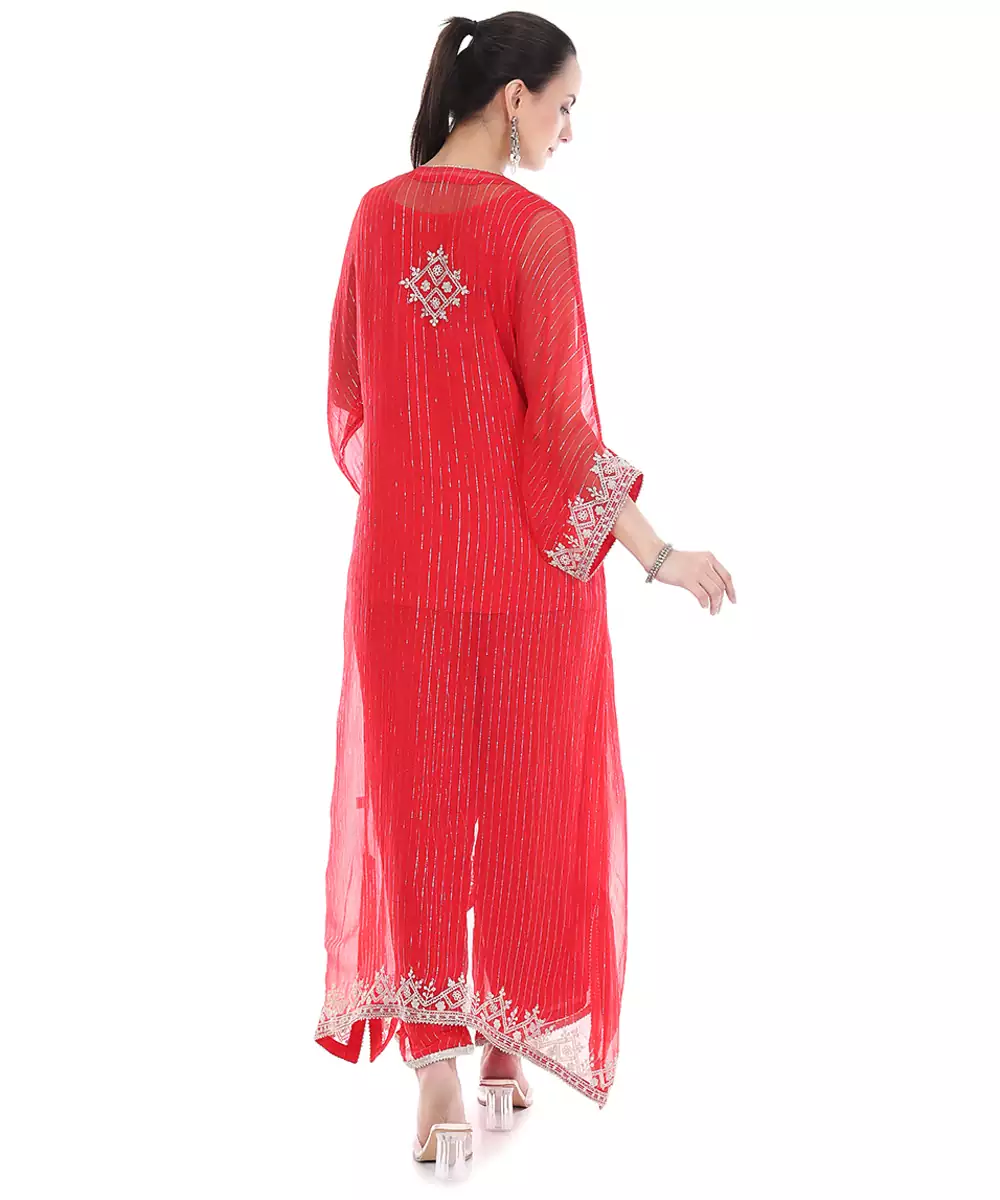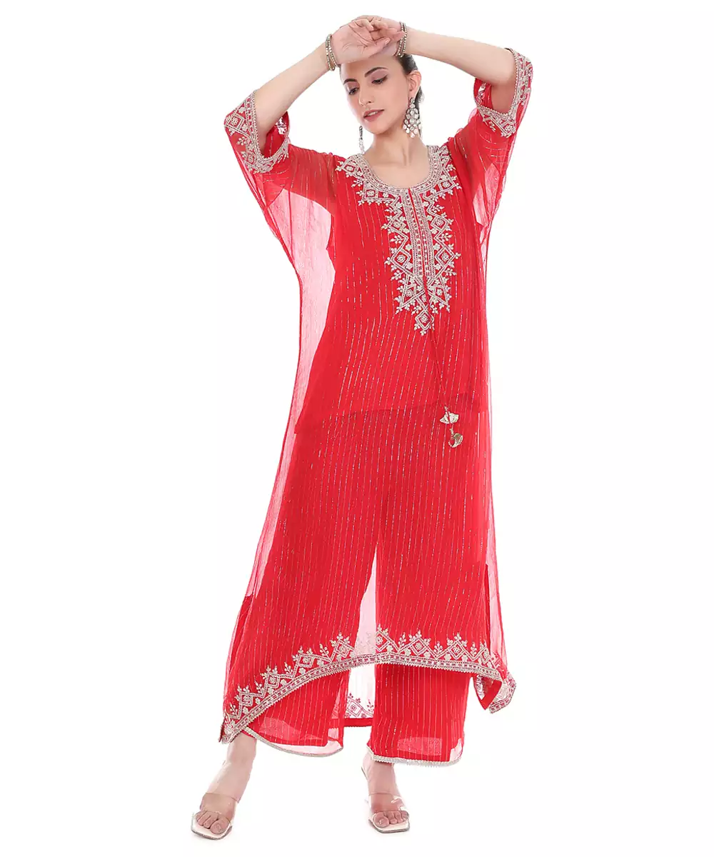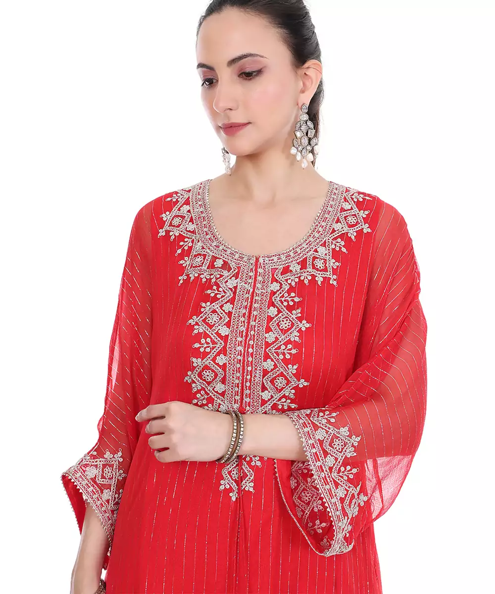 Bold And Festive, This Red Embroidered Lurex Kaftan Showcases A Shimmering Texture With Intricate Detailing. The Relaxed Silhouette Enhances Comfort, While The Vibrant Color Adds Charm. Perfect For Celebrations, It Offers A Striking And Elegant Look With A Touch Of Modern Glamour.