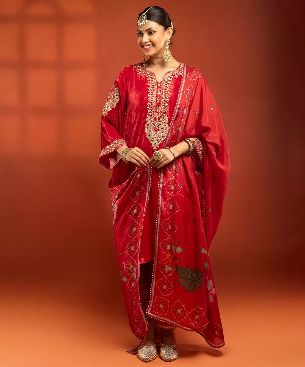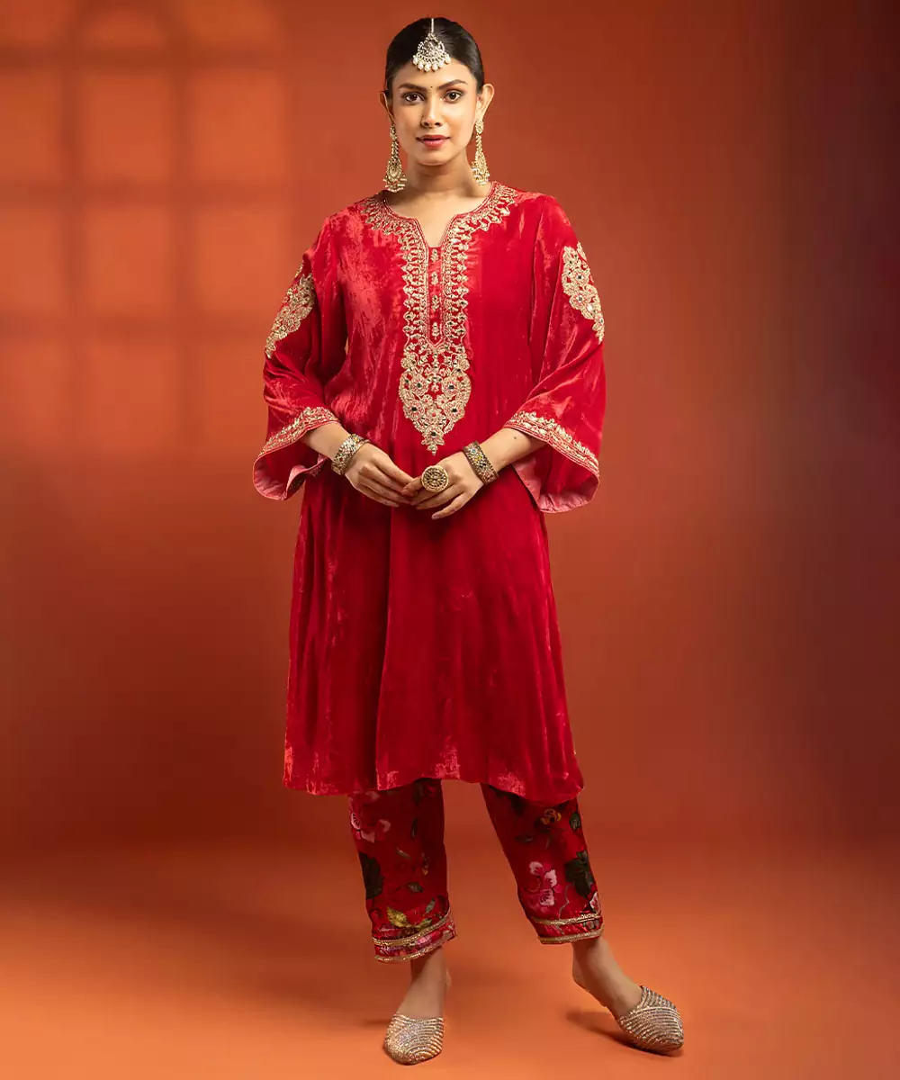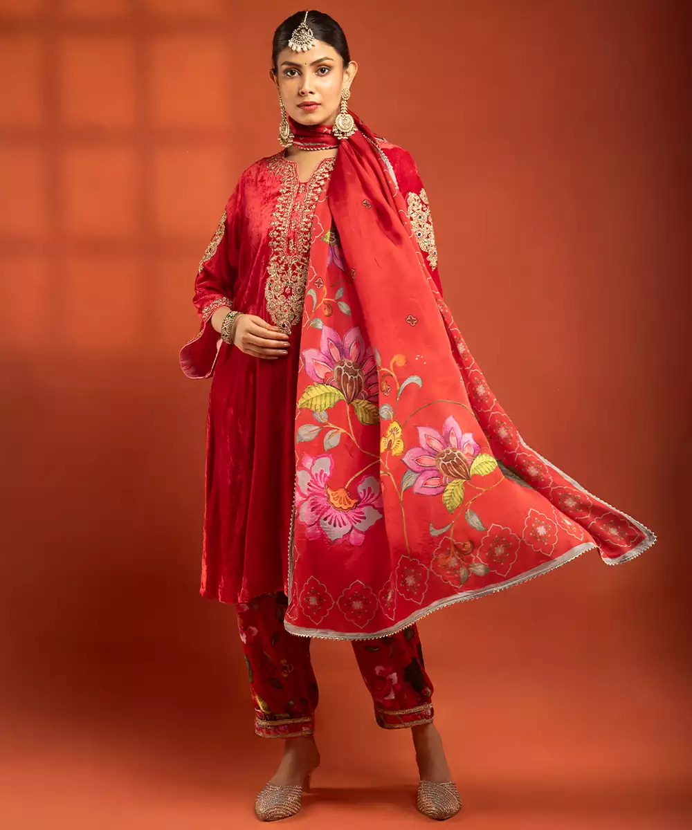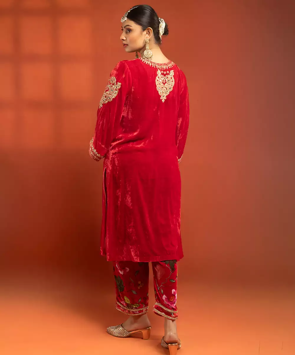Red Silk Velvet Kurta Paired With Printed Silk Velvet Salwar Pants And A Tabby Silk Dupatta. Color: Red Fabric: Silk Components: 1 Kurta / 1 Pant / 1 Dupatta