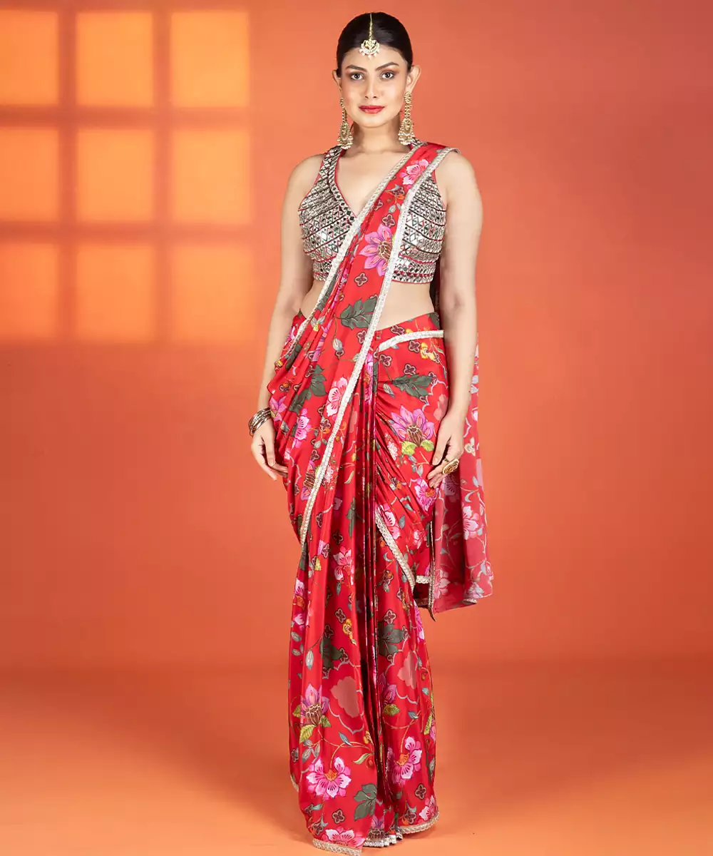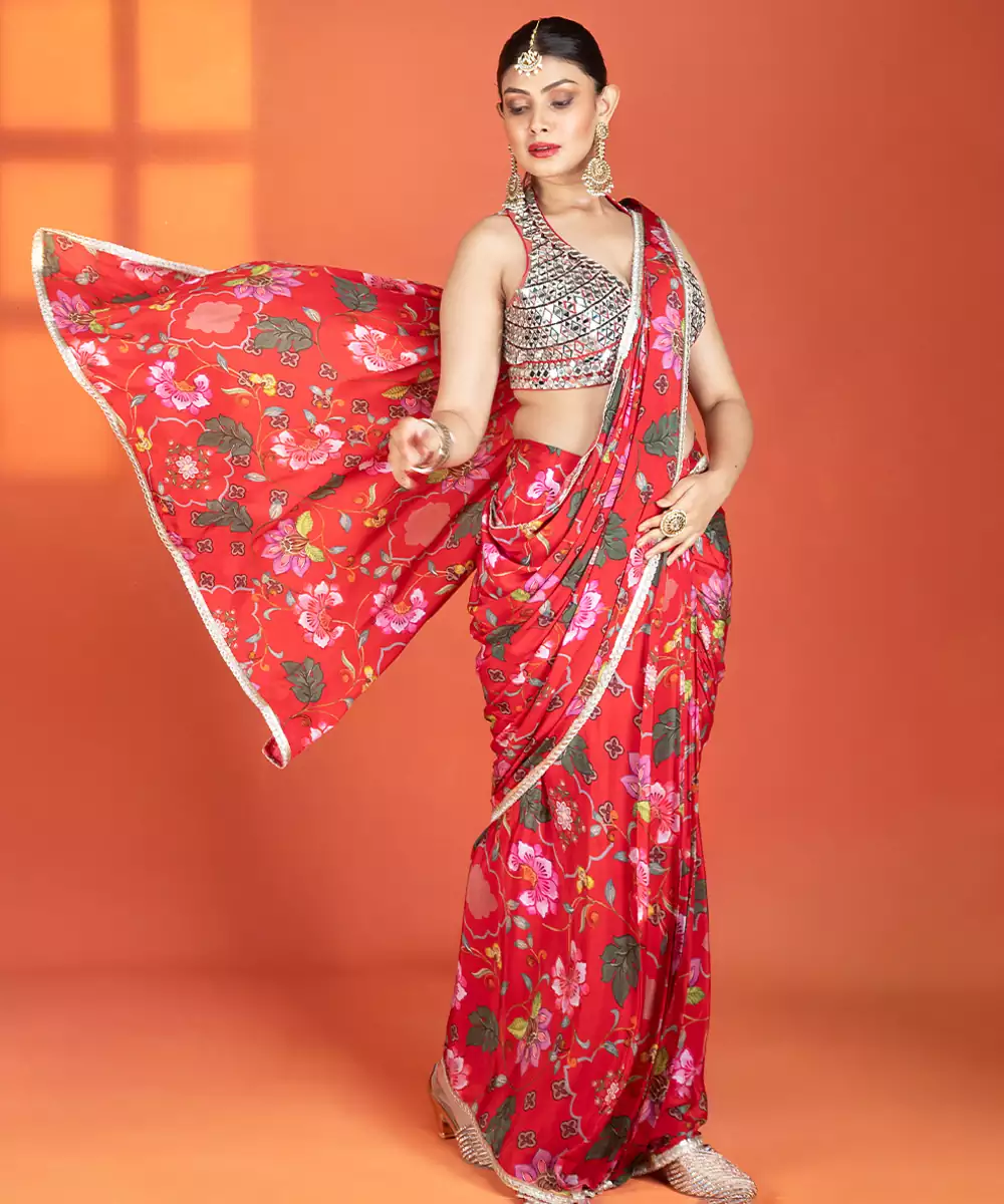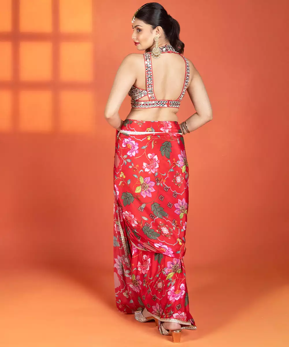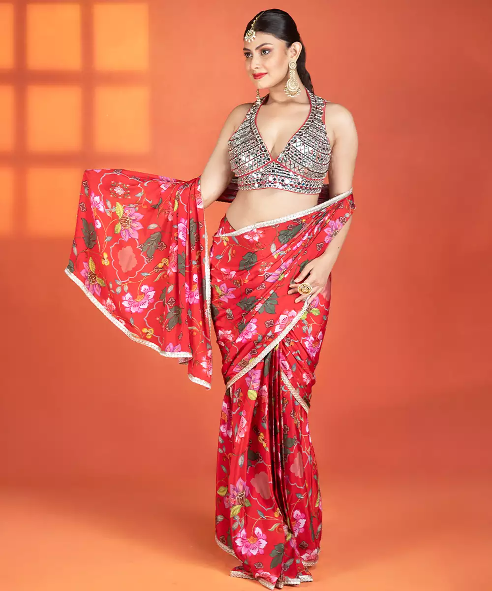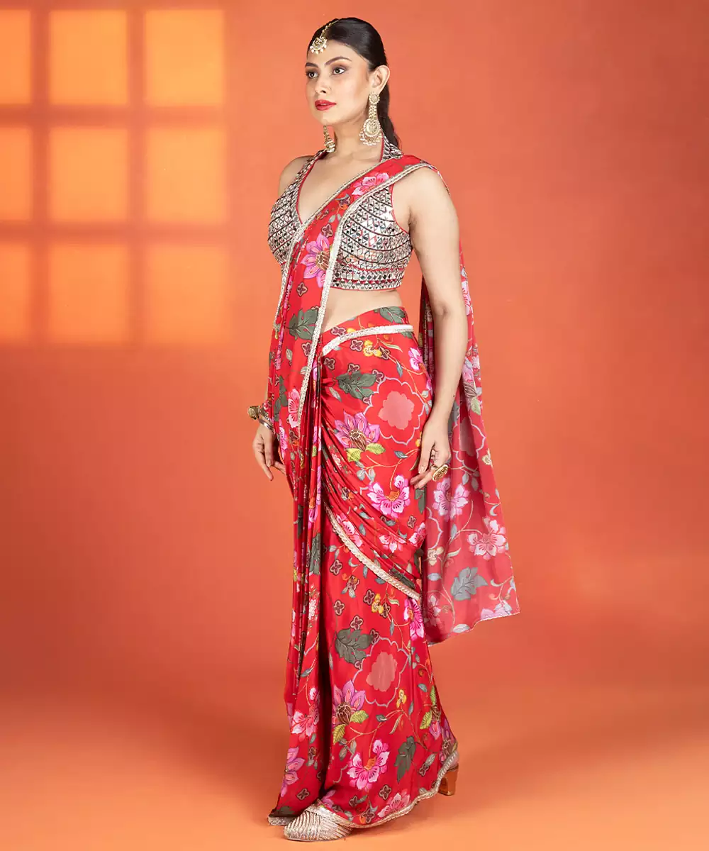 Featuring A Red Floral Printed Crepe Drape Saree Paired With A Heavy Mirror Work Net Blouse. Color: Red Fabric: Crepe Components: 1 Saree / 1 Blouse