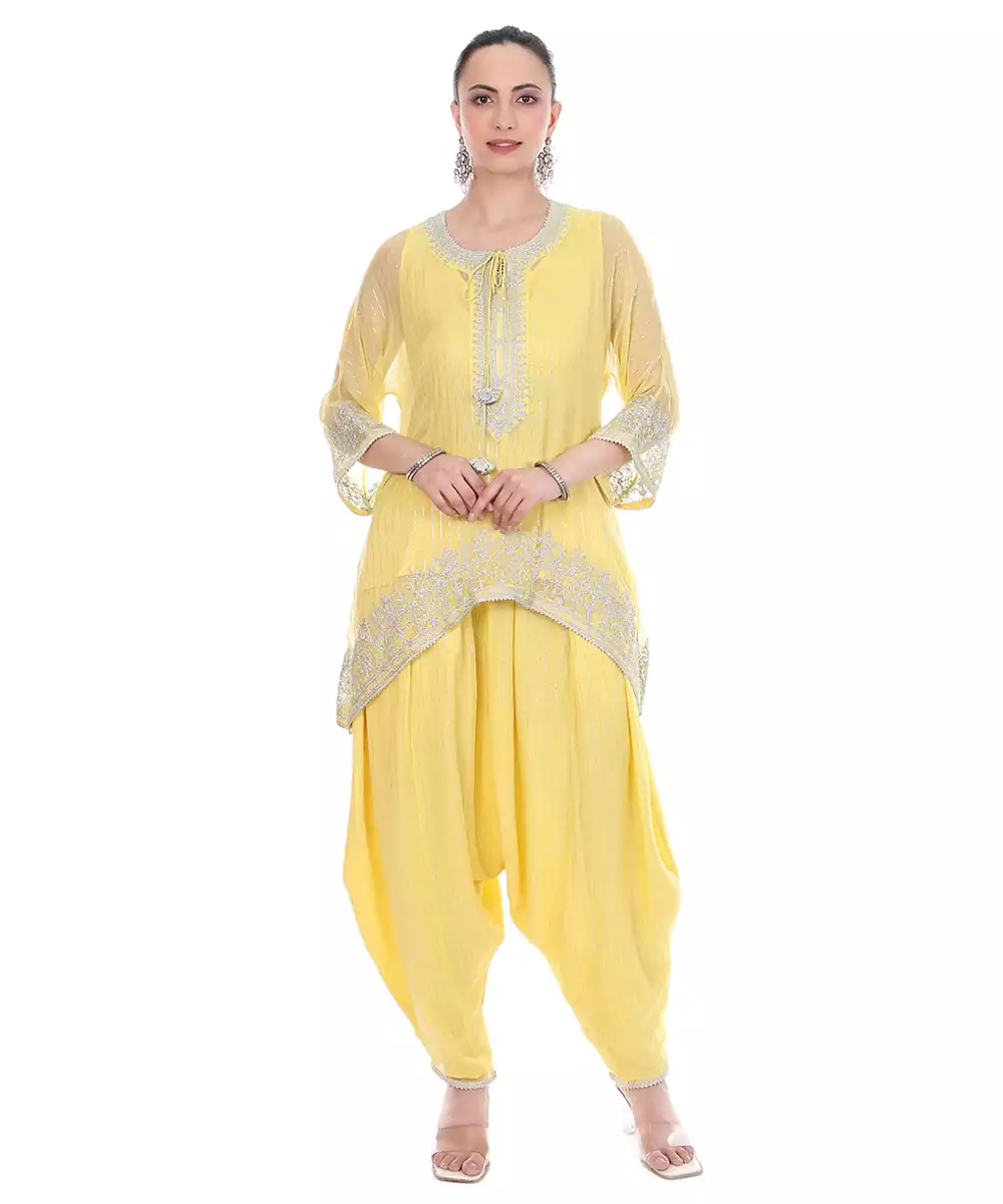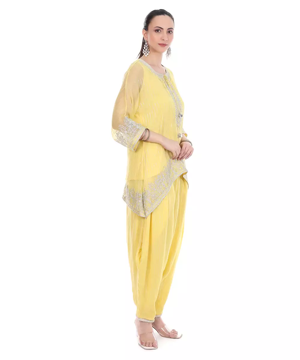 Yellow Embroidered High Low Kaftaan With Heram Pants