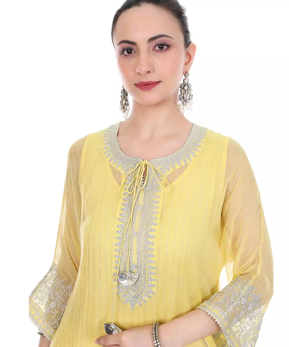 Bright And Radiant, This Yellow Embroidered Lurex Kaftan Showcases A Shimmering Finish With Elegant Detailing. The Lightweight, Flowy Design Ensures Comfort While Adding A Festive Charm. Ideal For Celebrations And Evening Gatherings, It Offers A Vibrant And Stylish Look With Effortless Grace.