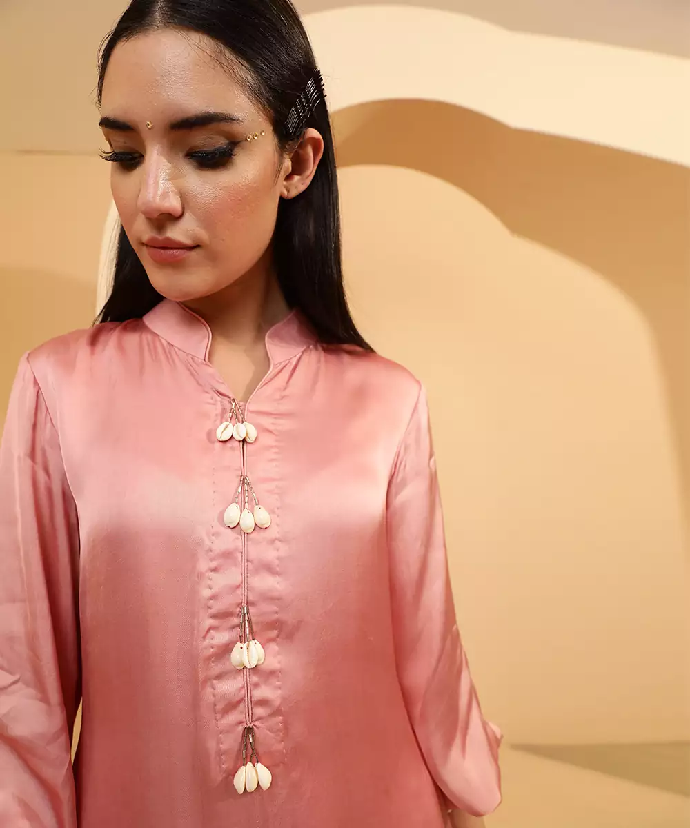 Our Lush Satin Kurta Paired With A Dhoti Is An Easy Breezy Outfit To Dress Up Or Down This Festive Season! The Whimsical Look Is Completed With Shell Hangings.