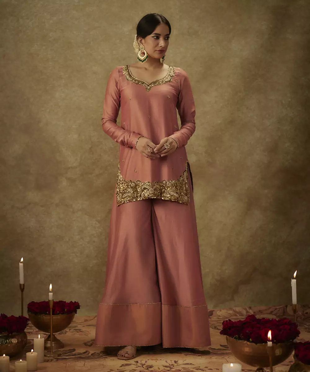 Unveil Timeless Elegance With Our Hand Woven Chanderi Sharara Set In Soft Blush Pink, Featuring Detailed Zardozi Embroidery Along The Kurta Hem. Paired With An Organza Dupatta, This Design Beautifully Balances Traditional Craftsmanship With Contemporary Style.