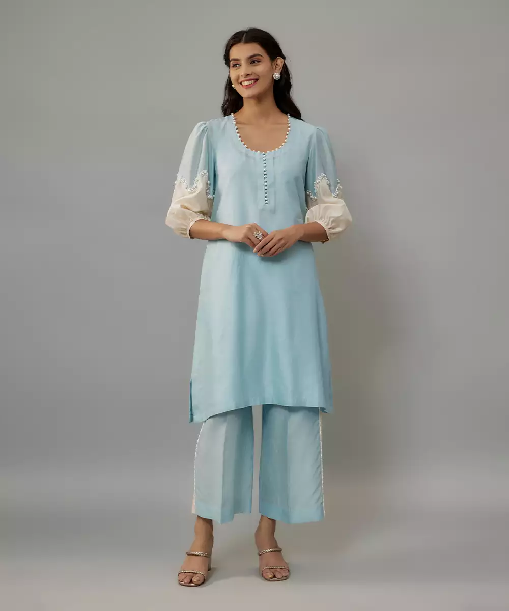 Introducing Powder Blue Handwoven Chanderi Co Ord Set, Meticulously Adorned With Pearl Embroidery Gracing The Sleeves And Intricate Detailing Enhancing The Neckline Paired With Palazzo
