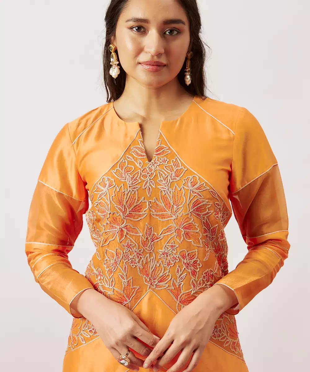 Step Into Elegance With Our Radiant Orange Handwoven Chanderi And Zari Organza Panel Suit Set. This Exquisite Ensemble Features Intricate Hand Embroidery, Adorned With Delicate Zari Dori And Cutdana Detailing. Paired With Sleek Cigarette Pants And A Flowing Organza Dupatta.