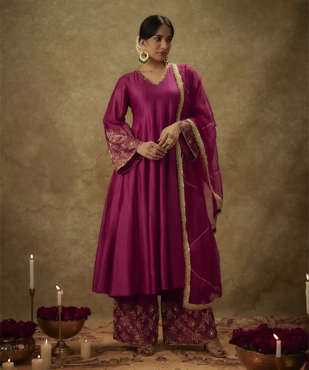 Our Handwoven Chanderi Semi Anarkali Set, Crafted In A Rich Magenta Hue, Is Beautifully Adorned With Zari Organza And Detailed Zardozi Work On The Sleeves And Pants. Paired With Palazzo Pants And An Organza Dupatta, It Creates An Effortlessly Elegant Look For Any Special Event.