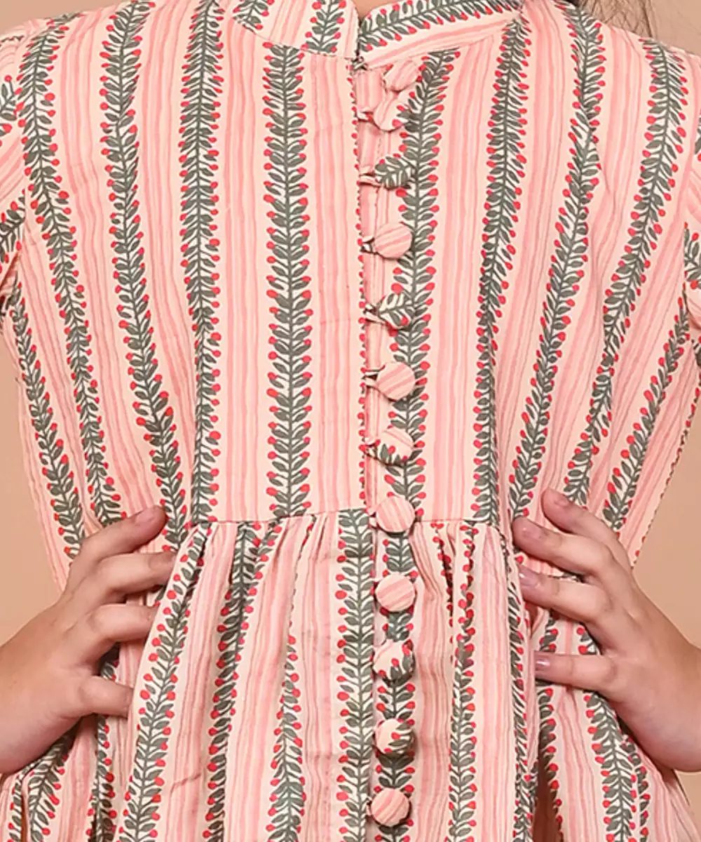 This Set Features A Cape With Pants. Printed Peach Cape Has The Front Slit Below The Torso And Crochet Flower Embroidery On The Sleeves. It Comes Along With Solid Cotton Red Pants .