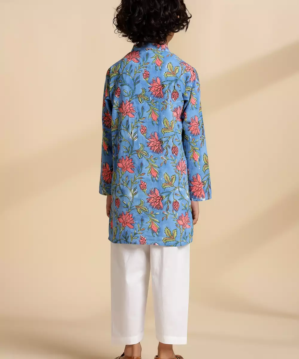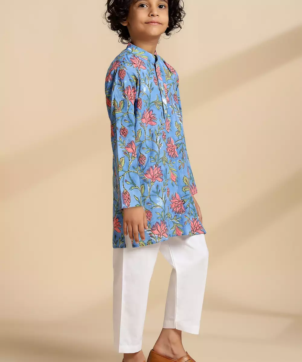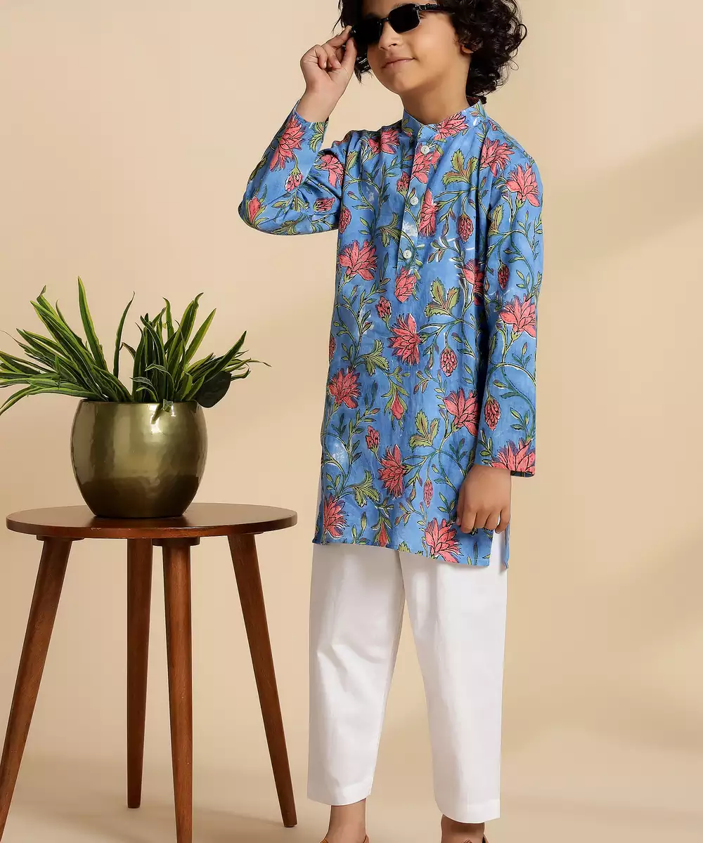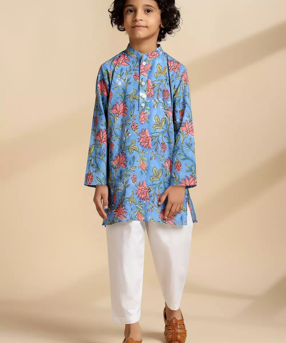 This Blue Printed Cotton Kurta Set Radiates Cheerful Elegance With Its Lively Patterns And Breathable, Soft Fabric. The Lightweight Cotton Ensures All Day Comfort, While The Vibrant Prints Add A Festive, Contemporary Charm. Perfect For Daytime Events, Celebrations, And Casual Gatherings, It Blends Effortless Style With Modern Ethnic Appeal.
