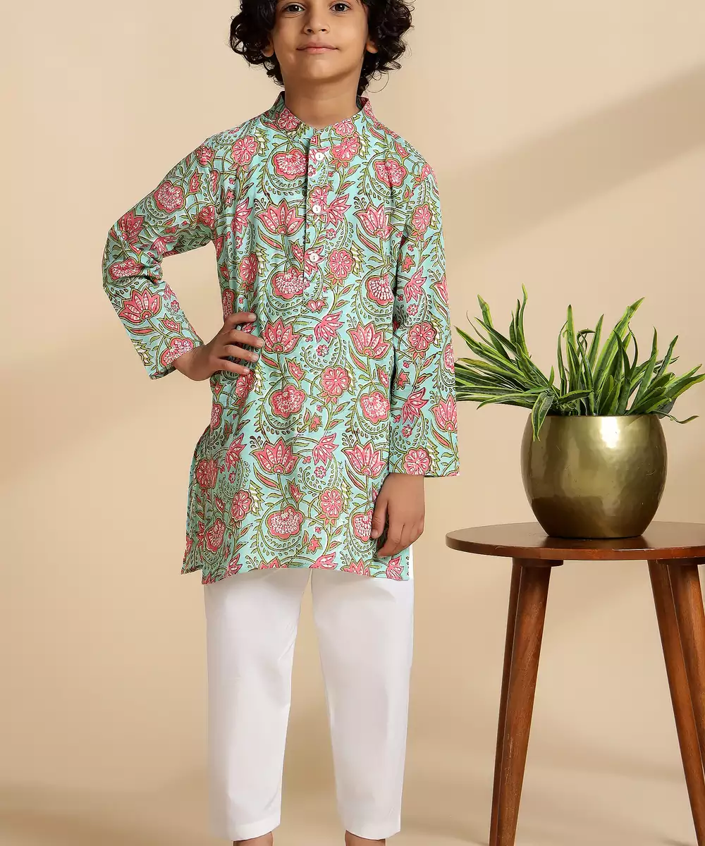 This Green Printed Cotton Kurta Set Radiates Cheerful Elegance With Its Lively Patterns And Breathable, Soft Fabric. The Lightweight Cotton Ensures All Day Comfort, While The Vibrant Prints Add A Festive, Contemporary Charm. Perfect For Daytime Events, Celebrations, And Casual Gatherings, It Blends Effortless Style With Modern Ethnic Appeal.