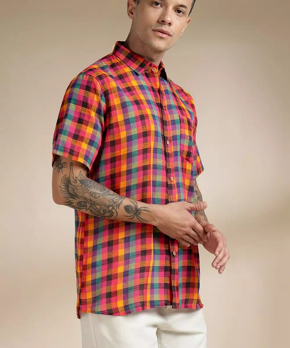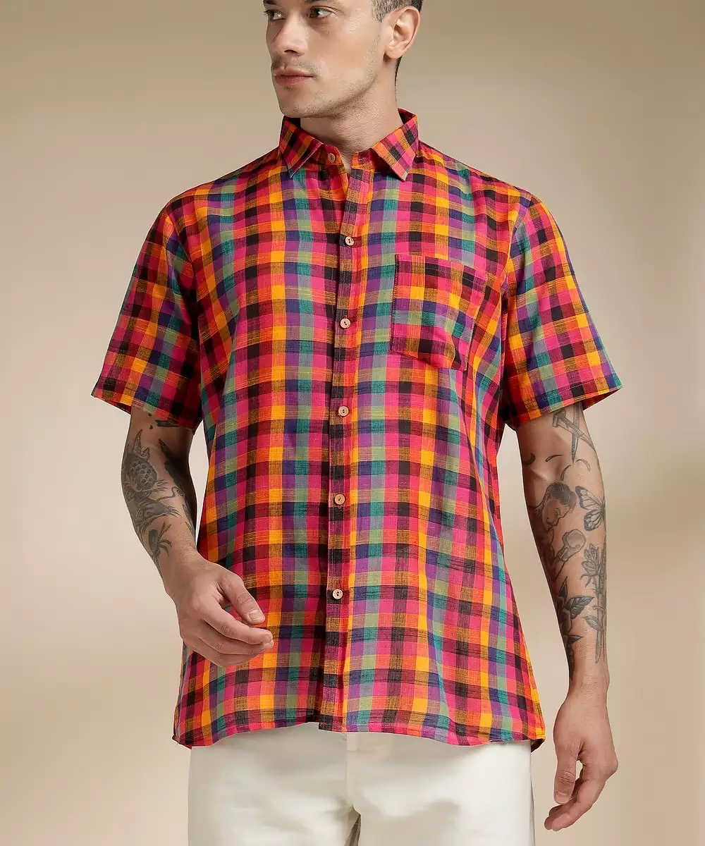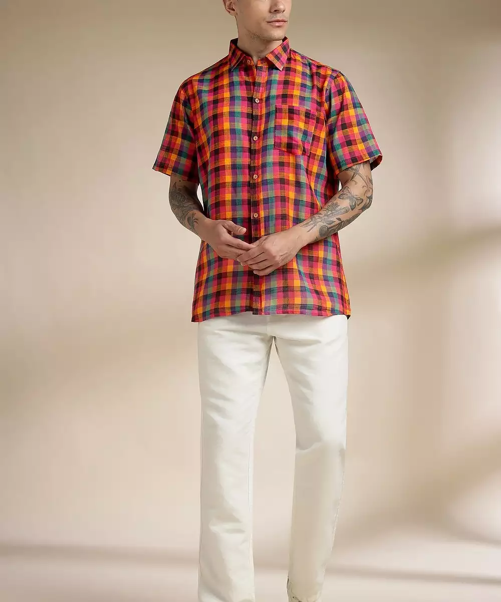 Featuring A Multicolor South Cotton Checkered Shirt With Front Pocket And Front Buttons.