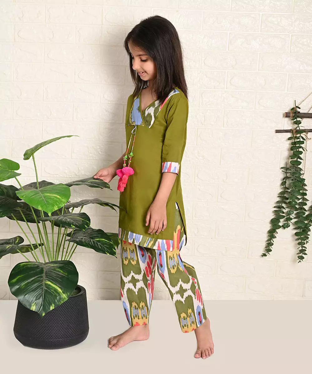 Featuring A Kurta With Pant And Dupatta Set. The Straight Kurta Has Overlap Neckline With Handmade False Tassel In The Front. It Comes Along With Ikat Print Straight Pants With Stylized Paneled Dupatta.