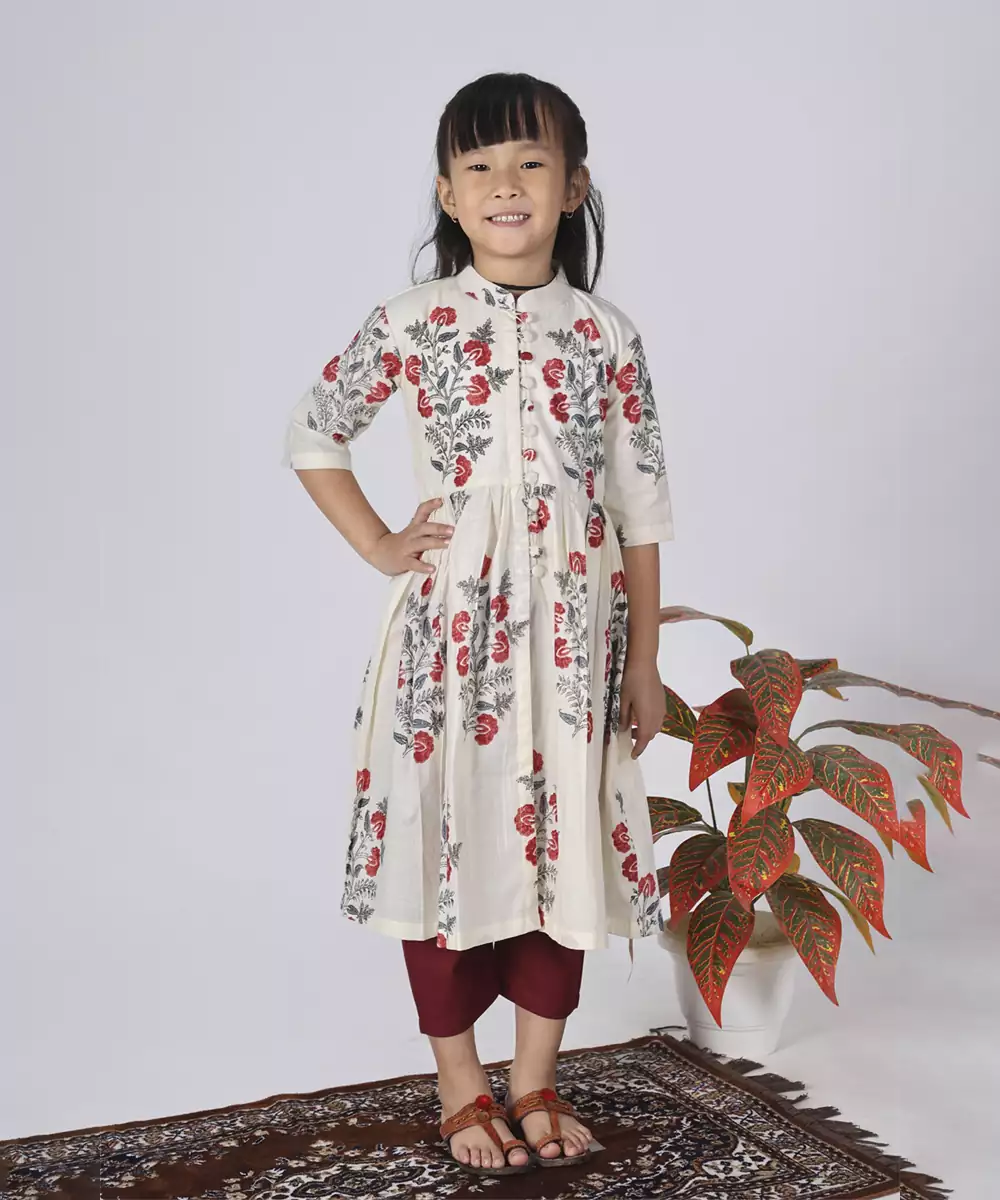 Featuring A Floral Printed White Cape With Buttons In The Front. It Is A Torso Lined Cape With Quarter Sleeves. It Comes Along With Maroon Straight Cotton Pants.