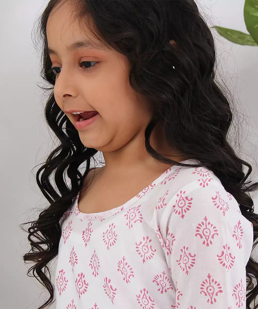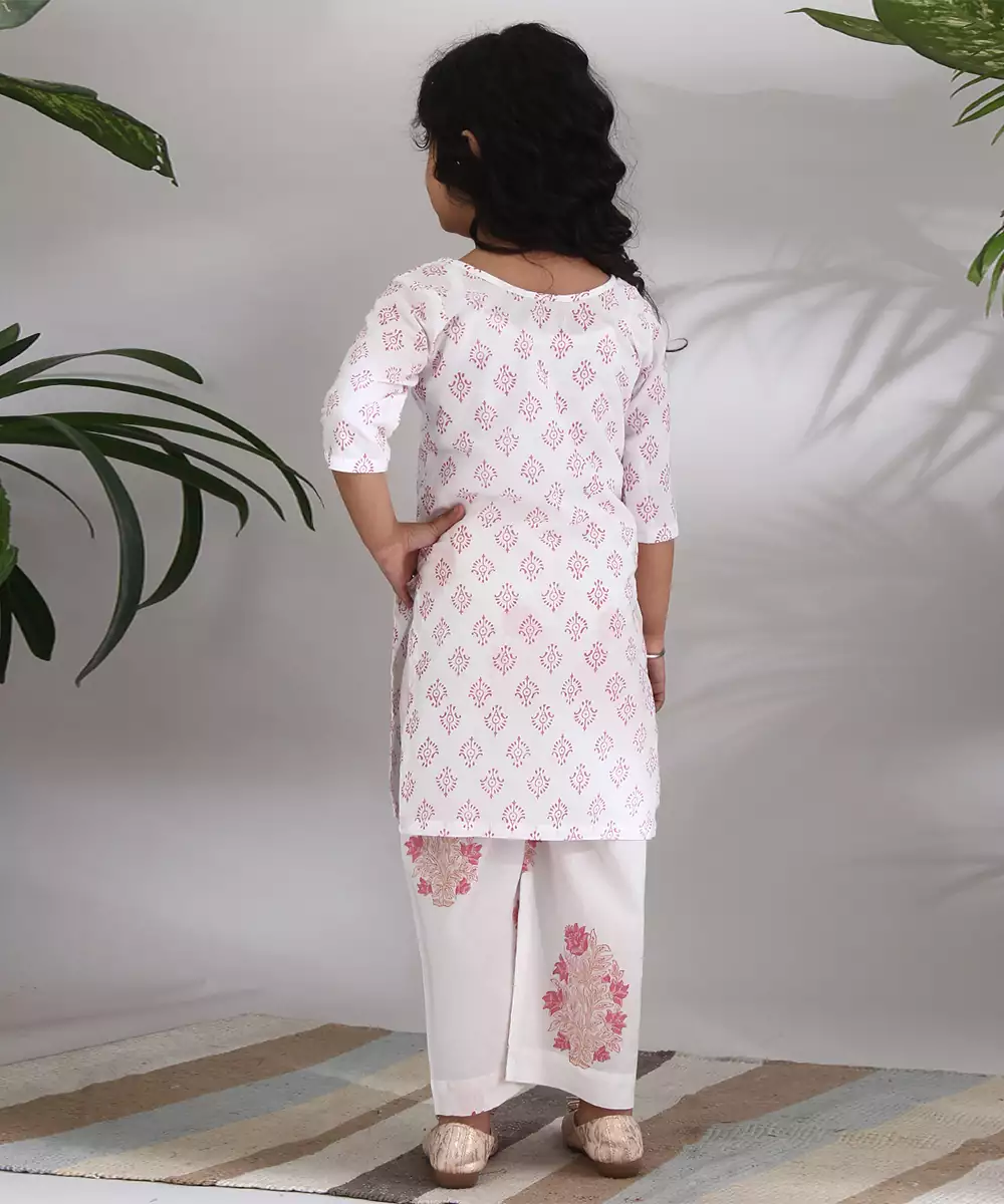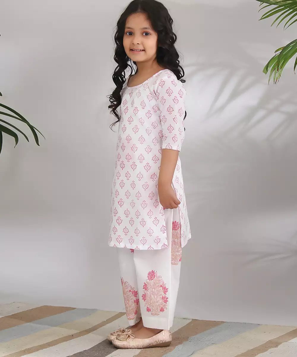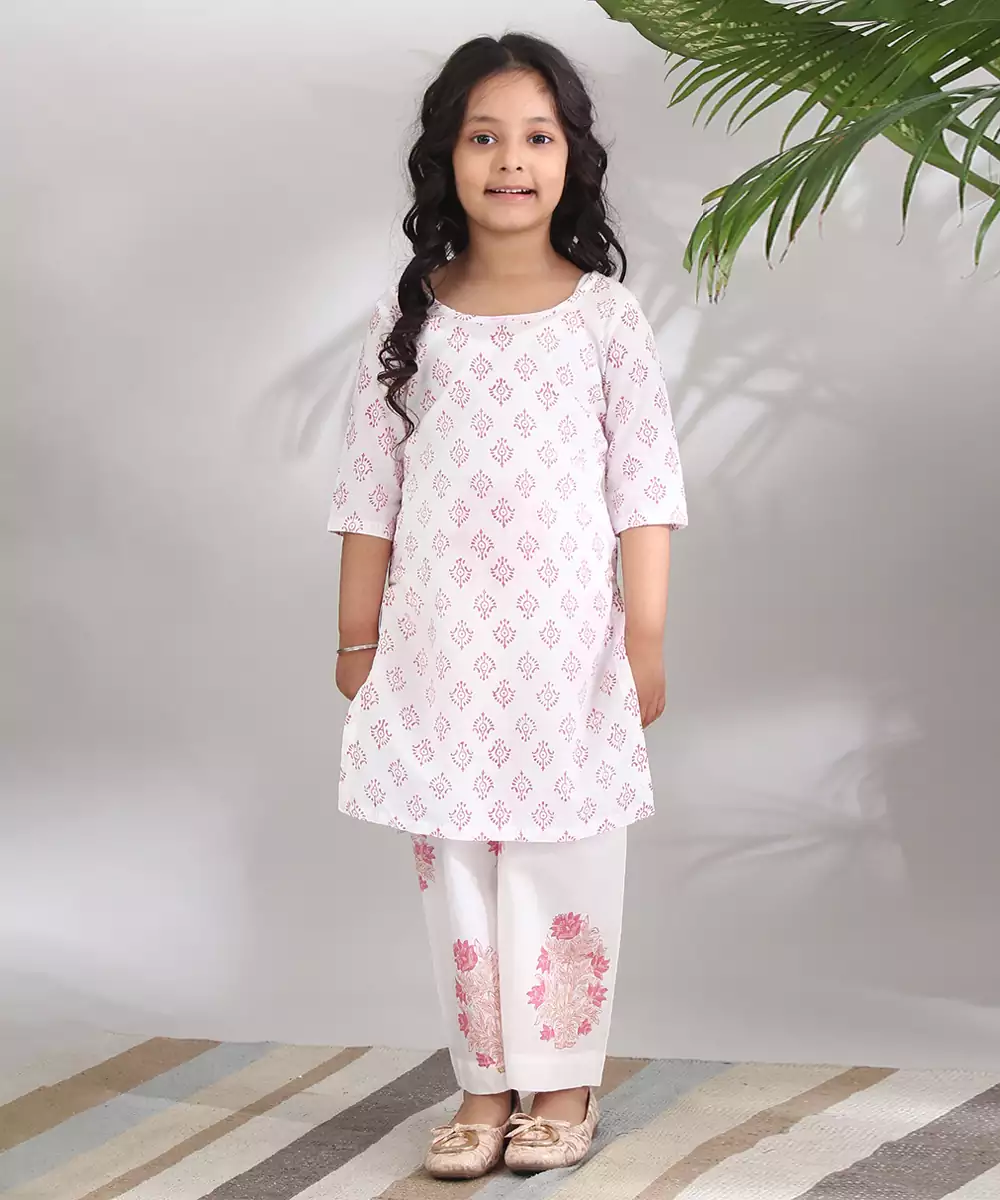 This Set Features A Kurta With Pants. The Cotton Hand Block Printed Kurta Has Round Neckline And Quarter Sleeves. It Comes Along With Big Boota Hand Block Printed Cotton Complete Elasticated Pants.
