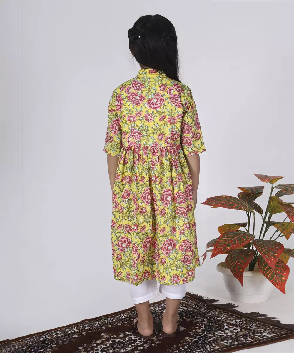 Featuring A Floral Printed Yellow Cape With Buttons In The Front. It Is A Torso Lined Cape With Quarter Sleeves. It Comes Along With White Straight Cotton Pants.