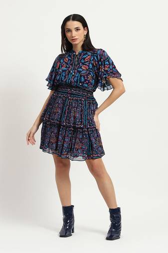Blue Floral Off Shoulder Shirt Dress With Pockets Belt Components : 1 Dress Fabrics: Cotton Colour: Blue