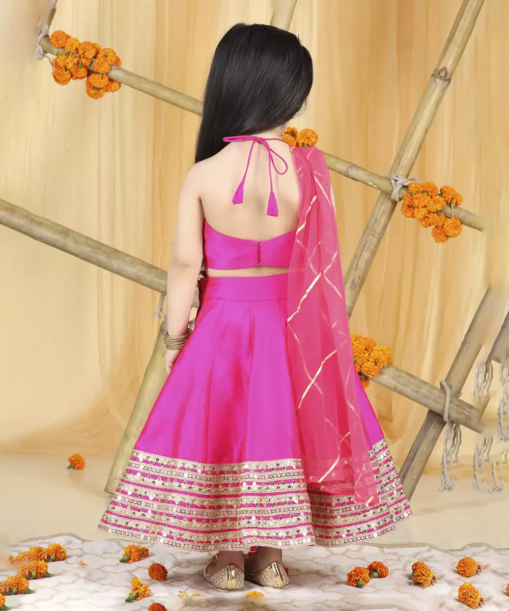 Pink Blouse With Hand Embroidery And Lehanga With Gotta Patti Borders Colour: Pink Fabric: Silk Blend Components : 1 Lehenga / 1 Blouse / 1 Dupatta